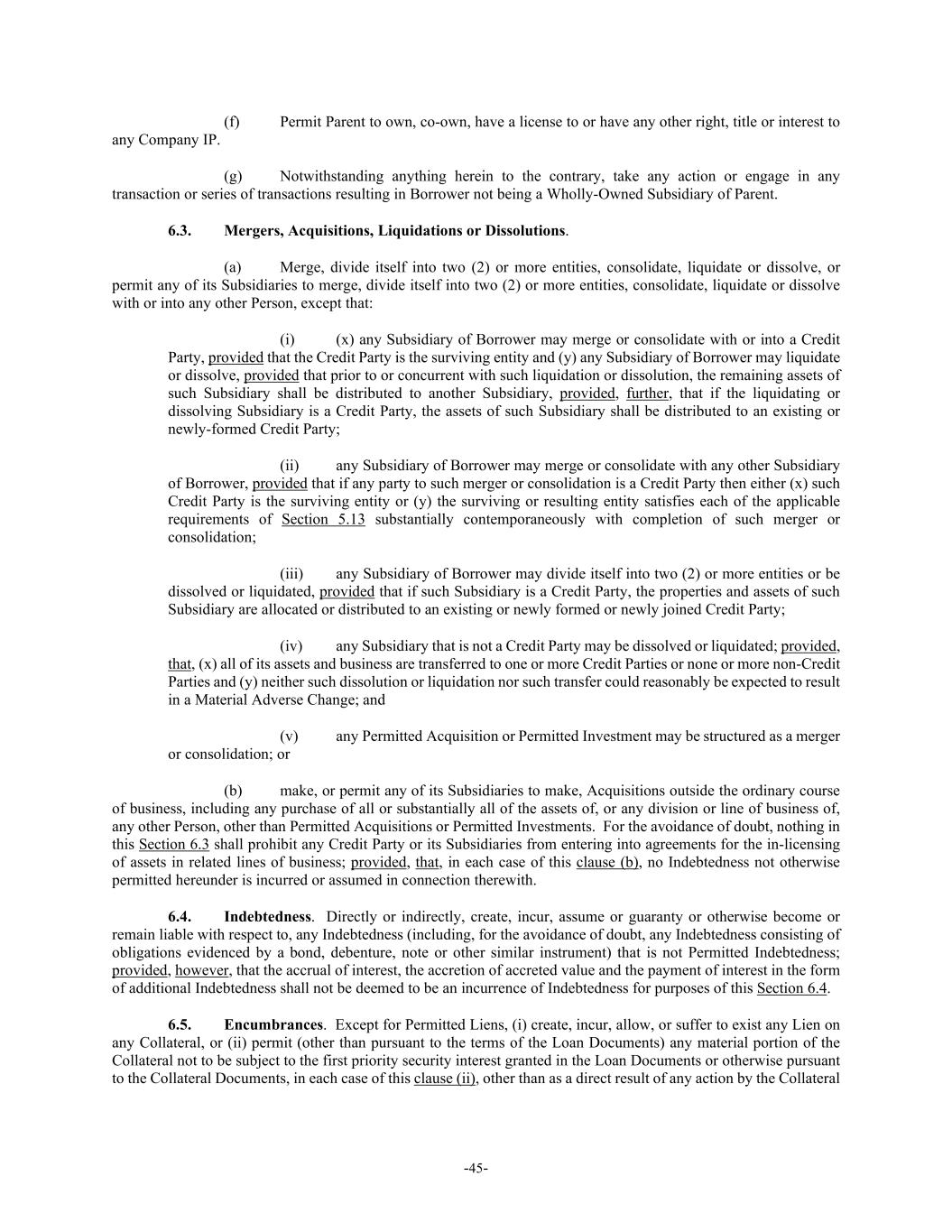 -45- (f) Permit Parent to own, co-own, have a license to or have any other right, title or interest to any Company IP. (g) Notwithstanding anything herein to the contrary, take any action or engage in any transaction or series of transactions resulting in Borrower not being a Wholly-Owned Subsidiary of Parent. 6.3. Mergers, Acquisitions, Liquidations or Dissolutions. (a) Merge, divide itself into two (2) or more entities, consolidate, liquidate or dissolve, or permit any of its Subsidiaries to merge, divide itself into two (2) or more entities, consolidate, liquidate or dissolve with or into any other Person, except that: (i) (x) any Subsidiary of Borrower may merge or consolidate with or into a Credit Party, provided that the Credit Party is the surviving entity and (y) any Subsidiary of Borrower may liquidate or dissolve, provided that prior to or concurrent with such liquidation or dissolution, the remaining assets of such Subsidiary shall be distributed to another Subsidiary, provided, further, that if the liquidating or dissolving Subsidiary is a Credit Party, the assets of such Subsidiary shall be distributed to an existing or newly-formed Credit Party; (ii) any Subsidiary of Borrower may merge or consolidate with any other Subsidiary of Borrower, provided that if any party to such merger or consolidation is a Credit Party then either (x) such Credit Party is the surviving entity or (y) the surviving or resulting entity satisfies each of the applicable requirements of Section 5.13 substantially contemporaneously with completion of such merger or consolidation; (iii) any Subsidiary of Borrower may divide itself into two (2) or more entities or be dissolved or liquidated, provided that if such Subsidiary is a Credit Party, the properties and assets of such Subsidiary are allocated or distributed to an existing or newly formed or newly joined Credit Party; (iv) any Subsidiary that is not a Credit Party may be dissolved or liquidated; provided, that, (x) all of its assets and business are transferred to one or more Credit Parties or none or more non-Credit Parties and (y) neither such dissolution or liquidation nor such transfer could reasonably be expected to result in a Material Adverse Change; and (v) any Permitted Acquisition or Permitted Investment may be structured as a merger or consolidation; or (b) make, or permit any of its Subsidiaries to make, Acquisitions outside the ordinary course of business, including any purchase of all or substantially all of the assets of, or any division or line of business of, any other Person, other than Permitted Acquisitions or Permitted Investments. For the avoidance of doubt, nothing in this Section 6.3 shall prohibit any Credit Party or its Subsidiaries from entering into agreements for the in-licensing of assets in related lines of business; provided, that, in each case of this clause (b), no Indebtedness not otherwise permitted hereunder is incurred or assumed in connection therewith. 6.4. Indebtedness. Directly or indirectly, create, incur, assume or guaranty or otherwise become or remain liable with respect to, any Indebtedness (including, for the avoidance of doubt, any Indebtedness consisting of obligations evidenced by a bond, debenture, note or other similar instrument) that is not Permitted Indebtedness; provided, however, that the accrual of interest, the accretion of accreted value and the payment of interest in the form of additional Indebtedness shall not be deemed to be an incurrence of Indebtedness for purposes of this Section 6.4. 6.5. Encumbrances. Except for Permitted Liens, (i) create, incur, allow, or suffer to exist any Lien on any Collateral, or (ii) permit (other than pursuant to the terms of the Loan Documents) any material portion of the Collateral not to be subject to the first priority security interest granted in the Loan Documents or otherwise pursuant to the Collateral Documents, in each case of this clause (ii), other than as a direct result of any action by the Collateral