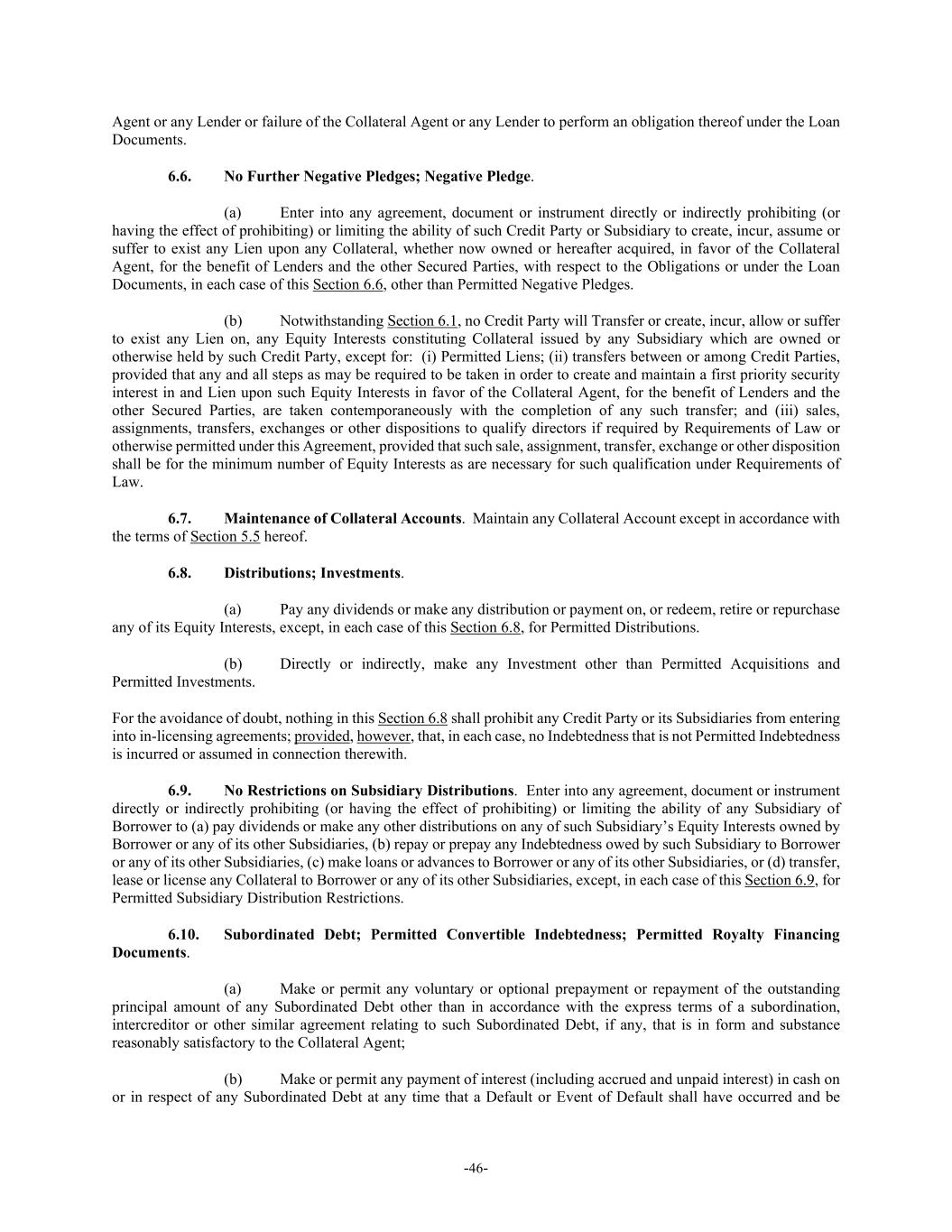 -46- Agent or any Lender or failure of the Collateral Agent or any Lender to perform an obligation thereof under the Loan Documents. 6.6. No Further Negative Pledges; Negative Pledge. (a) Enter into any agreement, document or instrument directly or indirectly prohibiting (or having the effect of prohibiting) or limiting the ability of such Credit Party or Subsidiary to create, incur, assume or suffer to exist any Lien upon any Collateral, whether now owned or hereafter acquired, in favor of the Collateral Agent, for the benefit of Lenders and the other Secured Parties, with respect to the Obligations or under the Loan Documents, in each case of this Section 6.6, other than Permitted Negative Pledges. (b) Notwithstanding Section 6.1, no Credit Party will Transfer or create, incur, allow or suffer to exist any Lien on, any Equity Interests constituting Collateral issued by any Subsidiary which are owned or otherwise held by such Credit Party, except for: (i) Permitted Liens; (ii) transfers between or among Credit Parties, provided that any and all steps as may be required to be taken in order to create and maintain a first priority security interest in and Lien upon such Equity Interests in favor of the Collateral Agent, for the benefit of Lenders and the other Secured Parties, are taken contemporaneously with the completion of any such transfer; and (iii) sales, assignments, transfers, exchanges or other dispositions to qualify directors if required by Requirements of Law or otherwise permitted under this Agreement, provided that such sale, assignment, transfer, exchange or other disposition shall be for the minimum number of Equity Interests as are necessary for such qualification under Requirements of Law. 6.7. Maintenance of Collateral Accounts. Maintain any Collateral Account except in accordance with the terms of Section 5.5 hereof. 6.8. Distributions; Investments. (a) Pay any dividends or make any distribution or payment on, or redeem, retire or repurchase any of its Equity Interests, except, in each case of this Section 6.8, for Permitted Distributions. (b) Directly or indirectly, make any Investment other than Permitted Acquisitions and Permitted Investments. For the avoidance of doubt, nothing in this Section 6.8 shall prohibit any Credit Party or its Subsidiaries from entering into in-licensing agreements; provided, however, that, in each case, no Indebtedness that is not Permitted Indebtedness is incurred or assumed in connection therewith. 6.9. No Restrictions on Subsidiary Distributions. Enter into any agreement, document or instrument directly or indirectly prohibiting (or having the effect of prohibiting) or limiting the ability of any Subsidiary of Borrower to (a) pay dividends or make any other distributions on any of such Subsidiary’s Equity Interests owned by Borrower or any of its other Subsidiaries, (b) repay or prepay any Indebtedness owed by such Subsidiary to Borrower or any of its other Subsidiaries, (c) make loans or advances to Borrower or any of its other Subsidiaries, or (d) transfer, lease or license any Collateral to Borrower or any of its other Subsidiaries, except, in each case of this Section 6.9, for Permitted Subsidiary Distribution Restrictions. 6.10. Subordinated Debt; Permitted Convertible Indebtedness; Permitted Royalty Financing Documents. (a) Make or permit any voluntary or optional prepayment or repayment of the outstanding principal amount of any Subordinated Debt other than in accordance with the express terms of a subordination, intercreditor or other similar agreement relating to such Subordinated Debt, if any, that is in form and substance reasonably satisfactory to the Collateral Agent; (b) Make or permit any payment of interest (including accrued and unpaid interest) in cash on or in respect of any Subordinated Debt at any time that a Default or Event of Default shall have occurred and be