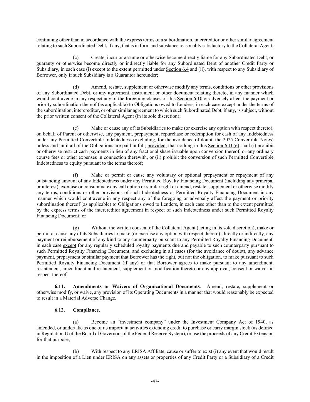 -47- continuing other than in accordance with the express terms of a subordination, intercreditor or other similar agreement relating to such Subordinated Debt, if any, that is in form and substance reasonably satisfactory to the Collateral Agent; (c) Create, incur or assume or otherwise become directly liable for any Subordinated Debt, or guaranty or otherwise become directly or indirectly liable for any Subordinated Debt of another Credit Party or Subsidiary, in each case (i) except to the extent permitted under Section 6.4 and (ii), with respect to any Subsidiary of Borrower, only if such Subsidiary is a Guarantor hereunder; (d) Amend, restate, supplement or otherwise modify any terms, conditions or other provisions of any Subordinated Debt, or any agreement, instrument or other document relating thereto, in any manner which would contravene in any respect any of the foregoing clauses of this Section 6.10 or adversely affect the payment or priority subordination thereof (as applicable) to Obligations owed to Lenders, in each case except under the terms of the subordination, intercreditor, or other similar agreement to which such Subordinated Debt, if any, is subject, without the prior written consent of the Collateral Agent (in its sole discretion); (e) Make or cause any of its Subsidiaries to make (or exercise any option with respect thereto), on behalf of Parent or otherwise, any payment, prepayment, repurchase or redemption for cash of any Indebtedness under any Permitted Convertible Indebtedness (excluding, for the avoidance of doubt, the 2025 Convertible Notes) unless and until all of the Obligations are paid in full; provided, that nothing in this Section 6.10(e) shall (i) prohibit or otherwise restrict cash payments in lieu of any fractional share issuable upon conversion thereof, or any ordinary course fees or other expenses in connection therewith, or (ii) prohibit the conversion of such Permitted Convertible Indebtedness to equity pursuant to the terms thereof; (f) Make or permit or cause any voluntary or optional prepayment or repayment of any outstanding amount of any Indebtedness under any Permitted Royalty Financing Document (including any principal or interest), exercise or consummate any call option or similar right or amend, restate, supplement or otherwise modify any terms, conditions or other provisions of such Indebtedness or Permitted Royalty Financing Document in any manner which would contravene in any respect any of the foregoing or adversely affect the payment or priority subordination thereof (as applicable) to Obligations owed to Lenders, in each case other than to the extent permitted by the express terms of the intercreditor agreement in respect of such Indebtedness under such Permitted Royalty Financing Document; or (g) Without the written consent of the Collateral Agent (acting in its sole discretion), make or permit or cause any of its Subsidiaries to make (or exercise any option with respect thereto), directly or indirectly, any payment or reimbursement of any kind to any counterparty pursuant to any Permitted Royalty Financing Document, in each case except for any regularly scheduled royalty payments due and payable to such counterparty pursuant to such Permitted Royalty Financing Document, and excluding in all cases (for the avoidance of doubt), any advance payment, prepayment or similar payment that Borrower has the right, but not the obligation, to make pursuant to such Permitted Royalty Financing Document (if any) or that Borrower agrees to make pursuant to any amendment, restatement, amendment and restatement, supplement or modification thereto or any approval, consent or waiver in respect thereof. 6.11. Amendments or Waivers of Organizational Documents. Amend, restate, supplement or otherwise modify, or waive, any provision of its Operating Documents in a manner that would reasonably be expected to result in a Material Adverse Change. 6.12. Compliance. (a) Become an “investment company” under the Investment Company Act of 1940, as amended, or undertake as one of its important activities extending credit to purchase or carry margin stock (as defined in Regulation U of the Board of Governors of the Federal Reserve System), or use the proceeds of any Credit Extension for that purpose; (b) With respect to any ERISA Affiliate, cause or suffer to exist (i) any event that would result in the imposition of a Lien under ERISA on any assets or properties of any Credit Party or a Subsidiary of a Credit