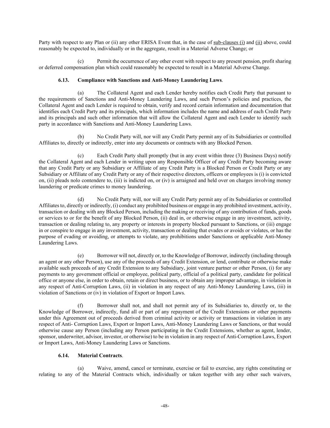-48- Party with respect to any Plan or (ii) any other ERISA Event that, in the case of sub-clauses (i) and (ii) above, could reasonably be expected to, individually or in the aggregate, result in a Material Adverse Change; or (c) Permit the occurrence of any other event with respect to any present pension, profit sharing or deferred compensation plan which could reasonably be expected to result in a Material Adverse Change. 6.13. Compliance with Sanctions and Anti-Money Laundering Laws. (a) The Collateral Agent and each Lender hereby notifies each Credit Party that pursuant to the requirements of Sanctions and Anti-Money Laundering Laws, and such Person’s policies and practices, the Collateral Agent and each Lender is required to obtain, verify and record certain information and documentation that identifies each Credit Party and its principals, which information includes the name and address of each Credit Party and its principals and such other information that will allow the Collateral Agent and each Lender to identify such party in accordance with Sanctions and Anti-Money Laundering Laws. (b) No Credit Party will, nor will any Credit Party permit any of its Subsidiaries or controlled Affiliates to, directly or indirectly, enter into any documents or contracts with any Blocked Person. (c) Each Credit Party shall promptly (but in any event within three (3) Business Days) notify the Collateral Agent and each Lender in writing upon any Responsible Officer of any Credit Party becoming aware that any Credit Party or any Subsidiary or Affiliate of any Credit Party is a Blocked Person or Credit Party or any Subsidiary or Affiliate of any Credit Party or any of their respective directors, officers or employees is (i) is convicted on, (ii) pleads nolo contendere to, (iii) is indicted on, or (iv) is arraigned and held over on charges involving money laundering or predicate crimes to money laundering. (d) No Credit Party will, nor will any Credit Party permit any of its Subsidiaries or controlled Affiliates to, directly or indirectly, (i) conduct any prohibited business or engage in any prohibited investment, activity, transaction or dealing with any Blocked Person, including the making or receiving of any contribution of funds, goods or services to or for the benefit of any Blocked Person, (ii) deal in, or otherwise engage in any investment, activity, transaction or dealing relating to, any property or interests in property blocked pursuant to Sanctions, or (iii) engage in or conspire to engage in any investment, activity, transaction or dealing that evades or avoids or violates, or has the purpose of evading or avoiding, or attempts to violate, any prohibitions under Sanctions or applicable Anti-Money Laundering Laws. (e) Borrower will not, directly or, to the Knowledge of Borrower, indirectly (including through an agent or any other Person), use any of the proceeds of any Credit Extension, or lend, contribute or otherwise make available such proceeds of any Credit Extension to any Subsidiary, joint venture partner or other Person, (i) for any payments to any government official or employee, political party, official of a political party, candidate for political office or anyone else, in order to obtain, retain or direct business, or to obtain any improper advantage, in violation in any respect of Anti-Corruption Laws, (ii) in violation in any respect of any Anti-Money Laundering Laws, (iii) in violation of Sanctions or (iv) in violation of Export or Import Laws. (f) Borrower shall not, and shall not permit any of its Subsidiaries to, directly or, to the Knowledge of Borrower, indirectly, fund all or part of any repayment of the Credit Extensions or other payments under this Agreement out of proceeds derived from criminal activity or activity or transactions in violation in any respect of Anti- Corruption Laws, Export or Import Laws, Anti-Money Laundering Laws or Sanctions, or that would otherwise cause any Person (including any Person participating in the Credit Extensions, whether as agent, lender, sponsor, underwriter, advisor, investor, or otherwise) to be in violation in any respect of Anti-Corruption Laws, Export or Import Laws, Anti-Money Laundering Laws or Sanctions. 6.14. Material Contracts. (a) Waive, amend, cancel or terminate, exercise or fail to exercise, any rights constituting or relating to any of the Material Contracts which, individually or taken together with any other such waivers,