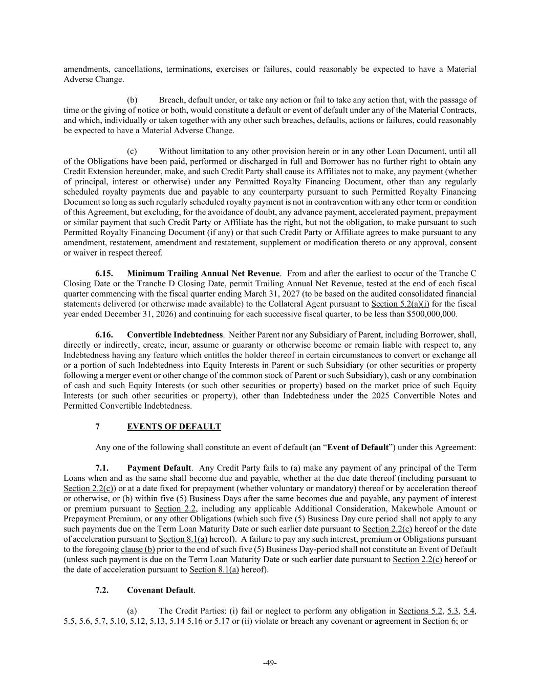 -49- amendments, cancellations, terminations, exercises or failures, could reasonably be expected to have a Material Adverse Change. (b) Breach, default under, or take any action or fail to take any action that, with the passage of time or the giving of notice or both, would constitute a default or event of default under any of the Material Contracts, and which, individually or taken together with any other such breaches, defaults, actions or failures, could reasonably be expected to have a Material Adverse Change. (c) Without limitation to any other provision herein or in any other Loan Document, until all of the Obligations have been paid, performed or discharged in full and Borrower has no further right to obtain any Credit Extension hereunder, make, and such Credit Party shall cause its Affiliates not to make, any payment (whether of principal, interest or otherwise) under any Permitted Royalty Financing Document, other than any regularly scheduled royalty payments due and payable to any counterparty pursuant to such Permitted Royalty Financing Document so long as such regularly scheduled royalty payment is not in contravention with any other term or condition of this Agreement, but excluding, for the avoidance of doubt, any advance payment, accelerated payment, prepayment or similar payment that such Credit Party or Affiliate has the right, but not the obligation, to make pursuant to such Permitted Royalty Financing Document (if any) or that such Credit Party or Affiliate agrees to make pursuant to any amendment, restatement, amendment and restatement, supplement or modification thereto or any approval, consent or waiver in respect thereof. 6.15. Minimum Trailing Annual Net Revenue. From and after the earliest to occur of the Tranche C Closing Date or the Tranche D Closing Date, permit Trailing Annual Net Revenue, tested at the end of each fiscal quarter commencing with the fiscal quarter ending March 31, 2027 (to be based on the audited consolidated financial statements delivered (or otherwise made available) to the Collateral Agent pursuant to Section 5.2(a)(i) for the fiscal year ended December 31, 2026) and continuing for each successive fiscal quarter, to be less than $500,000,000. 6.16. Convertible Indebtedness. Neither Parent nor any Subsidiary of Parent, including Borrower, shall, directly or indirectly, create, incur, assume or guaranty or otherwise become or remain liable with respect to, any Indebtedness having any feature which entitles the holder thereof in certain circumstances to convert or exchange all or a portion of such Indebtedness into Equity Interests in Parent or such Subsidiary (or other securities or property following a merger event or other change of the common stock of Parent or such Subsidiary), cash or any combination of cash and such Equity Interests (or such other securities or property) based on the market price of such Equity Interests (or such other securities or property), other than Indebtedness under the 2025 Convertible Notes and Permitted Convertible Indebtedness. 7 EVENTS OF DEFAULT Any one of the following shall constitute an event of default (an “Event of Default”) under this Agreement: 7.1. Payment Default. Any Credit Party fails to (a) make any payment of any principal of the Term Loans when and as the same shall become due and payable, whether at the due date thereof (including pursuant to Section 2.2(c)) or at a date fixed for prepayment (whether voluntary or mandatory) thereof or by acceleration thereof or otherwise, or (b) within five (5) Business Days after the same becomes due and payable, any payment of interest or premium pursuant to Section 2.2, including any applicable Additional Consideration, Makewhole Amount or Prepayment Premium, or any other Obligations (which such five (5) Business Day cure period shall not apply to any such payments due on the Term Loan Maturity Date or such earlier date pursuant to Section 2.2(c) hereof or the date of acceleration pursuant to Section 8.1(a) hereof). A failure to pay any such interest, premium or Obligations pursuant to the foregoing clause (b) prior to the end of such five (5) Business Day-period shall not constitute an Event of Default (unless such payment is due on the Term Loan Maturity Date or such earlier date pursuant to Section 2.2(c) hereof or the date of acceleration pursuant to Section 8.1(a) hereof). 7.2. Covenant Default. (a) The Credit Parties: (i) fail or neglect to perform any obligation in Sections 5.2, 5.3, 5.4, 5.5, 5.6, 5.7, 5.10, 5.12, 5.13, 5.14 5.16 or 5.17 or (ii) violate or breach any covenant or agreement in Section 6; or