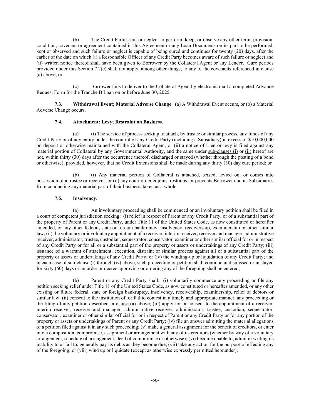-50- (b) The Credit Parties fail or neglect to perform, keep, or observe any other term, provision, condition, covenant or agreement contained in this Agreement or any Loan Documents on its part to be performed, kept or observed and such failure or neglect is capable of being cured and continues for twenty (20) days, after the earlier of the date on which (i) a Responsible Officer of any Credit Party becomes aware of such failure or neglect and (ii) written notice thereof shall have been given to Borrower by the Collateral Agent or any Lender. Cure periods provided under this Section 7.2(c) shall not apply, among other things, to any of the covenants referenced in clause (a) above; or (c) Borrower fails to deliver to the Collateral Agent by electronic mail a completed Advance Request Form for the Tranche B Loan on or before June 30, 2025. 7.3. Withdrawal Event; Material Adverse Change. (a) A Withdrawal Event occurs, or (b) a Material Adverse Change occurs. 7.4. Attachment; Levy; Restraint on Business. (a) (i) The service of process seeking to attach, by trustee or similar process, any funds of any Credit Party or of any entity under the control of any Credit Party (including a Subsidiary) in excess of $10,000,000 on deposit or otherwise maintained with the Collateral Agent, or (ii) a notice of Lien or levy is filed against any material portion of Collateral by any Governmental Authority, and the same under sub-clauses (i) or (ii) hereof are not, within thirty (30) days after the occurrence thereof, discharged or stayed (whether through the posting of a bond or otherwise); provided, however, that no Credit Extensions shall be made during any thirty (30) day cure period; or (b) (i) Any material portion of Collateral is attached, seized, levied on, or comes into possession of a trustee or receiver, or (ii) any court order enjoins, restrains, or prevents Borrower and its Subsidiaries from conducting any material part of their business, taken as a whole. 7.5. Insolvency. (a) An involuntary proceeding shall be commenced or an involuntary petition shall be filed in a court of competent jurisdiction seeking: (i) relief in respect of Parent or any Credit Party, or of a substantial part of the property of Parent or any Credit Party, under Title 11 of the United States Code, as now constituted or hereafter amended, or any other federal, state or foreign bankruptcy, insolvency, receivership, examinership or other similar law; (ii) the voluntary or involuntary appointment of a receiver, interim receiver, receiver and manager, administrative receiver, administrator, trustee, custodian, sequestrator, conservator, examiner or other similar official for or in respect of any Credit Party or for all or a substantial part of the property or assets or undertakings of any Credit Party; (iii) issuance of a warrant of attachment, execution, distraint or similar process against all or a substantial part of the property or assets or undertakings of any Credit Party; or (iv) the winding-up or liquidation of any Credit Party; and in each case of sub-clause (i) through (iv) above, such proceeding or petition shall continue undismissed or unstayed for sixty (60) days or an order or decree approving or ordering any of the foregoing shall be entered; (b) Parent or any Credit Party shall: (i) voluntarily commence any proceeding or file any petition seeking relief under Title 11 of the United States Code, as now constituted or hereafter amended, or any other existing or future federal, state or foreign bankruptcy, insolvency, receivership, examinership, relief of debtors or similar law; (ii) consent to the institution of, or fail to contest in a timely and appropriate manner, any proceeding or the filing of any petition described in clause (a) above; (iii) apply for or consent to the appointment of a receiver, interim receiver, receiver and manager, administrative receiver, administrator, trustee, custodian, sequestrator, conservator, examiner or other similar official for or in respect of Parent or any Credit Party or for any portion of the property or assets or undertakings of Parent or any Credit Party; (iv) file an answer admitting the material allegations of a petition filed against it in any such proceeding; (v) make a general assignment for the benefit of creditors, or enter into a composition, compromise, assignment or arrangement with any of its creditors (whether by way of a voluntary arrangement, schedule of arrangement, deed of compromise or otherwise); (vi) become unable to, admit in writing its inability to or fail to, generally pay its debts as they become due; (vii) take any action for the purpose of effecting any of the foregoing; or (viii) wind up or liquidate (except as otherwise expressly permitted hereunder);