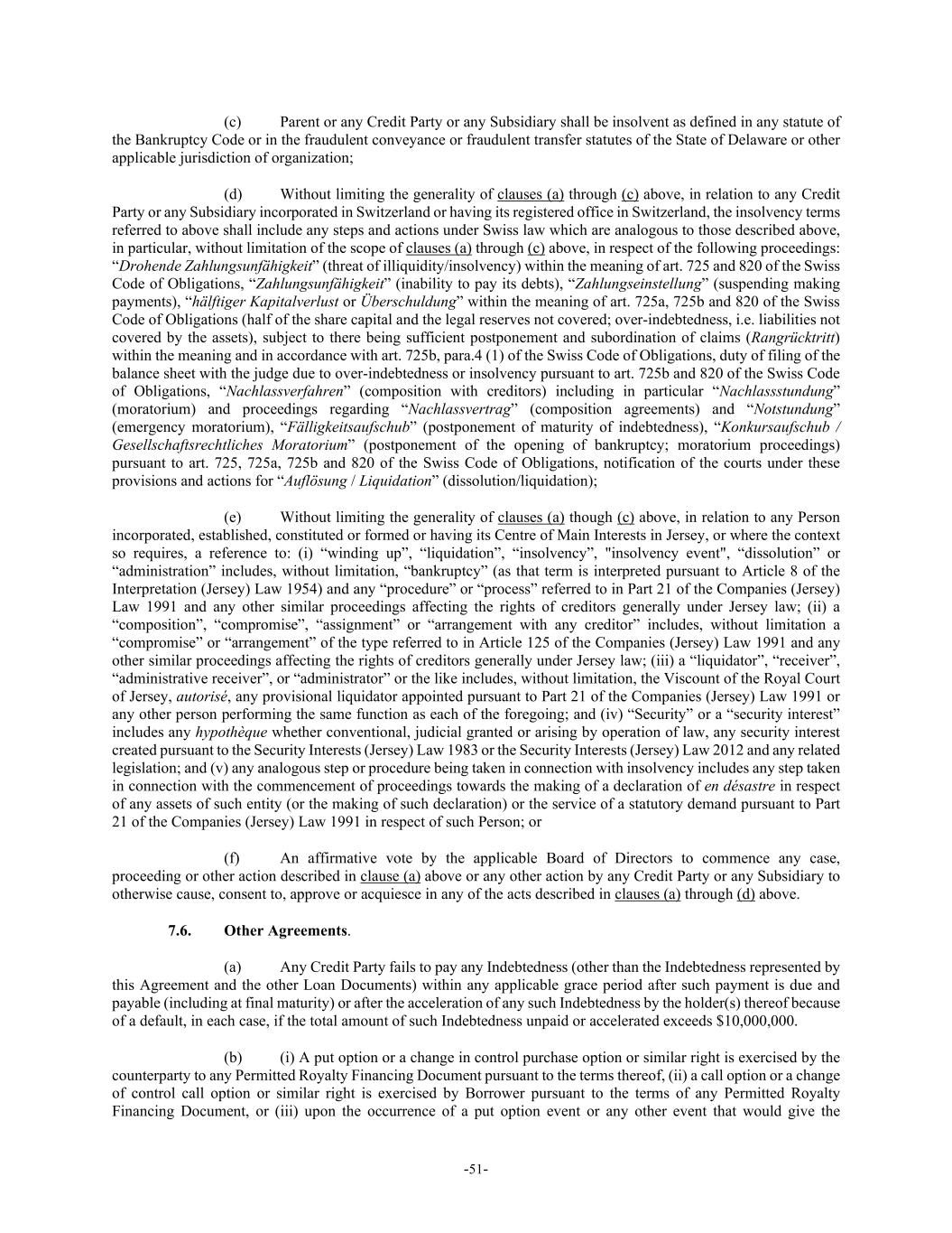 -51- (c) Parent or any Credit Party or any Subsidiary shall be insolvent as defined in any statute of the Bankruptcy Code or in the fraudulent conveyance or fraudulent transfer statutes of the State of Delaware or other applicable jurisdiction of organization; (d) Without limiting the generality of clauses (a) through (c) above, in relation to any Credit Party or any Subsidiary incorporated in Switzerland or having its registered office in Switzerland, the insolvency terms referred to above shall include any steps and actions under Swiss law which are analogous to those described above, in particular, without limitation of the scope of clauses (a) through (c) above, in respect of the following proceedings: “Drohende Zahlungsunfähigkeit” (threat of illiquidity/insolvency) within the meaning of art. 725 and 820 of the Swiss Code of Obligations, “Zahlungsunfähigkeit” (inability to pay its debts), “Zahlungseinstellung” (suspending making payments), “hälftiger Kapitalverlust or Überschuldung” within the meaning of art. 725a, 725b and 820 of the Swiss Code of Obligations (half of the share capital and the legal reserves not covered; over-indebtedness, i.e. liabilities not covered by the assets), subject to there being sufficient postponement and subordination of claims (Rangrücktritt) within the meaning and in accordance with art. 725b, para.4 (1) of the Swiss Code of Obligations, duty of filing of the balance sheet with the judge due to over-indebtedness or insolvency pursuant to art. 725b and 820 of the Swiss Code of Obligations, “Nachlassverfahren” (composition with creditors) including in particular “Nachlassstundung” (moratorium) and proceedings regarding “Nachlassvertrag” (composition agreements) and “Notstundung” (emergency moratorium), “Fälligkeitsaufschub” (postponement of maturity of indebtedness), “Konkursaufschub / Gesellschaftsrechtliches Moratorium” (postponement of the opening of bankruptcy; moratorium proceedings) pursuant to art. 725, 725a, 725b and 820 of the Swiss Code of Obligations, notification of the courts under these provisions and actions for “Auflösung / Liquidation” (dissolution/liquidation); (e) Without limiting the generality of clauses (a) though (c) above, in relation to any Person incorporated, established, constituted or formed or having its Centre of Main Interests in Jersey, or where the context so requires, a reference to: (i) “winding up”, “liquidation”, “insolvency”, "insolvency event", “dissolution” or “administration” includes, without limitation, “bankruptcy” (as that term is interpreted pursuant to Article 8 of the Interpretation (Jersey) Law 1954) and any “procedure” or “process” referred to in Part 21 of the Companies (Jersey) Law 1991 and any other similar proceedings affecting the rights of creditors generally under Jersey law; (ii) a “composition”, “compromise”, “assignment” or “arrangement with any creditor” includes, without limitation a “compromise” or “arrangement” of the type referred to in Article 125 of the Companies (Jersey) Law 1991 and any other similar proceedings affecting the rights of creditors generally under Jersey law; (iii) a “liquidator”, “receiver”, “administrative receiver”, or “administrator” or the like includes, without limitation, the Viscount of the Royal Court of Jersey, autorisé, any provisional liquidator appointed pursuant to Part 21 of the Companies (Jersey) Law 1991 or any other person performing the same function as each of the foregoing; and (iv) “Security” or a “security interest” includes any hypothèque whether conventional, judicial granted or arising by operation of law, any security interest created pursuant to the Security Interests (Jersey) Law 1983 or the Security Interests (Jersey) Law 2012 and any related legislation; and (v) any analogous step or procedure being taken in connection with insolvency includes any step taken in connection with the commencement of proceedings towards the making of a declaration of en désastre in respect of any assets of such entity (or the making of such declaration) or the service of a statutory demand pursuant to Part 21 of the Companies (Jersey) Law 1991 in respect of such Person; or (f) An affirmative vote by the applicable Board of Directors to commence any case, proceeding or other action described in clause (a) above or any other action by any Credit Party or any Subsidiary to otherwise cause, consent to, approve or acquiesce in any of the acts described in clauses (a) through (d) above. 7.6. Other Agreements. (a) Any Credit Party fails to pay any Indebtedness (other than the Indebtedness represented by this Agreement and the other Loan Documents) within any applicable grace period after such payment is due and payable (including at final maturity) or after the acceleration of any such Indebtedness by the holder(s) thereof because of a default, in each case, if the total amount of such Indebtedness unpaid or accelerated exceeds $10,000,000. (b) (i) A put option or a change in control purchase option or similar right is exercised by the counterparty to any Permitted Royalty Financing Document pursuant to the terms thereof, (ii) a call option or a change of control call option or similar right is exercised by Borrower pursuant to the terms of any Permitted Royalty Financing Document, or (iii) upon the occurrence of a put option event or any other event that would give the