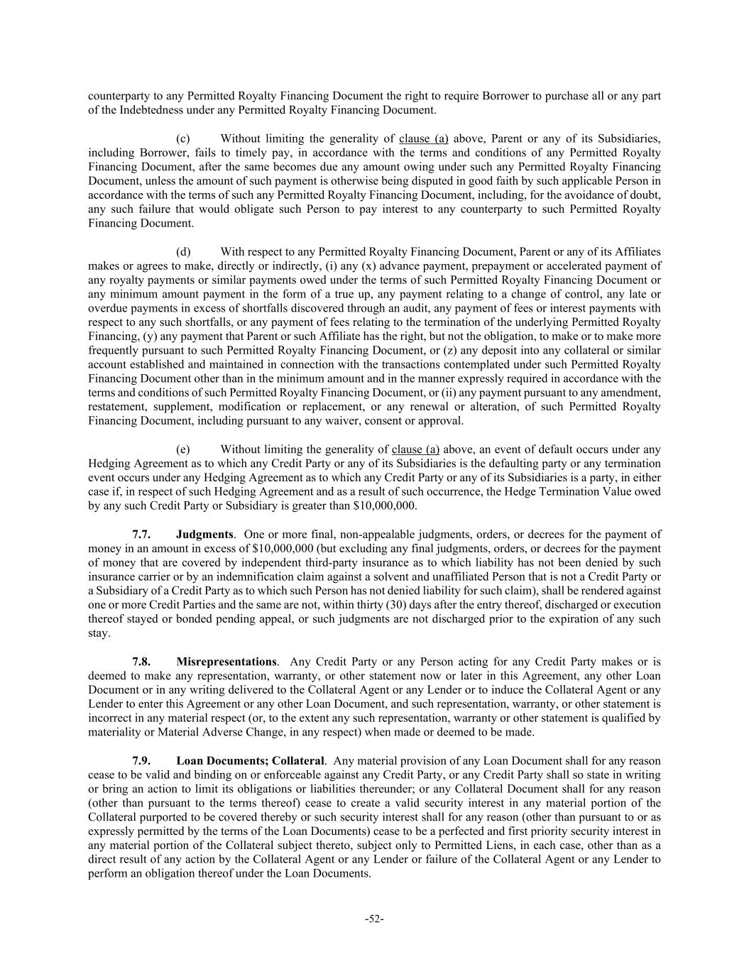 -52- counterparty to any Permitted Royalty Financing Document the right to require Borrower to purchase all or any part of the Indebtedness under any Permitted Royalty Financing Document. (c) Without limiting the generality of clause (a) above, Parent or any of its Subsidiaries, including Borrower, fails to timely pay, in accordance with the terms and conditions of any Permitted Royalty Financing Document, after the same becomes due any amount owing under such any Permitted Royalty Financing Document, unless the amount of such payment is otherwise being disputed in good faith by such applicable Person in accordance with the terms of such any Permitted Royalty Financing Document, including, for the avoidance of doubt, any such failure that would obligate such Person to pay interest to any counterparty to such Permitted Royalty Financing Document. (d) With respect to any Permitted Royalty Financing Document, Parent or any of its Affiliates makes or agrees to make, directly or indirectly, (i) any (x) advance payment, prepayment or accelerated payment of any royalty payments or similar payments owed under the terms of such Permitted Royalty Financing Document or any minimum amount payment in the form of a true up, any payment relating to a change of control, any late or overdue payments in excess of shortfalls discovered through an audit, any payment of fees or interest payments with respect to any such shortfalls, or any payment of fees relating to the termination of the underlying Permitted Royalty Financing, (y) any payment that Parent or such Affiliate has the right, but not the obligation, to make or to make more frequently pursuant to such Permitted Royalty Financing Document, or (z) any deposit into any collateral or similar account established and maintained in connection with the transactions contemplated under such Permitted Royalty Financing Document other than in the minimum amount and in the manner expressly required in accordance with the terms and conditions of such Permitted Royalty Financing Document, or (ii) any payment pursuant to any amendment, restatement, supplement, modification or replacement, or any renewal or alteration, of such Permitted Royalty Financing Document, including pursuant to any waiver, consent or approval. (e) Without limiting the generality of clause (a) above, an event of default occurs under any Hedging Agreement as to which any Credit Party or any of its Subsidiaries is the defaulting party or any termination event occurs under any Hedging Agreement as to which any Credit Party or any of its Subsidiaries is a party, in either case if, in respect of such Hedging Agreement and as a result of such occurrence, the Hedge Termination Value owed by any such Credit Party or Subsidiary is greater than $10,000,000. 7.7. Judgments. One or more final, non-appealable judgments, orders, or decrees for the payment of money in an amount in excess of $10,000,000 (but excluding any final judgments, orders, or decrees for the payment of money that are covered by independent third-party insurance as to which liability has not been denied by such insurance carrier or by an indemnification claim against a solvent and unaffiliated Person that is not a Credit Party or a Subsidiary of a Credit Party as to which such Person has not denied liability for such claim), shall be rendered against one or more Credit Parties and the same are not, within thirty (30) days after the entry thereof, discharged or execution thereof stayed or bonded pending appeal, or such judgments are not discharged prior to the expiration of any such stay. 7.8. Misrepresentations. Any Credit Party or any Person acting for any Credit Party makes or is deemed to make any representation, warranty, or other statement now or later in this Agreement, any other Loan Document or in any writing delivered to the Collateral Agent or any Lender or to induce the Collateral Agent or any Lender to enter this Agreement or any other Loan Document, and such representation, warranty, or other statement is incorrect in any material respect (or, to the extent any such representation, warranty or other statement is qualified by materiality or Material Adverse Change, in any respect) when made or deemed to be made. 7.9. Loan Documents; Collateral. Any material provision of any Loan Document shall for any reason cease to be valid and binding on or enforceable against any Credit Party, or any Credit Party shall so state in writing or bring an action to limit its obligations or liabilities thereunder; or any Collateral Document shall for any reason (other than pursuant to the terms thereof) cease to create a valid security interest in any material portion of the Collateral purported to be covered thereby or such security interest shall for any reason (other than pursuant to or as expressly permitted by the terms of the Loan Documents) cease to be a perfected and first priority security interest in any material portion of the Collateral subject thereto, subject only to Permitted Liens, in each case, other than as a direct result of any action by the Collateral Agent or any Lender or failure of the Collateral Agent or any Lender to perform an obligation thereof under the Loan Documents.