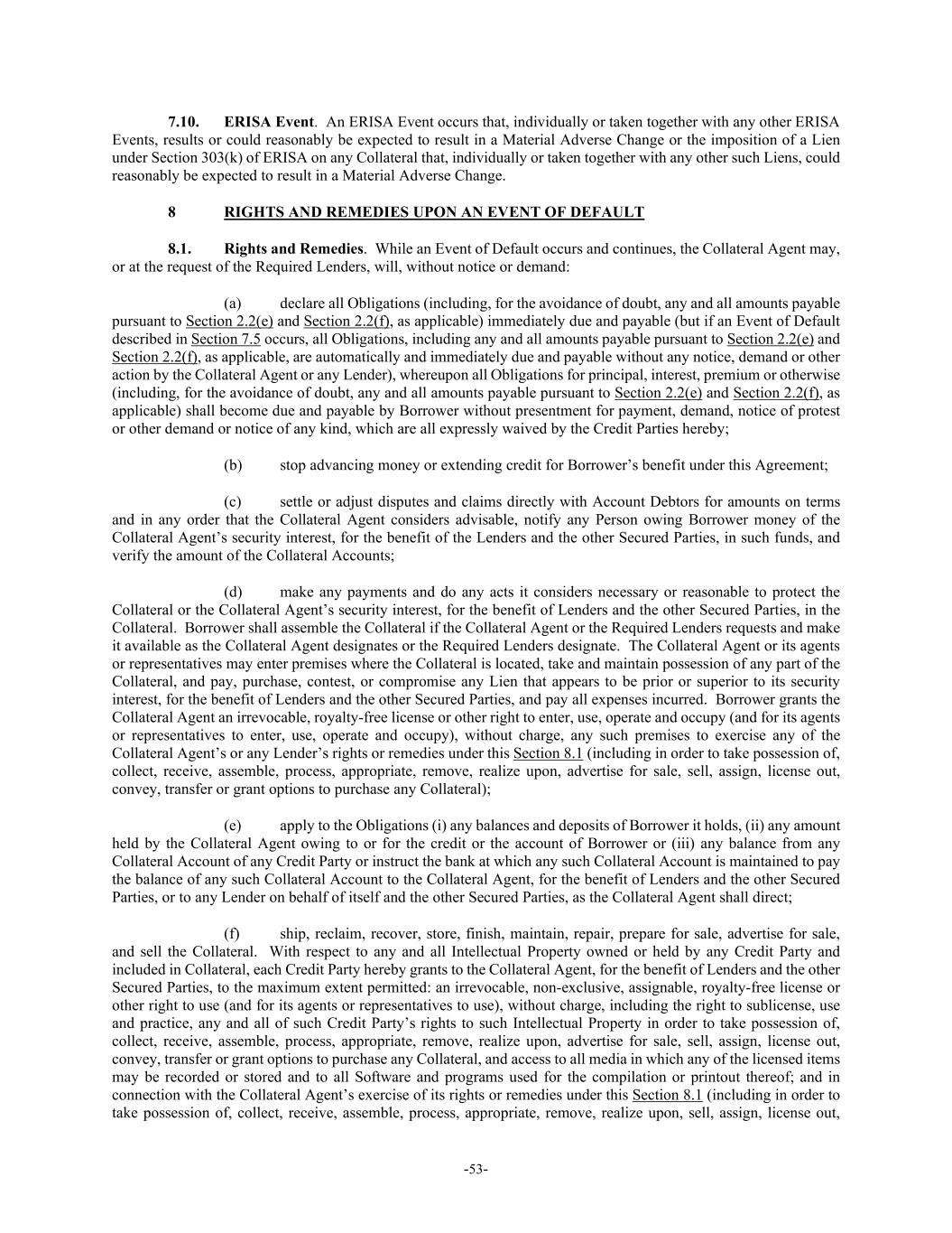 -53- 7.10. ERISA Event. An ERISA Event occurs that, individually or taken together with any other ERISA Events, results or could reasonably be expected to result in a Material Adverse Change or the imposition of a Lien under Section 303(k) of ERISA on any Collateral that, individually or taken together with any other such Liens, could reasonably be expected to result in a Material Adverse Change. 8 RIGHTS AND REMEDIES UPON AN EVENT OF DEFAULT 8.1. Rights and Remedies. While an Event of Default occurs and continues, the Collateral Agent may, or at the request of the Required Lenders, will, without notice or demand: (a) declare all Obligations (including, for the avoidance of doubt, any and all amounts payable pursuant to Section 2.2(e) and Section 2.2(f), as applicable) immediately due and payable (but if an Event of Default described in Section 7.5 occurs, all Obligations, including any and all amounts payable pursuant to Section 2.2(e) and Section 2.2(f), as applicable, are automatically and immediately due and payable without any notice, demand or other action by the Collateral Agent or any Lender), whereupon all Obligations for principal, interest, premium or otherwise (including, for the avoidance of doubt, any and all amounts payable pursuant to Section 2.2(e) and Section 2.2(f), as applicable) shall become due and payable by Borrower without presentment for payment, demand, notice of protest or other demand or notice of any kind, which are all expressly waived by the Credit Parties hereby; (b) stop advancing money or extending credit for Borrower’s benefit under this Agreement; (c) settle or adjust disputes and claims directly with Account Debtors for amounts on terms and in any order that the Collateral Agent considers advisable, notify any Person owing Borrower money of the Collateral Agent’s security interest, for the benefit of the Lenders and the other Secured Parties, in such funds, and verify the amount of the Collateral Accounts; (d) make any payments and do any acts it considers necessary or reasonable to protect the Collateral or the Collateral Agent’s security interest, for the benefit of Lenders and the other Secured Parties, in the Collateral. Borrower shall assemble the Collateral if the Collateral Agent or the Required Lenders requests and make it available as the Collateral Agent designates or the Required Lenders designate. The Collateral Agent or its agents or representatives may enter premises where the Collateral is located, take and maintain possession of any part of the Collateral, and pay, purchase, contest, or compromise any Lien that appears to be prior or superior to its security interest, for the benefit of Lenders and the other Secured Parties, and pay all expenses incurred. Borrower grants the Collateral Agent an irrevocable, royalty-free license or other right to enter, use, operate and occupy (and for its agents or representatives to enter, use, operate and occupy), without charge, any such premises to exercise any of the Collateral Agent’s or any Lender’s rights or remedies under this Section 8.1 (including in order to take possession of, collect, receive, assemble, process, appropriate, remove, realize upon, advertise for sale, sell, assign, license out, convey, transfer or grant options to purchase any Collateral); (e) apply to the Obligations (i) any balances and deposits of Borrower it holds, (ii) any amount held by the Collateral Agent owing to or for the credit or the account of Borrower or (iii) any balance from any Collateral Account of any Credit Party or instruct the bank at which any such Collateral Account is maintained to pay the balance of any such Collateral Account to the Collateral Agent, for the benefit of Lenders and the other Secured Parties, or to any Lender on behalf of itself and the other Secured Parties, as the Collateral Agent shall direct; (f) ship, reclaim, recover, store, finish, maintain, repair, prepare for sale, advertise for sale, and sell the Collateral. With respect to any and all Intellectual Property owned or held by any Credit Party and included in Collateral, each Credit Party hereby grants to the Collateral Agent, for the benefit of Lenders and the other Secured Parties, to the maximum extent permitted: an irrevocable, non-exclusive, assignable, royalty-free license or other right to use (and for its agents or representatives to use), without charge, including the right to sublicense, use and practice, any and all of such Credit Party’s rights to such Intellectual Property in order to take possession of, collect, receive, assemble, process, appropriate, remove, realize upon, advertise for sale, sell, assign, license out, convey, transfer or grant options to purchase any Collateral, and access to all media in which any of the licensed items may be recorded or stored and to all Software and programs used for the compilation or printout thereof; and in connection with the Collateral Agent’s exercise of its rights or remedies under this Section 8.1 (including in order to take possession of, collect, receive, assemble, process, appropriate, remove, realize upon, sell, assign, license out,