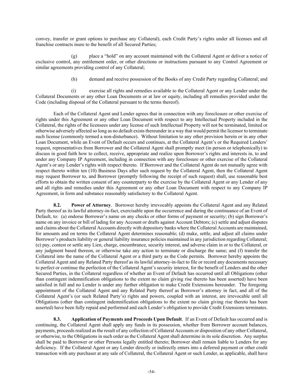 -54- convey, transfer or grant options to purchase any Collateral), each Credit Party’s rights under all licenses and all franchise contracts inure to the benefit of all Secured Parties; (g) place a “hold” on any account maintained with the Collateral Agent or deliver a notice of exclusive control, any entitlement order, or other directions or instructions pursuant to any Control Agreement or similar agreements providing control of any Collateral; (h) demand and receive possession of the Books of any Credit Party regarding Collateral; and (i) exercise all rights and remedies available to the Collateral Agent or any Lender under the Collateral Documents or any other Loan Documents or at law or equity, including all remedies provided under the Code (including disposal of the Collateral pursuant to the terms thereof). Each of the Collateral Agent and Lender agrees that in connection with any foreclosure or other exercise of rights under this Agreement or any other Loan Document with respect to any Intellectual Property included in the Collateral, the rights of the licensees under any license of such Intellectual Property will not be terminated, limited or otherwise adversely affected so long as no default exists thereunder in a way that would permit the licensor to terminate such license (commonly termed a non-disturbance). Without limitation to any other provision herein or in any other Loan Document, while an Event of Default occurs and continues, at the Collateral Agent’s or the Required Lenders’ request, representatives from Borrower and the Collateral Agent shall promptly meet (in person or telephonically) to discuss in good faith how to collect, receive, appropriate and realize upon Borrower’s rights and interests in, to and under any Company IP Agreement, including in connection with any foreclosure or other exercise of the Collateral Agent’s or any Lender’s rights with respect thereto. If Borrower and the Collateral Agent do not mutually agree with respect thereto within ten (10) Business Days after such request by the Collateral Agent, then the Collateral Agent may request Borrower to, and Borrower (promptly following the receipt of such request) shall, use reasonable best efforts to obtain the written consent of any counterparty to the exercise by the Collateral Agent or any Lender of any and all rights and remedies under this Agreement or any other Loan Document with respect to any Company IP Agreement, in form and substance reasonably satisfactory to the Collateral Agent. 8.2. Power of Attorney. Borrower hereby irrevocably appoints the Collateral Agent and any Related Party thereof as its lawful attorney-in-fact, exercisable upon the occurrence and during the continuance of an Event of Default, to: (a) endorse Borrower’s name on any checks or other forms of payment or security; (b) sign Borrower’s name on any invoice or bill of lading for any Account or drafts against Account Debtors; (c) settle and adjust disputes and claims about the Collateral Accounts directly with depository banks where the Collateral Accounts are maintained, for amounts and on terms the Collateral Agent determines reasonable; (d) make, settle, and adjust all claims under Borrower’s products liability or general liability insurance policies maintained in any jurisdiction regarding Collateral; (e) pay, contest or settle any Lien, charge, encumbrance, security interest, and adverse claim in or to the Collateral, or any judgment based thereon, or otherwise take any action to terminate or discharge the same; and (f) transfer the Collateral into the name of the Collateral Agent or a third party as the Code permits. Borrower hereby appoints the Collateral Agent and any Related Party thereof as its lawful attorney-in-fact to file or record any documents necessary to perfect or continue the perfection of the Collateral Agent’s security interest, for the benefit of Lenders and the other Secured Parties, in the Collateral regardless of whether an Event of Default has occurred until all Obligations (other than contingent indemnification obligations to the extent no claim giving rise thereto has been asserted) have been satisfied in full and no Lender is under any further obligation to make Credit Extensions hereunder. The foregoing appointment of the Collateral Agent and any Related Party thereof as Borrower’s attorney in fact, and all of the Collateral Agent’s (or such Related Party’s) rights and powers, coupled with an interest, are irrevocable until all Obligations (other than contingent indemnification obligations to the extent no claim giving rise thereto has been asserted) have been fully repaid and performed and each Lender’s obligation to provide Credit Extensions terminates. 8.3. Application of Payments and Proceeds Upon Default. If an Event of Default has occurred and is continuing, the Collateral Agent shall apply any funds in its possession, whether from Borrower account balances, payments, proceeds realized as the result of any collection of Collateral Accounts or disposition of any other Collateral, or otherwise, to the Obligations in such order as the Collateral Agent shall determine in its sole discretion. Any surplus shall be paid to Borrower or other Persons legally entitled thereto; Borrower shall remain liable to Lenders for any deficiency. If the Collateral Agent or any Lender directly or indirectly enters into a deferred payment or other credit transaction with any purchaser at any sale of Collateral, the Collateral Agent or such Lender, as applicable, shall have