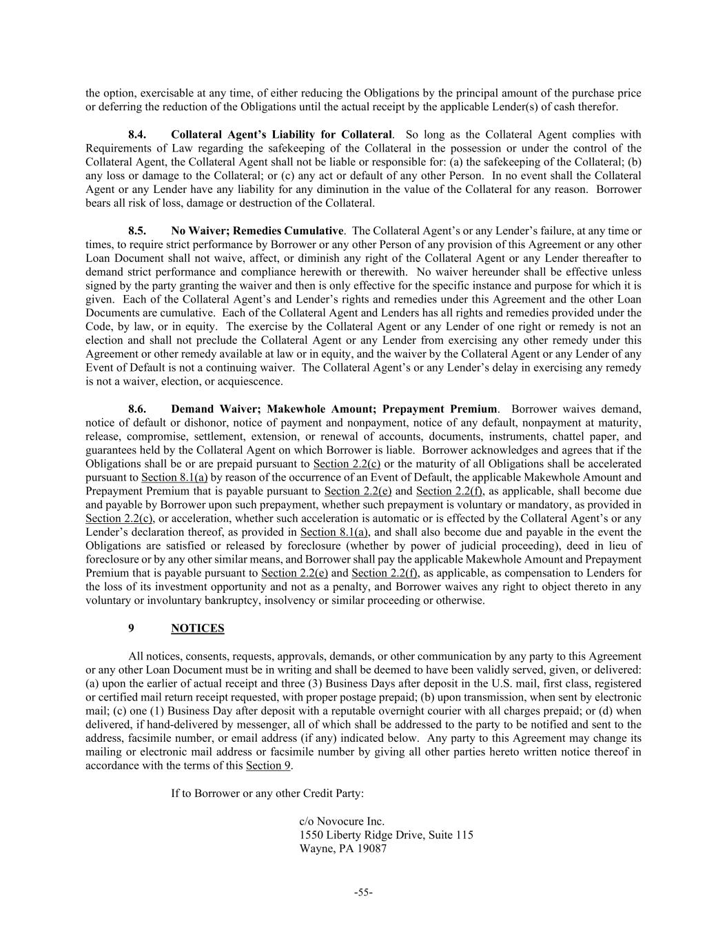 -55- the option, exercisable at any time, of either reducing the Obligations by the principal amount of the purchase price or deferring the reduction of the Obligations until the actual receipt by the applicable Lender(s) of cash therefor. 8.4. Collateral Agent’s Liability for Collateral. So long as the Collateral Agent complies with Requirements of Law regarding the safekeeping of the Collateral in the possession or under the control of the Collateral Agent, the Collateral Agent shall not be liable or responsible for: (a) the safekeeping of the Collateral; (b) any loss or damage to the Collateral; or (c) any act or default of any other Person. In no event shall the Collateral Agent or any Lender have any liability for any diminution in the value of the Collateral for any reason. Borrower bears all risk of loss, damage or destruction of the Collateral. 8.5. No Waiver; Remedies Cumulative. The Collateral Agent’s or any Lender’s failure, at any time or times, to require strict performance by Borrower or any other Person of any provision of this Agreement or any other Loan Document shall not waive, affect, or diminish any right of the Collateral Agent or any Lender thereafter to demand strict performance and compliance herewith or therewith. No waiver hereunder shall be effective unless signed by the party granting the waiver and then is only effective for the specific instance and purpose for which it is given. Each of the Collateral Agent’s and Lender’s rights and remedies under this Agreement and the other Loan Documents are cumulative. Each of the Collateral Agent and Lenders has all rights and remedies provided under the Code, by law, or in equity. The exercise by the Collateral Agent or any Lender of one right or remedy is not an election and shall not preclude the Collateral Agent or any Lender from exercising any other remedy under this Agreement or other remedy available at law or in equity, and the waiver by the Collateral Agent or any Lender of any Event of Default is not a continuing waiver. The Collateral Agent’s or any Lender’s delay in exercising any remedy is not a waiver, election, or acquiescence. 8.6. Demand Waiver; Makewhole Amount; Prepayment Premium. Borrower waives demand, notice of default or dishonor, notice of payment and nonpayment, notice of any default, nonpayment at maturity, release, compromise, settlement, extension, or renewal of accounts, documents, instruments, chattel paper, and guarantees held by the Collateral Agent on which Borrower is liable. Borrower acknowledges and agrees that if the Obligations shall be or are prepaid pursuant to Section 2.2(c) or the maturity of all Obligations shall be accelerated pursuant to Section 8.1(a) by reason of the occurrence of an Event of Default, the applicable Makewhole Amount and Prepayment Premium that is payable pursuant to Section 2.2(e) and Section 2.2(f), as applicable, shall become due and payable by Borrower upon such prepayment, whether such prepayment is voluntary or mandatory, as provided in Section 2.2(c), or acceleration, whether such acceleration is automatic or is effected by the Collateral Agent’s or any Lender’s declaration thereof, as provided in Section 8.1(a), and shall also become due and payable in the event the Obligations are satisfied or released by foreclosure (whether by power of judicial proceeding), deed in lieu of foreclosure or by any other similar means, and Borrower shall pay the applicable Makewhole Amount and Prepayment Premium that is payable pursuant to Section 2.2(e) and Section 2.2(f), as applicable, as compensation to Lenders for the loss of its investment opportunity and not as a penalty, and Borrower waives any right to object thereto in any voluntary or involuntary bankruptcy, insolvency or similar proceeding or otherwise. 9 NOTICES All notices, consents, requests, approvals, demands, or other communication by any party to this Agreement or any other Loan Document must be in writing and shall be deemed to have been validly served, given, or delivered: (a) upon the earlier of actual receipt and three (3) Business Days after deposit in the U.S. mail, first class, registered or certified mail return receipt requested, with proper postage prepaid; (b) upon transmission, when sent by electronic mail; (c) one (1) Business Day after deposit with a reputable overnight courier with all charges prepaid; or (d) when delivered, if hand-delivered by messenger, all of which shall be addressed to the party to be notified and sent to the address, facsimile number, or email address (if any) indicated below. Any party to this Agreement may change its mailing or electronic mail address or facsimile number by giving all other parties hereto written notice thereof in accordance with the terms of this Section 9. If to Borrower or any other Credit Party: c/o Novocure Inc. 1550 Liberty Ridge Drive, Suite 115 Wayne, PA 19087