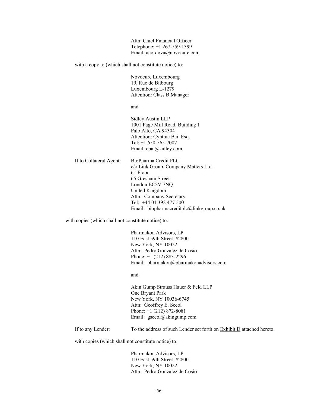 -56- Attn: Chief Financial Officer Telephone: +1 267-559-1399 Email: acordova@novocure.com with a copy to (which shall not constitute notice) to: Novocure Luxembourg 19, Rue de Bitbourg Luxembourg L-1279 Attention: Class B Manager and Sidley Austin LLP 1001 Page Mill Road, Building 1 Palo Alto, CA 94304 Attention: Cynthia Bai, Esq. Tel: +1 650-565-7007 Email: cbai@sidley.com If to Collateral Agent: BioPharma Credit PLC c/o Link Group, Company Matters Ltd. 6th Floor 65 Gresham Street London EC2V 7NQ United Kingdom Attn: Company Secretary Tel: +44 01 392 477 500 Email: biopharmacreditplc@linkgroup.co.uk with copies (which shall not constitute notice) to: Pharmakon Advisors, LP 110 East 59th Street, #2800 New York, NY 10022 Attn: Pedro Gonzalez de Cosio Phone: +1 (212) 883-2296 Email: pharmakon@pharmakonadvisors.com and Akin Gump Strauss Hauer & Feld LLP One Bryant Park New York, NY 10036-6745 Attn: Geoffrey E. Secol Phone: +1 (212) 872-8081 Email: gsecol@akingump.com If to any Lender: To the address of such Lender set forth on Exhibit D attached hereto with copies (which shall not constitute notice) to: Pharmakon Advisors, LP 110 East 59th Street, #2800 New York, NY 10022 Attn: Pedro Gonzalez de Cosio