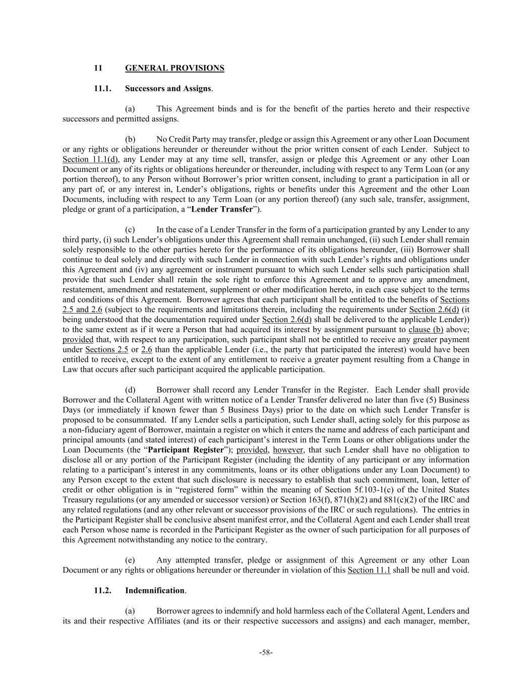 -58- 11 GENERAL PROVISIONS 11.1. Successors and Assigns. (a) This Agreement binds and is for the benefit of the parties hereto and their respective successors and permitted assigns. (b) No Credit Party may transfer, pledge or assign this Agreement or any other Loan Document or any rights or obligations hereunder or thereunder without the prior written consent of each Lender. Subject to Section 11.1(d), any Lender may at any time sell, transfer, assign or pledge this Agreement or any other Loan Document or any of its rights or obligations hereunder or thereunder, including with respect to any Term Loan (or any portion thereof), to any Person without Borrower’s prior written consent, including to grant a participation in all or any part of, or any interest in, Lender’s obligations, rights or benefits under this Agreement and the other Loan Documents, including with respect to any Term Loan (or any portion thereof) (any such sale, transfer, assignment, pledge or grant of a participation, a “Lender Transfer”). (c) In the case of a Lender Transfer in the form of a participation granted by any Lender to any third party, (i) such Lender’s obligations under this Agreement shall remain unchanged, (ii) such Lender shall remain solely responsible to the other parties hereto for the performance of its obligations hereunder, (iii) Borrower shall continue to deal solely and directly with such Lender in connection with such Lender’s rights and obligations under this Agreement and (iv) any agreement or instrument pursuant to which such Lender sells such participation shall provide that such Lender shall retain the sole right to enforce this Agreement and to approve any amendment, restatement, amendment and restatement, supplement or other modification hereto, in each case subject to the terms and conditions of this Agreement. Borrower agrees that each participant shall be entitled to the benefits of Sections 2.5 and 2.6 (subject to the requirements and limitations therein, including the requirements under Section 2.6(d) (it being understood that the documentation required under Section 2.6(d) shall be delivered to the applicable Lender)) to the same extent as if it were a Person that had acquired its interest by assignment pursuant to clause (b) above; provided that, with respect to any participation, such participant shall not be entitled to receive any greater payment under Sections 2.5 or 2.6 than the applicable Lender (i.e., the party that participated the interest) would have been entitled to receive, except to the extent of any entitlement to receive a greater payment resulting from a Change in Law that occurs after such participant acquired the applicable participation. (d) Borrower shall record any Lender Transfer in the Register. Each Lender shall provide Borrower and the Collateral Agent with written notice of a Lender Transfer delivered no later than five (5) Business Days (or immediately if known fewer than 5 Business Days) prior to the date on which such Lender Transfer is proposed to be consummated. If any Lender sells a participation, such Lender shall, acting solely for this purpose as a non-fiduciary agent of Borrower, maintain a register on which it enters the name and address of each participant and principal amounts (and stated interest) of each participant’s interest in the Term Loans or other obligations under the Loan Documents (the “Participant Register”); provided, however, that such Lender shall have no obligation to disclose all or any portion of the Participant Register (including the identity of any participant or any information relating to a participant’s interest in any commitments, loans or its other obligations under any Loan Document) to any Person except to the extent that such disclosure is necessary to establish that such commitment, loan, letter of credit or other obligation is in “registered form” within the meaning of Section 5f.103-1(c) of the United States Treasury regulations (or any amended or successor version) or Section 163(f), 871(h)(2) and 881(c)(2) of the IRC and any related regulations (and any other relevant or successor provisions of the IRC or such regulations). The entries in the Participant Register shall be conclusive absent manifest error, and the Collateral Agent and each Lender shall treat each Person whose name is recorded in the Participant Register as the owner of such participation for all purposes of this Agreement notwithstanding any notice to the contrary. (e) Any attempted transfer, pledge or assignment of this Agreement or any other Loan Document or any rights or obligations hereunder or thereunder in violation of this Section 11.1 shall be null and void. 11.2. Indemnification. (a) Borrower agrees to indemnify and hold harmless each of the Collateral Agent, Lenders and its and their respective Affiliates (and its or their respective successors and assigns) and each manager, member,