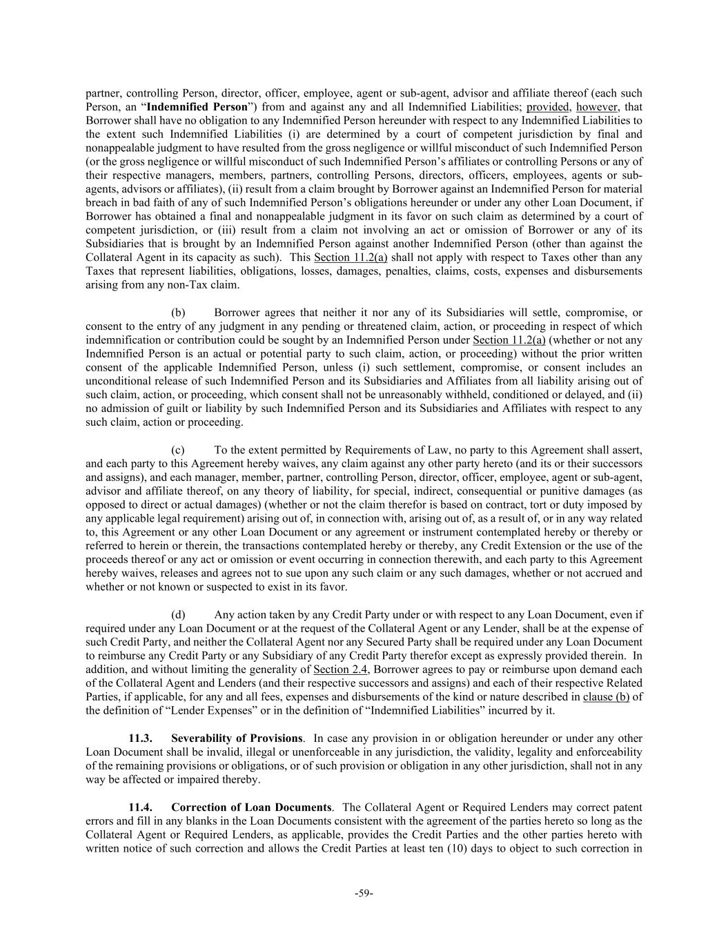 -59- partner, controlling Person, director, officer, employee, agent or sub-agent, advisor and affiliate thereof (each such Person, an “Indemnified Person”) from and against any and all Indemnified Liabilities; provided, however, that Borrower shall have no obligation to any Indemnified Person hereunder with respect to any Indemnified Liabilities to the extent such Indemnified Liabilities (i) are determined by a court of competent jurisdiction by final and nonappealable judgment to have resulted from the gross negligence or willful misconduct of such Indemnified Person (or the gross negligence or willful misconduct of such Indemnified Person’s affiliates or controlling Persons or any of their respective managers, members, partners, controlling Persons, directors, officers, employees, agents or sub- agents, advisors or affiliates), (ii) result from a claim brought by Borrower against an Indemnified Person for material breach in bad faith of any of such Indemnified Person’s obligations hereunder or under any other Loan Document, if Borrower has obtained a final and nonappealable judgment in its favor on such claim as determined by a court of competent jurisdiction, or (iii) result from a claim not involving an act or omission of Borrower or any of its Subsidiaries that is brought by an Indemnified Person against another Indemnified Person (other than against the Collateral Agent in its capacity as such). This Section 11.2(a) shall not apply with respect to Taxes other than any Taxes that represent liabilities, obligations, losses, damages, penalties, claims, costs, expenses and disbursements arising from any non-Tax claim. (b) Borrower agrees that neither it nor any of its Subsidiaries will settle, compromise, or consent to the entry of any judgment in any pending or threatened claim, action, or proceeding in respect of which indemnification or contribution could be sought by an Indemnified Person under Section 11.2(a) (whether or not any Indemnified Person is an actual or potential party to such claim, action, or proceeding) without the prior written consent of the applicable Indemnified Person, unless (i) such settlement, compromise, or consent includes an unconditional release of such Indemnified Person and its Subsidiaries and Affiliates from all liability arising out of such claim, action, or proceeding, which consent shall not be unreasonably withheld, conditioned or delayed, and (ii) no admission of guilt or liability by such Indemnified Person and its Subsidiaries and Affiliates with respect to any such claim, action or proceeding. (c) To the extent permitted by Requirements of Law, no party to this Agreement shall assert, and each party to this Agreement hereby waives, any claim against any other party hereto (and its or their successors and assigns), and each manager, member, partner, controlling Person, director, officer, employee, agent or sub-agent, advisor and affiliate thereof, on any theory of liability, for special, indirect, consequential or punitive damages (as opposed to direct or actual damages) (whether or not the claim therefor is based on contract, tort or duty imposed by any applicable legal requirement) arising out of, in connection with, arising out of, as a result of, or in any way related to, this Agreement or any other Loan Document or any agreement or instrument contemplated hereby or thereby or referred to herein or therein, the transactions contemplated hereby or thereby, any Credit Extension or the use of the proceeds thereof or any act or omission or event occurring in connection therewith, and each party to this Agreement hereby waives, releases and agrees not to sue upon any such claim or any such damages, whether or not accrued and whether or not known or suspected to exist in its favor. (d) Any action taken by any Credit Party under or with respect to any Loan Document, even if required under any Loan Document or at the request of the Collateral Agent or any Lender, shall be at the expense of such Credit Party, and neither the Collateral Agent nor any Secured Party shall be required under any Loan Document to reimburse any Credit Party or any Subsidiary of any Credit Party therefor except as expressly provided therein. In addition, and without limiting the generality of Section 2.4, Borrower agrees to pay or reimburse upon demand each of the Collateral Agent and Lenders (and their respective successors and assigns) and each of their respective Related Parties, if applicable, for any and all fees, expenses and disbursements of the kind or nature described in clause (b) of the definition of “Lender Expenses” or in the definition of “Indemnified Liabilities” incurred by it. 11.3. Severability of Provisions. In case any provision in or obligation hereunder or under any other Loan Document shall be invalid, illegal or unenforceable in any jurisdiction, the validity, legality and enforceability of the remaining provisions or obligations, or of such provision or obligation in any other jurisdiction, shall not in any way be affected or impaired thereby. 11.4. Correction of Loan Documents. The Collateral Agent or Required Lenders may correct patent errors and fill in any blanks in the Loan Documents consistent with the agreement of the parties hereto so long as the Collateral Agent or Required Lenders, as applicable, provides the Credit Parties and the other parties hereto with written notice of such correction and allows the Credit Parties at least ten (10) days to object to such correction in