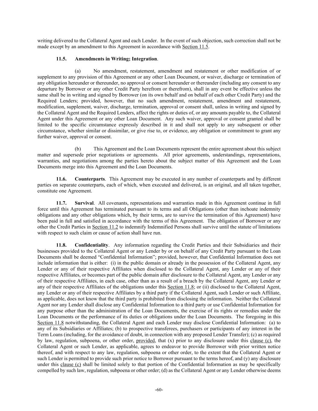 -60- writing delivered to the Collateral Agent and each Lender. In the event of such objection, such correction shall not be made except by an amendment to this Agreement in accordance with Section 11.5. 11.5. Amendments in Writing; Integration. (a) No amendment, restatement, amendment and restatement or other modification of or supplement to any provision of this Agreement or any other Loan Document, or waiver, discharge or termination of any obligation hereunder or thereunder, no approval or consent hereunder or thereunder (including any consent to any departure by Borrower or any other Credit Party herefrom or therefrom), shall in any event be effective unless the same shall be in writing and signed by Borrower (on its own behalf and on behalf of each other Credit Party) and the Required Lenders; provided, however, that no such amendment, restatement, amendment and restatement, modification, supplement, waiver, discharge, termination, approval or consent shall, unless in writing and signed by the Collateral Agent and the Required Lenders, affect the rights or duties of, or any amounts payable to, the Collateral Agent under this Agreement or any other Loan Document. Any such waiver, approval or consent granted shall be limited to the specific circumstance expressly described in it and shall not apply to any subsequent or other circumstance, whether similar or dissimilar, or give rise to, or evidence, any obligation or commitment to grant any further waiver, approval or consent. (b) This Agreement and the Loan Documents represent the entire agreement about this subject matter and supersede prior negotiations or agreements. All prior agreements, understandings, representations, warranties, and negotiations among the parties hereto about the subject matter of this Agreement and the Loan Documents merge into this Agreement and the Loan Documents. 11.6. Counterparts. This Agreement may be executed in any number of counterparts and by different parties on separate counterparts, each of which, when executed and delivered, is an original, and all taken together, constitute one Agreement. 11.7. Survival. All covenants, representations and warranties made in this Agreement continue in full force until this Agreement has terminated pursuant to its terms and all Obligations (other than inchoate indemnity obligations and any other obligations which, by their terms, are to survive the termination of this Agreement) have been paid in full and satisfied in accordance with the terms of this Agreement. The obligation of Borrower or any other the Credit Parties in Section 11.2 to indemnify Indemnified Persons shall survive until the statute of limitations with respect to such claim or cause of action shall have run. 11.8. Confidentiality. Any information regarding the Credit Parties and their Subsidiaries and their businesses provided to the Collateral Agent or any Lender by or on behalf of any Credit Party pursuant to the Loan Documents shall be deemed “Confidential Information”; provided, however, that Confidential Information does not include information that is either: (i) in the public domain or already in the possession of the Collateral Agent, any Lender or any of their respective Affiliates when disclosed to the Collateral Agent, any Lender or any of their respective Affiliates, or becomes part of the public domain after disclosure to the Collateral Agent, any Lender or any of their respective Affiliates, in each case, other than as a result of a breach by the Collateral Agent, any Lender or any of their respective Affiliates of the obligations under this Section 11.8; or (ii) disclosed to the Collateral Agent, any Lender or any of their respective Affiliates by a third party if the Collateral Agent, such Lender or such Affiliate, as applicable, does not know that the third party is prohibited from disclosing the information. Neither the Collateral Agent nor any Lender shall disclose any Confidential Information to a third party or use Confidential Information for any purpose other than the administration of the Loan Documents, the exercise of its rights or remedies under the Loan Documents or the performance of its duties or obligations under the Loan Documents. The foregoing in this Section 11.8 notwithstanding, the Collateral Agent and each Lender may disclose Confidential Information: (a) to any of its Subsidiaries or Affiliates; (b) to prospective transferees, purchasers or participants of any interest in the Term Loans (including, for the avoidance of doubt, in connection with any proposed Lender Transfer); (c) as required by law, regulation, subpoena, or other order, provided, that (x) prior to any disclosure under this clause (c), the Collateral Agent or such Lender, as applicable, agrees to endeavor to provide Borrower with prior written notice thereof, and with respect to any law, regulation, subpoena or other order, to the extent that the Collateral Agent or such Lender is permitted to provide such prior notice to Borrower pursuant to the terms hereof, and (y) any disclosure under this clause (c) shall be limited solely to that portion of the Confidential Information as may be specifically compelled by such law, regulation, subpoena or other order; (d) as the Collateral Agent or any Lender otherwise deems