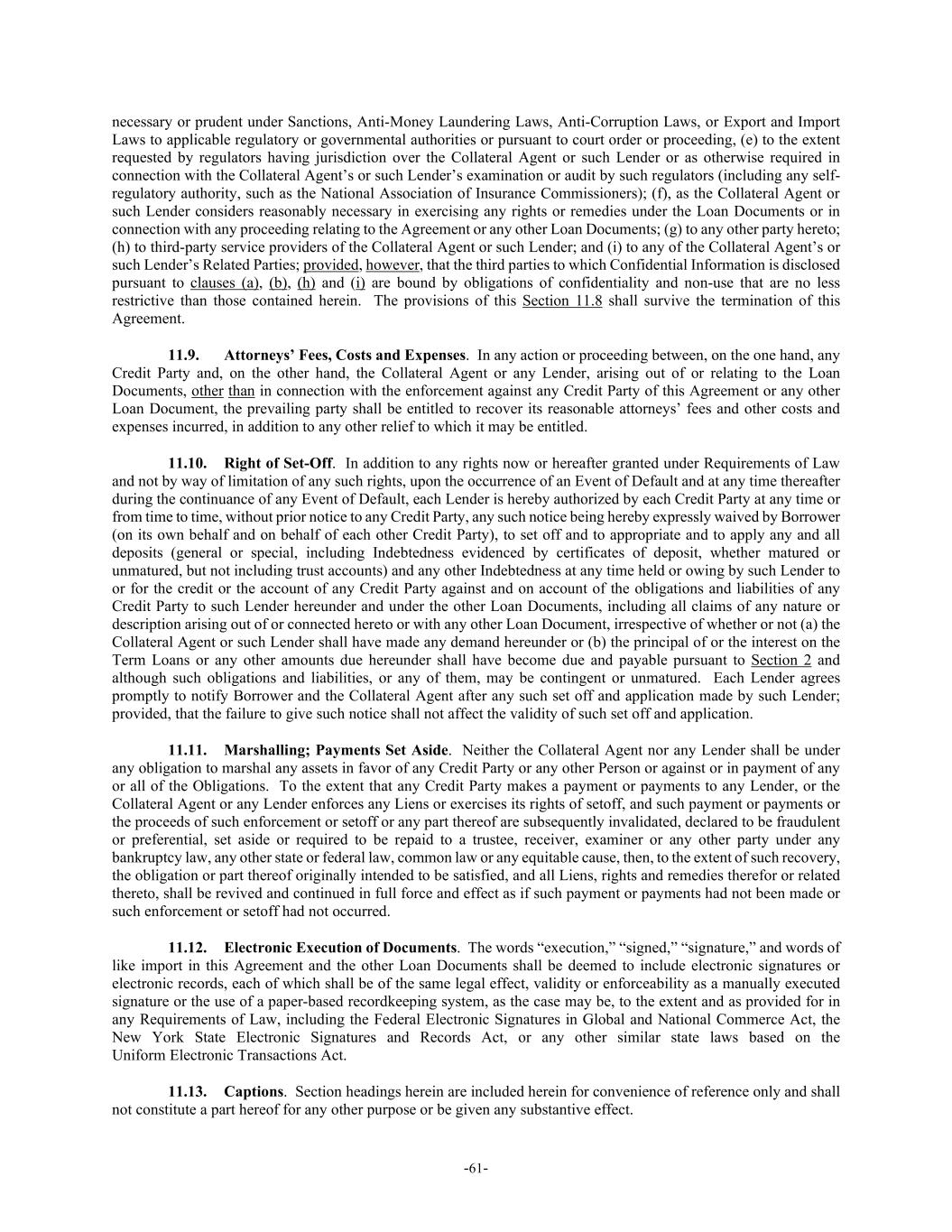 -61- necessary or prudent under Sanctions, Anti-Money Laundering Laws, Anti-Corruption Laws, or Export and Import Laws to applicable regulatory or governmental authorities or pursuant to court order or proceeding, (e) to the extent requested by regulators having jurisdiction over the Collateral Agent or such Lender or as otherwise required in connection with the Collateral Agent’s or such Lender’s examination or audit by such regulators (including any self- regulatory authority, such as the National Association of Insurance Commissioners); (f), as the Collateral Agent or such Lender considers reasonably necessary in exercising any rights or remedies under the Loan Documents or in connection with any proceeding relating to the Agreement or any other Loan Documents; (g) to any other party hereto; (h) to third-party service providers of the Collateral Agent or such Lender; and (i) to any of the Collateral Agent’s or such Lender’s Related Parties; provided, however, that the third parties to which Confidential Information is disclosed pursuant to clauses (a), (b), (h) and (i) are bound by obligations of confidentiality and non-use that are no less restrictive than those contained herein. The provisions of this Section 11.8 shall survive the termination of this Agreement. 11.9. Attorneys’ Fees, Costs and Expenses. In any action or proceeding between, on the one hand, any Credit Party and, on the other hand, the Collateral Agent or any Lender, arising out of or relating to the Loan Documents, other than in connection with the enforcement against any Credit Party of this Agreement or any other Loan Document, the prevailing party shall be entitled to recover its reasonable attorneys’ fees and other costs and expenses incurred, in addition to any other relief to which it may be entitled. 11.10. Right of Set-Off. In addition to any rights now or hereafter granted under Requirements of Law and not by way of limitation of any such rights, upon the occurrence of an Event of Default and at any time thereafter during the continuance of any Event of Default, each Lender is hereby authorized by each Credit Party at any time or from time to time, without prior notice to any Credit Party, any such notice being hereby expressly waived by Borrower (on its own behalf and on behalf of each other Credit Party), to set off and to appropriate and to apply any and all deposits (general or special, including Indebtedness evidenced by certificates of deposit, whether matured or unmatured, but not including trust accounts) and any other Indebtedness at any time held or owing by such Lender to or for the credit or the account of any Credit Party against and on account of the obligations and liabilities of any Credit Party to such Lender hereunder and under the other Loan Documents, including all claims of any nature or description arising out of or connected hereto or with any other Loan Document, irrespective of whether or not (a) the Collateral Agent or such Lender shall have made any demand hereunder or (b) the principal of or the interest on the Term Loans or any other amounts due hereunder shall have become due and payable pursuant to Section 2 and although such obligations and liabilities, or any of them, may be contingent or unmatured. Each Lender agrees promptly to notify Borrower and the Collateral Agent after any such set off and application made by such Lender; provided, that the failure to give such notice shall not affect the validity of such set off and application. 11.11. Marshalling; Payments Set Aside. Neither the Collateral Agent nor any Lender shall be under any obligation to marshal any assets in favor of any Credit Party or any other Person or against or in payment of any or all of the Obligations. To the extent that any Credit Party makes a payment or payments to any Lender, or the Collateral Agent or any Lender enforces any Liens or exercises its rights of setoff, and such payment or payments or the proceeds of such enforcement or setoff or any part thereof are subsequently invalidated, declared to be fraudulent or preferential, set aside or required to be repaid to a trustee, receiver, examiner or any other party under any bankruptcy law, any other state or federal law, common law or any equitable cause, then, to the extent of such recovery, the obligation or part thereof originally intended to be satisfied, and all Liens, rights and remedies therefor or related thereto, shall be revived and continued in full force and effect as if such payment or payments had not been made or such enforcement or setoff had not occurred. 11.12. Electronic Execution of Documents. The words “execution,” “signed,” “signature,” and words of like import in this Agreement and the other Loan Documents shall be deemed to include electronic signatures or electronic records, each of which shall be of the same legal effect, validity or enforceability as a manually executed signature or the use of a paper-based recordkeeping system, as the case may be, to the extent and as provided for in any Requirements of Law, including the Federal Electronic Signatures in Global and National Commerce Act, the New York State Electronic Signatures and Records Act, or any other similar state laws based on the Uniform Electronic Transactions Act. 11.13. Captions. Section headings herein are included herein for convenience of reference only and shall not constitute a part hereof for any other purpose or be given any substantive effect.
