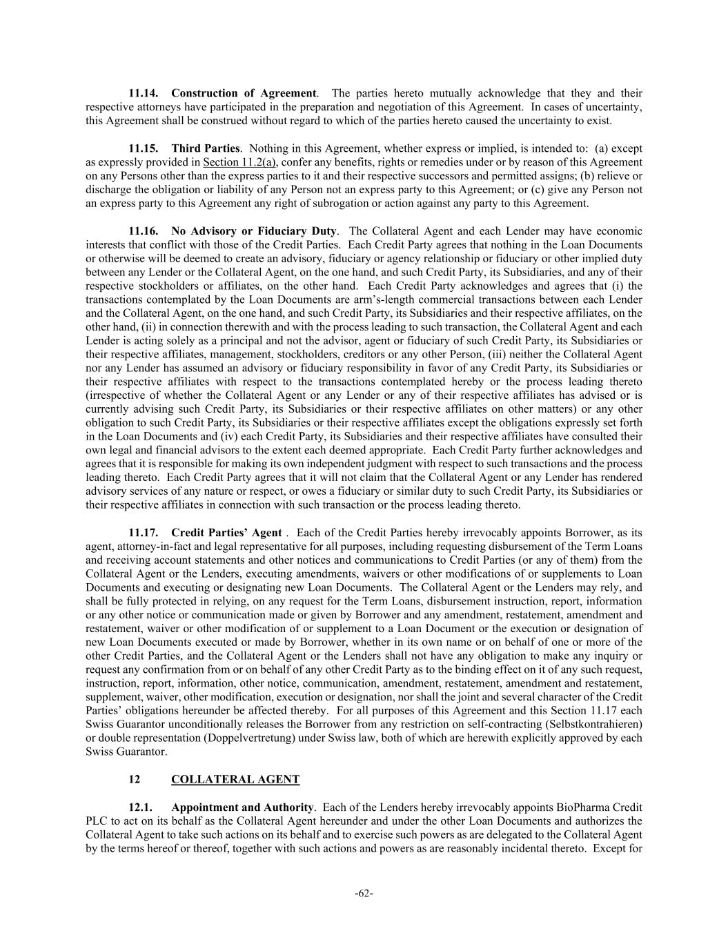 -62- 11.14. Construction of Agreement. The parties hereto mutually acknowledge that they and their respective attorneys have participated in the preparation and negotiation of this Agreement. In cases of uncertainty, this Agreement shall be construed without regard to which of the parties hereto caused the uncertainty to exist. 11.15. Third Parties. Nothing in this Agreement, whether express or implied, is intended to: (a) except as expressly provided in Section 11.2(a), confer any benefits, rights or remedies under or by reason of this Agreement on any Persons other than the express parties to it and their respective successors and permitted assigns; (b) relieve or discharge the obligation or liability of any Person not an express party to this Agreement; or (c) give any Person not an express party to this Agreement any right of subrogation or action against any party to this Agreement. 11.16. No Advisory or Fiduciary Duty. The Collateral Agent and each Lender may have economic interests that conflict with those of the Credit Parties. Each Credit Party agrees that nothing in the Loan Documents or otherwise will be deemed to create an advisory, fiduciary or agency relationship or fiduciary or other implied duty between any Lender or the Collateral Agent, on the one hand, and such Credit Party, its Subsidiaries, and any of their respective stockholders or affiliates, on the other hand. Each Credit Party acknowledges and agrees that (i) the transactions contemplated by the Loan Documents are arm’s-length commercial transactions between each Lender and the Collateral Agent, on the one hand, and such Credit Party, its Subsidiaries and their respective affiliates, on the other hand, (ii) in connection therewith and with the process leading to such transaction, the Collateral Agent and each Lender is acting solely as a principal and not the advisor, agent or fiduciary of such Credit Party, its Subsidiaries or their respective affiliates, management, stockholders, creditors or any other Person, (iii) neither the Collateral Agent nor any Lender has assumed an advisory or fiduciary responsibility in favor of any Credit Party, its Subsidiaries or their respective affiliates with respect to the transactions contemplated hereby or the process leading thereto (irrespective of whether the Collateral Agent or any Lender or any of their respective affiliates has advised or is currently advising such Credit Party, its Subsidiaries or their respective affiliates on other matters) or any other obligation to such Credit Party, its Subsidiaries or their respective affiliates except the obligations expressly set forth in the Loan Documents and (iv) each Credit Party, its Subsidiaries and their respective affiliates have consulted their own legal and financial advisors to the extent each deemed appropriate. Each Credit Party further acknowledges and agrees that it is responsible for making its own independent judgment with respect to such transactions and the process leading thereto. Each Credit Party agrees that it will not claim that the Collateral Agent or any Lender has rendered advisory services of any nature or respect, or owes a fiduciary or similar duty to such Credit Party, its Subsidiaries or their respective affiliates in connection with such transaction or the process leading thereto. 11.17. Credit Parties’ Agent . Each of the Credit Parties hereby irrevocably appoints Borrower, as its agent, attorney-in-fact and legal representative for all purposes, including requesting disbursement of the Term Loans and receiving account statements and other notices and communications to Credit Parties (or any of them) from the Collateral Agent or the Lenders, executing amendments, waivers or other modifications of or supplements to Loan Documents and executing or designating new Loan Documents. The Collateral Agent or the Lenders may rely, and shall be fully protected in relying, on any request for the Term Loans, disbursement instruction, report, information or any other notice or communication made or given by Borrower and any amendment, restatement, amendment and restatement, waiver or other modification of or supplement to a Loan Document or the execution or designation of new Loan Documents executed or made by Borrower, whether in its own name or on behalf of one or more of the other Credit Parties, and the Collateral Agent or the Lenders shall not have any obligation to make any inquiry or request any confirmation from or on behalf of any other Credit Party as to the binding effect on it of any such request, instruction, report, information, other notice, communication, amendment, restatement, amendment and restatement, supplement, waiver, other modification, execution or designation, nor shall the joint and several character of the Credit Parties’ obligations hereunder be affected thereby. For all purposes of this Agreement and this Section 11.17 each Swiss Guarantor unconditionally releases the Borrower from any restriction on self-contracting (Selbstkontrahieren) or double representation (Doppelvertretung) under Swiss law, both of which are herewith explicitly approved by each Swiss Guarantor. 12 COLLATERAL AGENT 12.1. Appointment and Authority. Each of the Lenders hereby irrevocably appoints BioPharma Credit PLC to act on its behalf as the Collateral Agent hereunder and under the other Loan Documents and authorizes the Collateral Agent to take such actions on its behalf and to exercise such powers as are delegated to the Collateral Agent by the terms hereof or thereof, together with such actions and powers as are reasonably incidental thereto. Except for