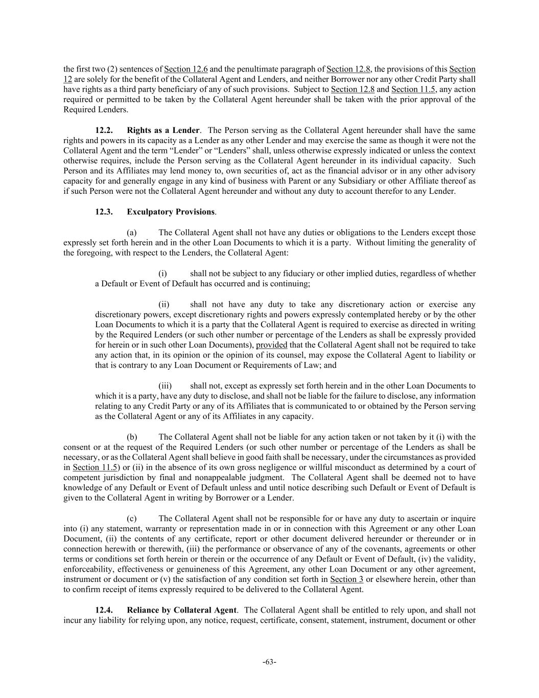 -63- the first two (2) sentences of Section 12.6 and the penultimate paragraph of Section 12.8, the provisions of this Section 12 are solely for the benefit of the Collateral Agent and Lenders, and neither Borrower nor any other Credit Party shall have rights as a third party beneficiary of any of such provisions. Subject to Section 12.8 and Section 11.5, any action required or permitted to be taken by the Collateral Agent hereunder shall be taken with the prior approval of the Required Lenders. 12.2. Rights as a Lender. The Person serving as the Collateral Agent hereunder shall have the same rights and powers in its capacity as a Lender as any other Lender and may exercise the same as though it were not the Collateral Agent and the term “Lender” or “Lenders” shall, unless otherwise expressly indicated or unless the context otherwise requires, include the Person serving as the Collateral Agent hereunder in its individual capacity. Such Person and its Affiliates may lend money to, own securities of, act as the financial advisor or in any other advisory capacity for and generally engage in any kind of business with Parent or any Subsidiary or other Affiliate thereof as if such Person were not the Collateral Agent hereunder and without any duty to account therefor to any Lender. 12.3. Exculpatory Provisions. (a) The Collateral Agent shall not have any duties or obligations to the Lenders except those expressly set forth herein and in the other Loan Documents to which it is a party. Without limiting the generality of the foregoing, with respect to the Lenders, the Collateral Agent: (i) shall not be subject to any fiduciary or other implied duties, regardless of whether a Default or Event of Default has occurred and is continuing; (ii) shall not have any duty to take any discretionary action or exercise any discretionary powers, except discretionary rights and powers expressly contemplated hereby or by the other Loan Documents to which it is a party that the Collateral Agent is required to exercise as directed in writing by the Required Lenders (or such other number or percentage of the Lenders as shall be expressly provided for herein or in such other Loan Documents), provided that the Collateral Agent shall not be required to take any action that, in its opinion or the opinion of its counsel, may expose the Collateral Agent to liability or that is contrary to any Loan Document or Requirements of Law; and (iii) shall not, except as expressly set forth herein and in the other Loan Documents to which it is a party, have any duty to disclose, and shall not be liable for the failure to disclose, any information relating to any Credit Party or any of its Affiliates that is communicated to or obtained by the Person serving as the Collateral Agent or any of its Affiliates in any capacity. (b) The Collateral Agent shall not be liable for any action taken or not taken by it (i) with the consent or at the request of the Required Lenders (or such other number or percentage of the Lenders as shall be necessary, or as the Collateral Agent shall believe in good faith shall be necessary, under the circumstances as provided in Section 11.5) or (ii) in the absence of its own gross negligence or willful misconduct as determined by a court of competent jurisdiction by final and nonappealable judgment. The Collateral Agent shall be deemed not to have knowledge of any Default or Event of Default unless and until notice describing such Default or Event of Default is given to the Collateral Agent in writing by Borrower or a Lender. (c) The Collateral Agent shall not be responsible for or have any duty to ascertain or inquire into (i) any statement, warranty or representation made in or in connection with this Agreement or any other Loan Document, (ii) the contents of any certificate, report or other document delivered hereunder or thereunder or in connection herewith or therewith, (iii) the performance or observance of any of the covenants, agreements or other terms or conditions set forth herein or therein or the occurrence of any Default or Event of Default, (iv) the validity, enforceability, effectiveness or genuineness of this Agreement, any other Loan Document or any other agreement, instrument or document or (v) the satisfaction of any condition set forth in Section 3 or elsewhere herein, other than to confirm receipt of items expressly required to be delivered to the Collateral Agent. 12.4. Reliance by Collateral Agent. The Collateral Agent shall be entitled to rely upon, and shall not incur any liability for relying upon, any notice, request, certificate, consent, statement, instrument, document or other