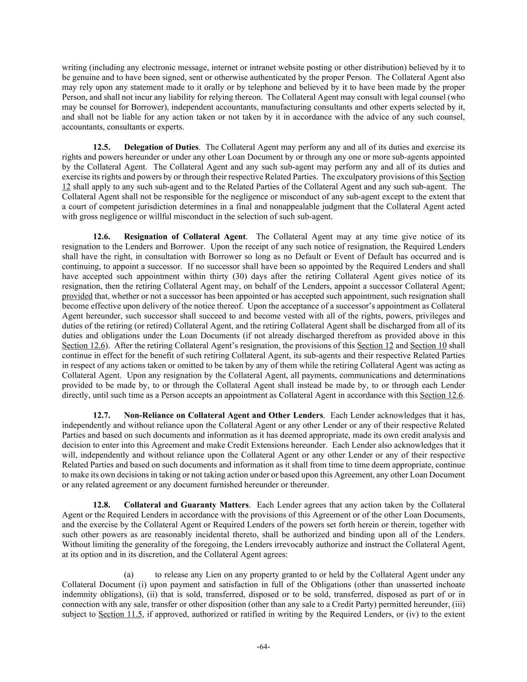 -64- writing (including any electronic message, internet or intranet website posting or other distribution) believed by it to be genuine and to have been signed, sent or otherwise authenticated by the proper Person. The Collateral Agent also may rely upon any statement made to it orally or by telephone and believed by it to have been made by the proper Person, and shall not incur any liability for relying thereon. The Collateral Agent may consult with legal counsel (who may be counsel for Borrower), independent accountants, manufacturing consultants and other experts selected by it, and shall not be liable for any action taken or not taken by it in accordance with the advice of any such counsel, accountants, consultants or experts. 12.5. Delegation of Duties. The Collateral Agent may perform any and all of its duties and exercise its rights and powers hereunder or under any other Loan Document by or through any one or more sub-agents appointed by the Collateral Agent. The Collateral Agent and any such sub-agent may perform any and all of its duties and exercise its rights and powers by or through their respective Related Parties. The exculpatory provisions of this Section 12 shall apply to any such sub-agent and to the Related Parties of the Collateral Agent and any such sub-agent. The Collateral Agent shall not be responsible for the negligence or misconduct of any sub-agent except to the extent that a court of competent jurisdiction determines in a final and nonappealable judgment that the Collateral Agent acted with gross negligence or willful misconduct in the selection of such sub-agent. 12.6. Resignation of Collateral Agent. The Collateral Agent may at any time give notice of its resignation to the Lenders and Borrower. Upon the receipt of any such notice of resignation, the Required Lenders shall have the right, in consultation with Borrower so long as no Default or Event of Default has occurred and is continuing, to appoint a successor. If no successor shall have been so appointed by the Required Lenders and shall have accepted such appointment within thirty (30) days after the retiring Collateral Agent gives notice of its resignation, then the retiring Collateral Agent may, on behalf of the Lenders, appoint a successor Collateral Agent; provided that, whether or not a successor has been appointed or has accepted such appointment, such resignation shall become effective upon delivery of the notice thereof. Upon the acceptance of a successor’s appointment as Collateral Agent hereunder, such successor shall succeed to and become vested with all of the rights, powers, privileges and duties of the retiring (or retired) Collateral Agent, and the retiring Collateral Agent shall be discharged from all of its duties and obligations under the Loan Documents (if not already discharged therefrom as provided above in this Section 12.6). After the retiring Collateral Agent’s resignation, the provisions of this Section 12 and Section 10 shall continue in effect for the benefit of such retiring Collateral Agent, its sub-agents and their respective Related Parties in respect of any actions taken or omitted to be taken by any of them while the retiring Collateral Agent was acting as Collateral Agent. Upon any resignation by the Collateral Agent, all payments, communications and determinations provided to be made by, to or through the Collateral Agent shall instead be made by, to or through each Lender directly, until such time as a Person accepts an appointment as Collateral Agent in accordance with this Section 12.6. 12.7. Non-Reliance on Collateral Agent and Other Lenders. Each Lender acknowledges that it has, independently and without reliance upon the Collateral Agent or any other Lender or any of their respective Related Parties and based on such documents and information as it has deemed appropriate, made its own credit analysis and decision to enter into this Agreement and make Credit Extensions hereunder. Each Lender also acknowledges that it will, independently and without reliance upon the Collateral Agent or any other Lender or any of their respective Related Parties and based on such documents and information as it shall from time to time deem appropriate, continue to make its own decisions in taking or not taking action under or based upon this Agreement, any other Loan Document or any related agreement or any document furnished hereunder or thereunder. 12.8. Collateral and Guaranty Matters. Each Lender agrees that any action taken by the Collateral Agent or the Required Lenders in accordance with the provisions of this Agreement or of the other Loan Documents, and the exercise by the Collateral Agent or Required Lenders of the powers set forth herein or therein, together with such other powers as are reasonably incidental thereto, shall be authorized and binding upon all of the Lenders. Without limiting the generality of the foregoing, the Lenders irrevocably authorize and instruct the Collateral Agent, at its option and in its discretion, and the Collateral Agent agrees: (a) to release any Lien on any property granted to or held by the Collateral Agent under any Collateral Document (i) upon payment and satisfaction in full of the Obligations (other than unasserted inchoate indemnity obligations), (ii) that is sold, transferred, disposed or to be sold, transferred, disposed as part of or in connection with any sale, transfer or other disposition (other than any sale to a Credit Party) permitted hereunder, (iii) subject to Section 11.5, if approved, authorized or ratified in writing by the Required Lenders, or (iv) to the extent