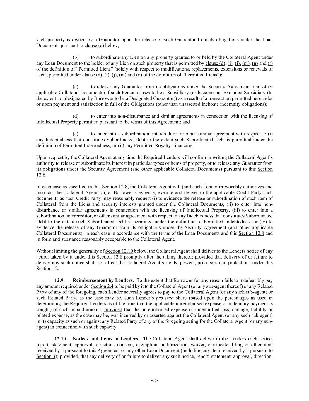 -65- such property is owned by a Guarantor upon the release of such Guarantor from its obligations under the Loan Documents pursuant to clause (c) below; (b) to subordinate any Lien on any property granted to or held by the Collateral Agent under any Loan Document to the holder of any Lien on such property that is permitted by clause (d), (i), (j), (m), (n) and (r) of the definition of “Permitted Liens” (solely with respect to modifications, replacements, extensions or renewals of Liens permitted under clause (d), (i), (j), (m) and (n) of the definition of “Permitted Liens”); (c) to release any Guarantor from its obligations under the Security Agreement (and other applicable Collateral Documents) if such Person ceases to be a Subsidiary (or becomes an Excluded Subsidiary (to the extent not designated by Borrower to be a Designated Guarantor)) as a result of a transaction permitted hereunder or upon payment and satisfaction in full of the Obligations (other than unasserted inchoate indemnity obligations); (d) to enter into non-disturbance and similar agreements in connection with the licensing of Intellectual Property permitted pursuant to the terms of this Agreement; and (e) to enter into a subordination, intercreditor, or other similar agreement with respect to (i) any Indebtedness that constitutes Subordinated Debt to the extent such Subordinated Debt is permitted under the definition of Permitted Indebtedness, or (ii) any Permitted Royalty Financing. Upon request by the Collateral Agent at any time the Required Lenders will confirm in writing the Collateral Agent’s authority to release or subordinate its interest in particular types or items of property, or to release any Guarantor from its obligations under the Security Agreement (and other applicable Collateral Documents) pursuant to this Section 12.8. In each case as specified in this Section 12.8, the Collateral Agent will (and each Lender irrevocably authorizes and instructs the Collateral Agent to), at Borrower’s expense, execute and deliver to the applicable Credit Party such documents as such Credit Party may reasonably request (i) to evidence the release or subordination of such item of Collateral from the Liens and security interests granted under the Collateral Documents, (ii) to enter into non- disturbance or similar agreements in connection with the licensing of Intellectual Property, (iii) to enter into a subordination, intercreditor, or other similar agreement with respect to any Indebtedness that constitutes Subordinated Debt to the extent such Subordinated Debt is permitted under the definition of Permitted Indebtedness or (iv) to evidence the release of any Guarantor from its obligations under the Security Agreement (and other applicable Collateral Documents), in each case in accordance with the terms of the Loan Documents and this Section 12.8 and in form and substance reasonably acceptable to the Collateral Agent. Without limiting the generality of Section 12.10 below, the Collateral Agent shall deliver to the Lenders notice of any action taken by it under this Section 12.8 promptly after the taking thereof; provided that delivery of or failure to deliver any such notice shall not affect the Collateral Agent’s rights, powers, privileges and protections under this Section 12. 12.9. Reimbursement by Lenders. To the extent that Borrower for any reason fails to indefeasibly pay any amount required under Section 2.4 to be paid by it to the Collateral Agent (or any sub-agent thereof) or any Related Party of any of the foregoing, each Lender severally agrees to pay to the Collateral Agent (or any such sub-agent) or such Related Party, as the case may be, such Lender’s pro rata share (based upon the percentages as used in determining the Required Lenders as of the time that the applicable unreimbursed expense or indemnity payment is sought) of such unpaid amount; provided that the unreimbursed expense or indemnified loss, damage, liability or related expense, as the case may be, was incurred by or asserted against the Collateral Agent (or any such sub-agent) in its capacity as such or against any Related Party of any of the foregoing acting for the Collateral Agent (or any sub- agent) in connection with such capacity. 12.10. Notices and Items to Lenders. The Collateral Agent shall deliver to the Lenders each notice, report, statement, approval, direction, consent, exemption, authorization, waiver, certificate, filing or other item received by it pursuant to this Agreement or any other Loan Document (including any item received by it pursuant to Section 3); provided, that any delivery of or failure to deliver any such notice, report, statement, approval, direction,