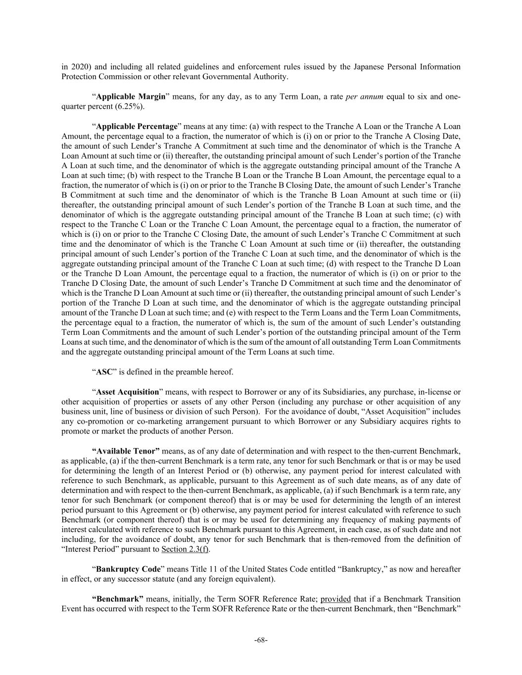 -68- in 2020) and including all related guidelines and enforcement rules issued by the Japanese Personal Information Protection Commission or other relevant Governmental Authority. “Applicable Margin” means, for any day, as to any Term Loan, a rate per annum equal to six and one- quarter percent (6.25%). “Applicable Percentage” means at any time: (a) with respect to the Tranche A Loan or the Tranche A Loan Amount, the percentage equal to a fraction, the numerator of which is (i) on or prior to the Tranche A Closing Date, the amount of such Lender’s Tranche A Commitment at such time and the denominator of which is the Tranche A Loan Amount at such time or (ii) thereafter, the outstanding principal amount of such Lender’s portion of the Tranche A Loan at such time, and the denominator of which is the aggregate outstanding principal amount of the Tranche A Loan at such time; (b) with respect to the Tranche B Loan or the Tranche B Loan Amount, the percentage equal to a fraction, the numerator of which is (i) on or prior to the Tranche B Closing Date, the amount of such Lender’s Tranche B Commitment at such time and the denominator of which is the Tranche B Loan Amount at such time or (ii) thereafter, the outstanding principal amount of such Lender’s portion of the Tranche B Loan at such time, and the denominator of which is the aggregate outstanding principal amount of the Tranche B Loan at such time; (c) with respect to the Tranche C Loan or the Tranche C Loan Amount, the percentage equal to a fraction, the numerator of which is (i) on or prior to the Tranche C Closing Date, the amount of such Lender’s Tranche C Commitment at such time and the denominator of which is the Tranche C Loan Amount at such time or (ii) thereafter, the outstanding principal amount of such Lender’s portion of the Tranche C Loan at such time, and the denominator of which is the aggregate outstanding principal amount of the Tranche C Loan at such time; (d) with respect to the Tranche D Loan or the Tranche D Loan Amount, the percentage equal to a fraction, the numerator of which is (i) on or prior to the Tranche D Closing Date, the amount of such Lender’s Tranche D Commitment at such time and the denominator of which is the Tranche D Loan Amount at such time or (ii) thereafter, the outstanding principal amount of such Lender’s portion of the Tranche D Loan at such time, and the denominator of which is the aggregate outstanding principal amount of the Tranche D Loan at such time; and (e) with respect to the Term Loans and the Term Loan Commitments, the percentage equal to a fraction, the numerator of which is, the sum of the amount of such Lender’s outstanding Term Loan Commitments and the amount of such Lender’s portion of the outstanding principal amount of the Term Loans at such time, and the denominator of which is the sum of the amount of all outstanding Term Loan Commitments and the aggregate outstanding principal amount of the Term Loans at such time. “ASC” is defined in the preamble hereof. “Asset Acquisition” means, with respect to Borrower or any of its Subsidiaries, any purchase, in-license or other acquisition of properties or assets of any other Person (including any purchase or other acquisition of any business unit, line of business or division of such Person). For the avoidance of doubt, “Asset Acquisition” includes any co-promotion or co-marketing arrangement pursuant to which Borrower or any Subsidiary acquires rights to promote or market the products of another Person. “Available Tenor” means, as of any date of determination and with respect to the then-current Benchmark, as applicable, (a) if the then-current Benchmark is a term rate, any tenor for such Benchmark or that is or may be used for determining the length of an Interest Period or (b) otherwise, any payment period for interest calculated with reference to such Benchmark, as applicable, pursuant to this Agreement as of such date means, as of any date of determination and with respect to the then-current Benchmark, as applicable, (a) if such Benchmark is a term rate, any tenor for such Benchmark (or component thereof) that is or may be used for determining the length of an interest period pursuant to this Agreement or (b) otherwise, any payment period for interest calculated with reference to such Benchmark (or component thereof) that is or may be used for determining any frequency of making payments of interest calculated with reference to such Benchmark pursuant to this Agreement, in each case, as of such date and not including, for the avoidance of doubt, any tenor for such Benchmark that is then-removed from the definition of “Interest Period” pursuant to Section 2.3(f). “Bankruptcy Code” means Title 11 of the United States Code entitled “Bankruptcy,” as now and hereafter in effect, or any successor statute (and any foreign equivalent). “Benchmark” means, initially, the Term SOFR Reference Rate; provided that if a Benchmark Transition Event has occurred with respect to the Term SOFR Reference Rate or the then-current Benchmark, then “Benchmark”