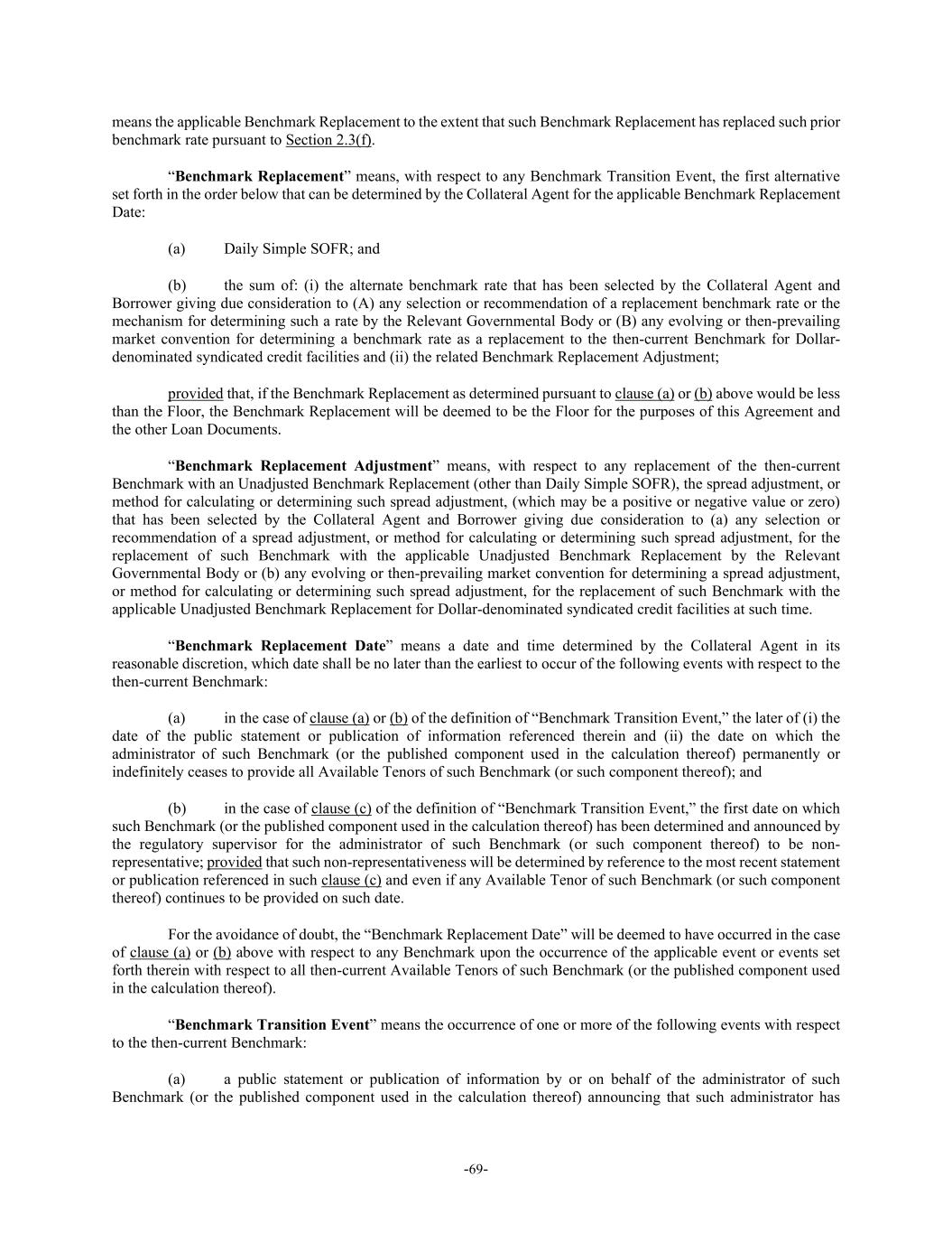 -69- means the applicable Benchmark Replacement to the extent that such Benchmark Replacement has replaced such prior benchmark rate pursuant to Section 2.3(f). “Benchmark Replacement” means, with respect to any Benchmark Transition Event, the first alternative set forth in the order below that can be determined by the Collateral Agent for the applicable Benchmark Replacement Date: (a) Daily Simple SOFR; and (b) the sum of: (i) the alternate benchmark rate that has been selected by the Collateral Agent and Borrower giving due consideration to (A) any selection or recommendation of a replacement benchmark rate or the mechanism for determining such a rate by the Relevant Governmental Body or (B) any evolving or then-prevailing market convention for determining a benchmark rate as a replacement to the then-current Benchmark for Dollar- denominated syndicated credit facilities and (ii) the related Benchmark Replacement Adjustment; provided that, if the Benchmark Replacement as determined pursuant to clause (a) or (b) above would be less than the Floor, the Benchmark Replacement will be deemed to be the Floor for the purposes of this Agreement and the other Loan Documents. “Benchmark Replacement Adjustment” means, with respect to any replacement of the then-current Benchmark with an Unadjusted Benchmark Replacement (other than Daily Simple SOFR), the spread adjustment, or method for calculating or determining such spread adjustment, (which may be a positive or negative value or zero) that has been selected by the Collateral Agent and Borrower giving due consideration to (a) any selection or recommendation of a spread adjustment, or method for calculating or determining such spread adjustment, for the replacement of such Benchmark with the applicable Unadjusted Benchmark Replacement by the Relevant Governmental Body or (b) any evolving or then-prevailing market convention for determining a spread adjustment, or method for calculating or determining such spread adjustment, for the replacement of such Benchmark with the applicable Unadjusted Benchmark Replacement for Dollar-denominated syndicated credit facilities at such time. “Benchmark Replacement Date” means a date and time determined by the Collateral Agent in its reasonable discretion, which date shall be no later than the earliest to occur of the following events with respect to the then-current Benchmark: (a) in the case of clause (a) or (b) of the definition of “Benchmark Transition Event,” the later of (i) the date of the public statement or publication of information referenced therein and (ii) the date on which the administrator of such Benchmark (or the published component used in the calculation thereof) permanently or indefinitely ceases to provide all Available Tenors of such Benchmark (or such component thereof); and (b) in the case of clause (c) of the definition of “Benchmark Transition Event,” the first date on which such Benchmark (or the published component used in the calculation thereof) has been determined and announced by the regulatory supervisor for the administrator of such Benchmark (or such component thereof) to be non- representative; provided that such non-representativeness will be determined by reference to the most recent statement or publication referenced in such clause (c) and even if any Available Tenor of such Benchmark (or such component thereof) continues to be provided on such date. For the avoidance of doubt, the “Benchmark Replacement Date” will be deemed to have occurred in the case of clause (a) or (b) above with respect to any Benchmark upon the occurrence of the applicable event or events set forth therein with respect to all then-current Available Tenors of such Benchmark (or the published component used in the calculation thereof). “Benchmark Transition Event” means the occurrence of one or more of the following events with respect to the then-current Benchmark: (a) a public statement or publication of information by or on behalf of the administrator of such Benchmark (or the published component used in the calculation thereof) announcing that such administrator has