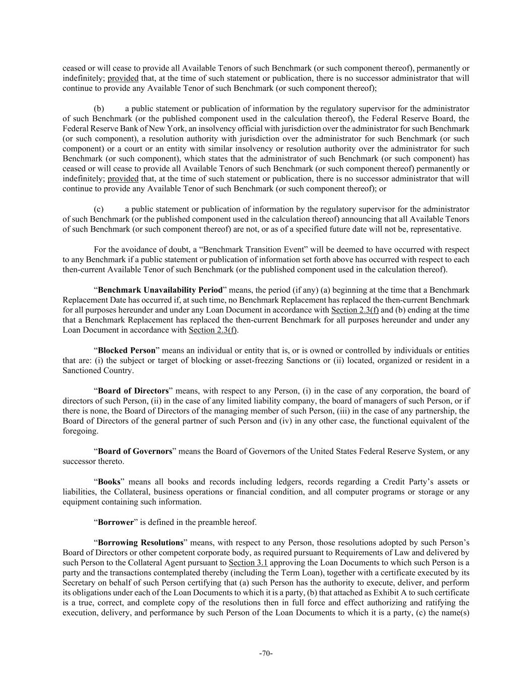 -70- ceased or will cease to provide all Available Tenors of such Benchmark (or such component thereof), permanently or indefinitely; provided that, at the time of such statement or publication, there is no successor administrator that will continue to provide any Available Tenor of such Benchmark (or such component thereof); (b) a public statement or publication of information by the regulatory supervisor for the administrator of such Benchmark (or the published component used in the calculation thereof), the Federal Reserve Board, the Federal Reserve Bank of New York, an insolvency official with jurisdiction over the administrator for such Benchmark (or such component), a resolution authority with jurisdiction over the administrator for such Benchmark (or such component) or a court or an entity with similar insolvency or resolution authority over the administrator for such Benchmark (or such component), which states that the administrator of such Benchmark (or such component) has ceased or will cease to provide all Available Tenors of such Benchmark (or such component thereof) permanently or indefinitely; provided that, at the time of such statement or publication, there is no successor administrator that will continue to provide any Available Tenor of such Benchmark (or such component thereof); or (c) a public statement or publication of information by the regulatory supervisor for the administrator of such Benchmark (or the published component used in the calculation thereof) announcing that all Available Tenors of such Benchmark (or such component thereof) are not, or as of a specified future date will not be, representative. For the avoidance of doubt, a “Benchmark Transition Event” will be deemed to have occurred with respect to any Benchmark if a public statement or publication of information set forth above has occurred with respect to each then-current Available Tenor of such Benchmark (or the published component used in the calculation thereof). “Benchmark Unavailability Period” means, the period (if any) (a) beginning at the time that a Benchmark Replacement Date has occurred if, at such time, no Benchmark Replacement has replaced the then-current Benchmark for all purposes hereunder and under any Loan Document in accordance with Section 2.3(f) and (b) ending at the time that a Benchmark Replacement has replaced the then-current Benchmark for all purposes hereunder and under any Loan Document in accordance with Section 2.3(f). “Blocked Person” means an individual or entity that is, or is owned or controlled by individuals or entities that are: (i) the subject or target of blocking or asset-freezing Sanctions or (ii) located, organized or resident in a Sanctioned Country. “Board of Directors” means, with respect to any Person, (i) in the case of any corporation, the board of directors of such Person, (ii) in the case of any limited liability company, the board of managers of such Person, or if there is none, the Board of Directors of the managing member of such Person, (iii) in the case of any partnership, the Board of Directors of the general partner of such Person and (iv) in any other case, the functional equivalent of the foregoing. “Board of Governors” means the Board of Governors of the United States Federal Reserve System, or any successor thereto. “Books” means all books and records including ledgers, records regarding a Credit Party’s assets or liabilities, the Collateral, business operations or financial condition, and all computer programs or storage or any equipment containing such information. “Borrower” is defined in the preamble hereof. “Borrowing Resolutions” means, with respect to any Person, those resolutions adopted by such Person’s Board of Directors or other competent corporate body, as required pursuant to Requirements of Law and delivered by such Person to the Collateral Agent pursuant to Section 3.1 approving the Loan Documents to which such Person is a party and the transactions contemplated thereby (including the Term Loan), together with a certificate executed by its Secretary on behalf of such Person certifying that (a) such Person has the authority to execute, deliver, and perform its obligations under each of the Loan Documents to which it is a party, (b) that attached as Exhibit A to such certificate is a true, correct, and complete copy of the resolutions then in full force and effect authorizing and ratifying the execution, delivery, and performance by such Person of the Loan Documents to which it is a party, (c) the name(s)