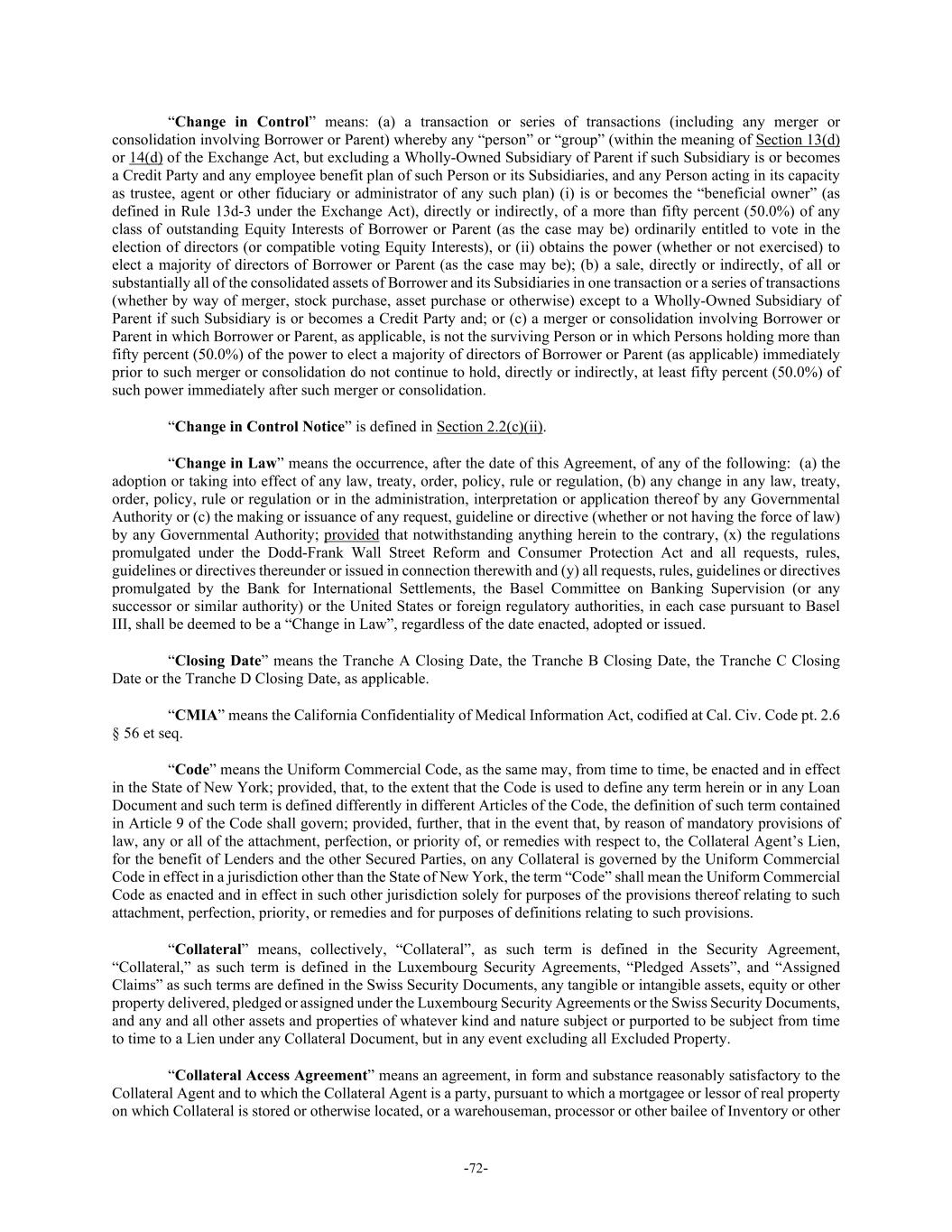 -72- “Change in Control” means: (a) a transaction or series of transactions (including any merger or consolidation involving Borrower or Parent) whereby any “person” or “group” (within the meaning of Section 13(d) or 14(d) of the Exchange Act, but excluding a Wholly-Owned Subsidiary of Parent if such Subsidiary is or becomes a Credit Party and any employee benefit plan of such Person or its Subsidiaries, and any Person acting in its capacity as trustee, agent or other fiduciary or administrator of any such plan) (i) is or becomes the “beneficial owner” (as defined in Rule 13d-3 under the Exchange Act), directly or indirectly, of a more than fifty percent (50.0%) of any class of outstanding Equity Interests of Borrower or Parent (as the case may be) ordinarily entitled to vote in the election of directors (or compatible voting Equity Interests), or (ii) obtains the power (whether or not exercised) to elect a majority of directors of Borrower or Parent (as the case may be); (b) a sale, directly or indirectly, of all or substantially all of the consolidated assets of Borrower and its Subsidiaries in one transaction or a series of transactions (whether by way of merger, stock purchase, asset purchase or otherwise) except to a Wholly-Owned Subsidiary of Parent if such Subsidiary is or becomes a Credit Party and; or (c) a merger or consolidation involving Borrower or Parent in which Borrower or Parent, as applicable, is not the surviving Person or in which Persons holding more than fifty percent (50.0%) of the power to elect a majority of directors of Borrower or Parent (as applicable) immediately prior to such merger or consolidation do not continue to hold, directly or indirectly, at least fifty percent (50.0%) of such power immediately after such merger or consolidation. “Change in Control Notice” is defined in Section 2.2(c)(ii). “Change in Law” means the occurrence, after the date of this Agreement, of any of the following: (a) the adoption or taking into effect of any law, treaty, order, policy, rule or regulation, (b) any change in any law, treaty, order, policy, rule or regulation or in the administration, interpretation or application thereof by any Governmental Authority or (c) the making or issuance of any request, guideline or directive (whether or not having the force of law) by any Governmental Authority; provided that notwithstanding anything herein to the contrary, (x) the regulations promulgated under the Dodd-Frank Wall Street Reform and Consumer Protection Act and all requests, rules, guidelines or directives thereunder or issued in connection therewith and (y) all requests, rules, guidelines or directives promulgated by the Bank for International Settlements, the Basel Committee on Banking Supervision (or any successor or similar authority) or the United States or foreign regulatory authorities, in each case pursuant to Basel III, shall be deemed to be a “Change in Law”, regardless of the date enacted, adopted or issued. “Closing Date” means the Tranche A Closing Date, the Tranche B Closing Date, the Tranche C Closing Date or the Tranche D Closing Date, as applicable. “CMIA” means the California Confidentiality of Medical Information Act, codified at Cal. Civ. Code pt. 2.6 § 56 et seq. “Code” means the Uniform Commercial Code, as the same may, from time to time, be enacted and in effect in the State of New York; provided, that, to the extent that the Code is used to define any term herein or in any Loan Document and such term is defined differently in different Articles of the Code, the definition of such term contained in Article 9 of the Code shall govern; provided, further, that in the event that, by reason of mandatory provisions of law, any or all of the attachment, perfection, or priority of, or remedies with respect to, the Collateral Agent’s Lien, for the benefit of Lenders and the other Secured Parties, on any Collateral is governed by the Uniform Commercial Code in effect in a jurisdiction other than the State of New York, the term “Code” shall mean the Uniform Commercial Code as enacted and in effect in such other jurisdiction solely for purposes of the provisions thereof relating to such attachment, perfection, priority, or remedies and for purposes of definitions relating to such provisions. “Collateral” means, collectively, “Collateral”, as such term is defined in the Security Agreement, “Collateral,” as such term is defined in the Luxembourg Security Agreements, “Pledged Assets”, and “Assigned Claims” as such terms are defined in the Swiss Security Documents, any tangible or intangible assets, equity or other property delivered, pledged or assigned under the Luxembourg Security Agreements or the Swiss Security Documents, and any and all other assets and properties of whatever kind and nature subject or purported to be subject from time to time to a Lien under any Collateral Document, but in any event excluding all Excluded Property. “Collateral Access Agreement” means an agreement, in form and substance reasonably satisfactory to the Collateral Agent and to which the Collateral Agent is a party, pursuant to which a mortgagee or lessor of real property on which Collateral is stored or otherwise located, or a warehouseman, processor or other bailee of Inventory or other