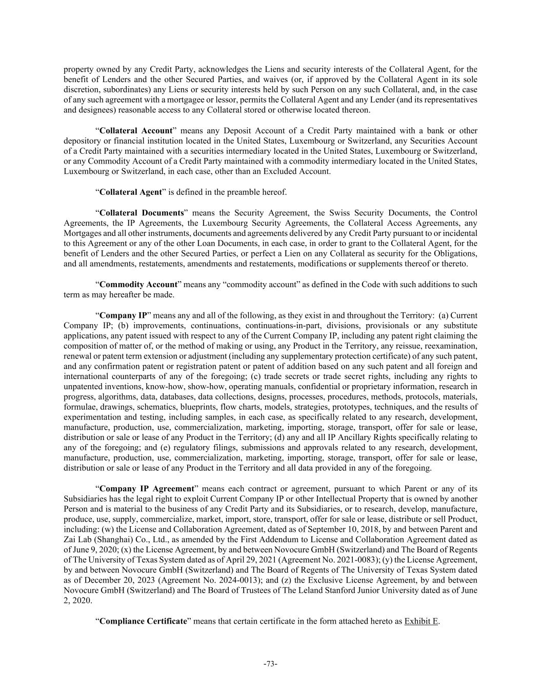 -73- property owned by any Credit Party, acknowledges the Liens and security interests of the Collateral Agent, for the benefit of Lenders and the other Secured Parties, and waives (or, if approved by the Collateral Agent in its sole discretion, subordinates) any Liens or security interests held by such Person on any such Collateral, and, in the case of any such agreement with a mortgagee or lessor, permits the Collateral Agent and any Lender (and its representatives and designees) reasonable access to any Collateral stored or otherwise located thereon. “Collateral Account” means any Deposit Account of a Credit Party maintained with a bank or other depository or financial institution located in the United States, Luxembourg or Switzerland, any Securities Account of a Credit Party maintained with a securities intermediary located in the United States, Luxembourg or Switzerland, or any Commodity Account of a Credit Party maintained with a commodity intermediary located in the United States, Luxembourg or Switzerland, in each case, other than an Excluded Account. “Collateral Agent” is defined in the preamble hereof. “Collateral Documents” means the Security Agreement, the Swiss Security Documents, the Control Agreements, the IP Agreements, the Luxembourg Security Agreements, the Collateral Access Agreements, any Mortgages and all other instruments, documents and agreements delivered by any Credit Party pursuant to or incidental to this Agreement or any of the other Loan Documents, in each case, in order to grant to the Collateral Agent, for the benefit of Lenders and the other Secured Parties, or perfect a Lien on any Collateral as security for the Obligations, and all amendments, restatements, amendments and restatements, modifications or supplements thereof or thereto. “Commodity Account” means any “commodity account” as defined in the Code with such additions to such term as may hereafter be made. “Company IP” means any and all of the following, as they exist in and throughout the Territory: (a) Current Company IP; (b) improvements, continuations, continuations-in-part, divisions, provisionals or any substitute applications, any patent issued with respect to any of the Current Company IP, including any patent right claiming the composition of matter of, or the method of making or using, any Product in the Territory, any reissue, reexamination, renewal or patent term extension or adjustment (including any supplementary protection certificate) of any such patent, and any confirmation patent or registration patent or patent of addition based on any such patent and all foreign and international counterparts of any of the foregoing; (c) trade secrets or trade secret rights, including any rights to unpatented inventions, know-how, show-how, operating manuals, confidential or proprietary information, research in progress, algorithms, data, databases, data collections, designs, processes, procedures, methods, protocols, materials, formulae, drawings, schematics, blueprints, flow charts, models, strategies, prototypes, techniques, and the results of experimentation and testing, including samples, in each case, as specifically related to any research, development, manufacture, production, use, commercialization, marketing, importing, storage, transport, offer for sale or lease, distribution or sale or lease of any Product in the Territory; (d) any and all IP Ancillary Rights specifically relating to any of the foregoing; and (e) regulatory filings, submissions and approvals related to any research, development, manufacture, production, use, commercialization, marketing, importing, storage, transport, offer for sale or lease, distribution or sale or lease of any Product in the Territory and all data provided in any of the foregoing. “Company IP Agreement” means each contract or agreement, pursuant to which Parent or any of its Subsidiaries has the legal right to exploit Current Company IP or other Intellectual Property that is owned by another Person and is material to the business of any Credit Party and its Subsidiaries, or to research, develop, manufacture, produce, use, supply, commercialize, market, import, store, transport, offer for sale or lease, distribute or sell Product, including: (w) the License and Collaboration Agreement, dated as of September 10, 2018, by and between Parent and Zai Lab (Shanghai) Co., Ltd., as amended by the First Addendum to License and Collaboration Agreement dated as of June 9, 2020; (x) the License Agreement, by and between Novocure GmbH (Switzerland) and The Board of Regents of The University of Texas System dated as of April 29, 2021 (Agreement No. 2021-0083); (y) the License Agreement, by and between Novocure GmbH (Switzerland) and The Board of Regents of The University of Texas System dated as of December 20, 2023 (Agreement No. 2024-0013); and (z) the Exclusive License Agreement, by and between Novocure GmbH (Switzerland) and The Board of Trustees of The Leland Stanford Junior University dated as of June 2, 2020. “Compliance Certificate” means that certain certificate in the form attached hereto as Exhibit E.