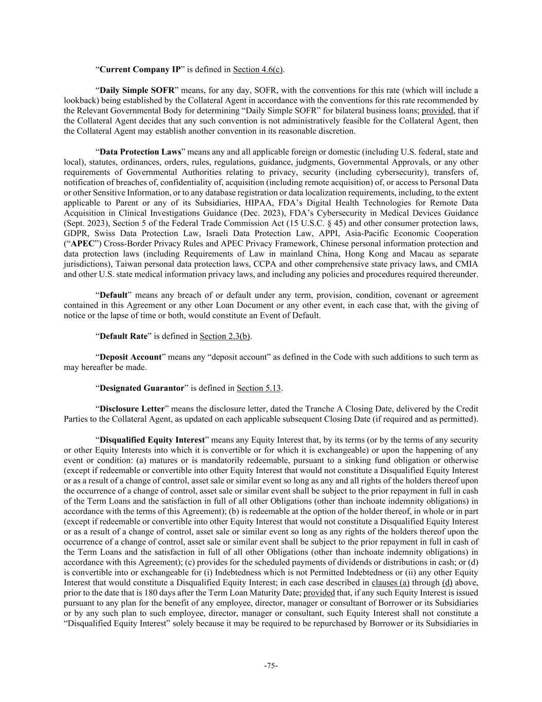 -75- “Current Company IP” is defined in Section 4.6(c). “Daily Simple SOFR” means, for any day, SOFR, with the conventions for this rate (which will include a lookback) being established by the Collateral Agent in accordance with the conventions for this rate recommended by the Relevant Governmental Body for determining “Daily Simple SOFR” for bilateral business loans; provided, that if the Collateral Agent decides that any such convention is not administratively feasible for the Collateral Agent, then the Collateral Agent may establish another convention in its reasonable discretion. “Data Protection Laws” means any and all applicable foreign or domestic (including U.S. federal, state and local), statutes, ordinances, orders, rules, regulations, guidance, judgments, Governmental Approvals, or any other requirements of Governmental Authorities relating to privacy, security (including cybersecurity), transfers of, notification of breaches of, confidentiality of, acquisition (including remote acquisition) of, or access to Personal Data or other Sensitive Information, or to any database registration or data localization requirements, including, to the extent applicable to Parent or any of its Subsidiaries, HIPAA, FDA’s Digital Health Technologies for Remote Data Acquisition in Clinical Investigations Guidance (Dec. 2023), FDA’s Cybersecurity in Medical Devices Guidance (Sept. 2023), Section 5 of the Federal Trade Commission Act (15 U.S.C. § 45) and other consumer protection laws, GDPR, Swiss Data Protection Law, Israeli Data Protection Law, APPI, Asia-Pacific Economic Cooperation (“APEC”) Cross-Border Privacy Rules and APEC Privacy Framework, Chinese personal information protection and data protection laws (including Requirements of Law in mainland China, Hong Kong and Macau as separate jurisdictions), Taiwan personal data protection laws, CCPA and other comprehensive state privacy laws, and CMIA and other U.S. state medical information privacy laws, and including any policies and procedures required thereunder. “Default” means any breach of or default under any term, provision, condition, covenant or agreement contained in this Agreement or any other Loan Document or any other event, in each case that, with the giving of notice or the lapse of time or both, would constitute an Event of Default. “Default Rate” is defined in Section 2.3(b). “Deposit Account” means any “deposit account” as defined in the Code with such additions to such term as may hereafter be made. “Designated Guarantor” is defined in Section 5.13. “Disclosure Letter” means the disclosure letter, dated the Tranche A Closing Date, delivered by the Credit Parties to the Collateral Agent, as updated on each applicable subsequent Closing Date (if required and as permitted). “Disqualified Equity Interest” means any Equity Interest that, by its terms (or by the terms of any security or other Equity Interests into which it is convertible or for which it is exchangeable) or upon the happening of any event or condition: (a) matures or is mandatorily redeemable, pursuant to a sinking fund obligation or otherwise (except if redeemable or convertible into other Equity Interest that would not constitute a Disqualified Equity Interest or as a result of a change of control, asset sale or similar event so long as any and all rights of the holders thereof upon the occurrence of a change of control, asset sale or similar event shall be subject to the prior repayment in full in cash of the Term Loans and the satisfaction in full of all other Obligations (other than inchoate indemnity obligations) in accordance with the terms of this Agreement); (b) is redeemable at the option of the holder thereof, in whole or in part (except if redeemable or convertible into other Equity Interest that would not constitute a Disqualified Equity Interest or as a result of a change of control, asset sale or similar event so long as any rights of the holders thereof upon the occurrence of a change of control, asset sale or similar event shall be subject to the prior repayment in full in cash of the Term Loans and the satisfaction in full of all other Obligations (other than inchoate indemnity obligations) in accordance with this Agreement); (c) provides for the scheduled payments of dividends or distributions in cash; or (d) is convertible into or exchangeable for (i) Indebtedness which is not Permitted Indebtedness or (ii) any other Equity Interest that would constitute a Disqualified Equity Interest; in each case described in clauses (a) through (d) above, prior to the date that is 180 days after the Term Loan Maturity Date; provided that, if any such Equity Interest is issued pursuant to any plan for the benefit of any employee, director, manager or consultant of Borrower or its Subsidiaries or by any such plan to such employee, director, manager or consultant, such Equity Interest shall not constitute a “Disqualified Equity Interest” solely because it may be required to be repurchased by Borrower or its Subsidiaries in