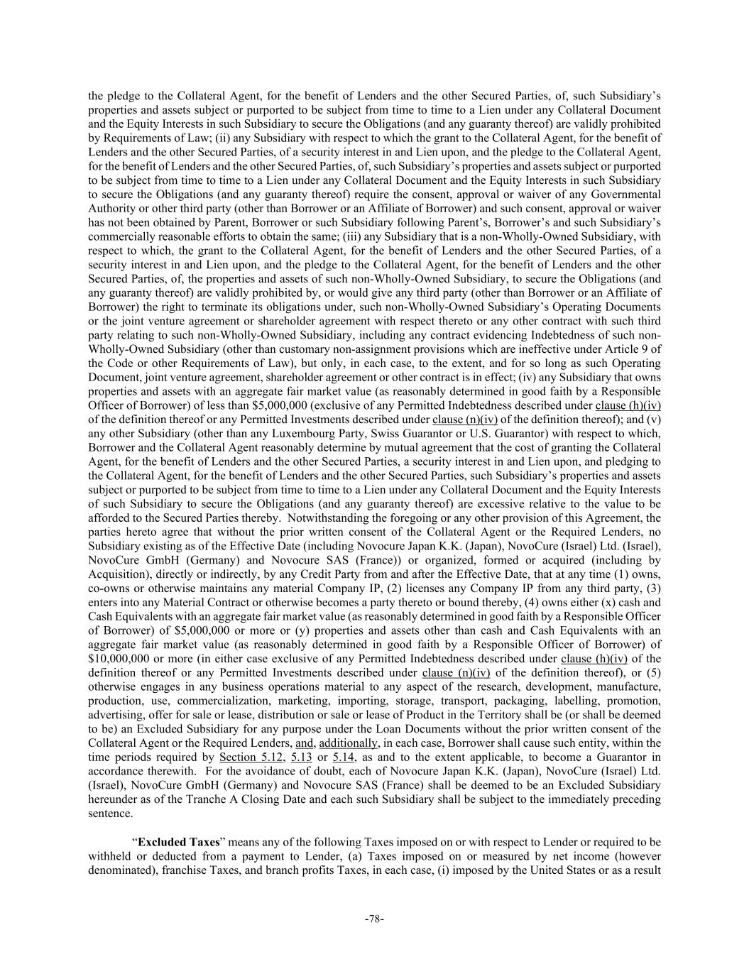 -78- the pledge to the Collateral Agent, for the benefit of Lenders and the other Secured Parties, of, such Subsidiary’s properties and assets subject or purported to be subject from time to time to a Lien under any Collateral Document and the Equity Interests in such Subsidiary to secure the Obligations (and any guaranty thereof) are validly prohibited by Requirements of Law; (ii) any Subsidiary with respect to which the grant to the Collateral Agent, for the benefit of Lenders and the other Secured Parties, of a security interest in and Lien upon, and the pledge to the Collateral Agent, for the benefit of Lenders and the other Secured Parties, of, such Subsidiary’s properties and assets subject or purported to be subject from time to time to a Lien under any Collateral Document and the Equity Interests in such Subsidiary to secure the Obligations (and any guaranty thereof) require the consent, approval or waiver of any Governmental Authority or other third party (other than Borrower or an Affiliate of Borrower) and such consent, approval or waiver has not been obtained by Parent, Borrower or such Subsidiary following Parent’s, Borrower’s and such Subsidiary’s commercially reasonable efforts to obtain the same; (iii) any Subsidiary that is a non-Wholly-Owned Subsidiary, with respect to which, the grant to the Collateral Agent, for the benefit of Lenders and the other Secured Parties, of a security interest in and Lien upon, and the pledge to the Collateral Agent, for the benefit of Lenders and the other Secured Parties, of, the properties and assets of such non-Wholly-Owned Subsidiary, to secure the Obligations (and any guaranty thereof) are validly prohibited by, or would give any third party (other than Borrower or an Affiliate of Borrower) the right to terminate its obligations under, such non-Wholly-Owned Subsidiary’s Operating Documents or the joint venture agreement or shareholder agreement with respect thereto or any other contract with such third party relating to such non-Wholly-Owned Subsidiary, including any contract evidencing Indebtedness of such non- Wholly-Owned Subsidiary (other than customary non-assignment provisions which are ineffective under Article 9 of the Code or other Requirements of Law), but only, in each case, to the extent, and for so long as such Operating Document, joint venture agreement, shareholder agreement or other contract is in effect; (iv) any Subsidiary that owns properties and assets with an aggregate fair market value (as reasonably determined in good faith by a Responsible Officer of Borrower) of less than $5,000,000 (exclusive of any Permitted Indebtedness described under clause (h)(iv) of the definition thereof or any Permitted Investments described under clause (n)(iv) of the definition thereof); and (v) any other Subsidiary (other than any Luxembourg Party, Swiss Guarantor or U.S. Guarantor) with respect to which, Borrower and the Collateral Agent reasonably determine by mutual agreement that the cost of granting the Collateral Agent, for the benefit of Lenders and the other Secured Parties, a security interest in and Lien upon, and pledging to the Collateral Agent, for the benefit of Lenders and the other Secured Parties, such Subsidiary’s properties and assets subject or purported to be subject from time to time to a Lien under any Collateral Document and the Equity Interests of such Subsidiary to secure the Obligations (and any guaranty thereof) are excessive relative to the value to be afforded to the Secured Parties thereby. Notwithstanding the foregoing or any other provision of this Agreement, the parties hereto agree that without the prior written consent of the Collateral Agent or the Required Lenders, no Subsidiary existing as of the Effective Date (including Novocure Japan K.K. (Japan), NovoCure (Israel) Ltd. (Israel), NovoCure GmbH (Germany) and Novocure SAS (France)) or organized, formed or acquired (including by Acquisition), directly or indirectly, by any Credit Party from and after the Effective Date, that at any time (1) owns, co-owns or otherwise maintains any material Company IP, (2) licenses any Company IP from any third party, (3) enters into any Material Contract or otherwise becomes a party thereto or bound thereby, (4) owns either (x) cash and Cash Equivalents with an aggregate fair market value (as reasonably determined in good faith by a Responsible Officer of Borrower) of $5,000,000 or more or (y) properties and assets other than cash and Cash Equivalents with an aggregate fair market value (as reasonably determined in good faith by a Responsible Officer of Borrower) of $10,000,000 or more (in either case exclusive of any Permitted Indebtedness described under clause (h)(iv) of the definition thereof or any Permitted Investments described under clause (n)(iv) of the definition thereof), or (5) otherwise engages in any business operations material to any aspect of the research, development, manufacture, production, use, commercialization, marketing, importing, storage, transport, packaging, labelling, promotion, advertising, offer for sale or lease, distribution or sale or lease of Product in the Territory shall be (or shall be deemed to be) an Excluded Subsidiary for any purpose under the Loan Documents without the prior written consent of the Collateral Agent or the Required Lenders, and, additionally, in each case, Borrower shall cause such entity, within the time periods required by Section 5.12, 5.13 or 5.14, as and to the extent applicable, to become a Guarantor in accordance therewith. For the avoidance of doubt, each of Novocure Japan K.K. (Japan), NovoCure (Israel) Ltd. (Israel), NovoCure GmbH (Germany) and Novocure SAS (France) shall be deemed to be an Excluded Subsidiary hereunder as of the Tranche A Closing Date and each such Subsidiary shall be subject to the immediately preceding sentence. “Excluded Taxes” means any of the following Taxes imposed on or with respect to Lender or requi