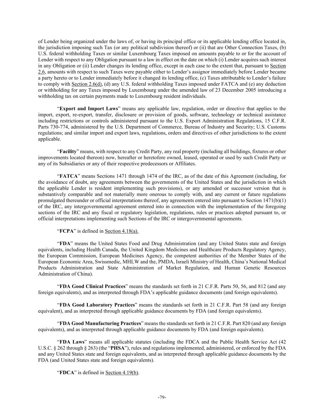 -79- of Lender being organized under the laws of, or having its principal office or its applicable lending office located in, the jurisdiction imposing such Tax (or any political subdivision thereof) or (ii) that are Other Connection Taxes, (b) U.S. federal withholding Taxes or similar Luxembourg Taxes imposed on amounts payable to or for the account of Lender with respect to any Obligation pursuant to a law in effect on the date on which (i) Lender acquires such interest in any Obligation or (ii) Lender changes its lending office, except in each case to the extent that, pursuant to Section 2.6, amounts with respect to such Taxes were payable either to Lender’s assignor immediately before Lender became a party hereto or to Lender immediately before it changed its lending office, (c) Taxes attributable to Lender’s failure to comply with Section 2.6(d), (d) any U.S. federal withholding Taxes imposed under FATCA and (e) any deduction or withholding for any Taxes imposed by Luxembourg under the amended law of 23 December 2005 introducing a withholding tax on certain payments made to Luxembourg resident individuals. “Export and Import Laws” means any applicable law, regulation, order or directive that applies to the import, export, re-export, transfer, disclosure or provision of goods, software, technology or technical assistance including restrictions or controls administered pursuant to the U.S. Export Administration Regulations, 15 C.F.R. Parts 730-774, administered by the U.S. Department of Commerce, Bureau of Industry and Security; U.S. Customs regulations; and similar import and export laws, regulations, orders and directives of other jurisdictions to the extent applicable. “Facility” means, with respect to any Credit Party, any real property (including all buildings, fixtures or other improvements located thereon) now, hereafter or heretofore owned, leased, operated or used by such Credit Party or any of its Subsidiaries or any of their respective predecessors or Affiliates. “FATCA” means Sections 1471 through 1474 of the IRC, as of the date of this Agreement (including, for the avoidance of doubt, any agreements between the governments of the United States and the jurisdiction in which the applicable Lender is resident implementing such provisions), or any amended or successor version that is substantively comparable and not materially more onerous to comply with, and any current or future regulations promulgated thereunder or official interpretations thereof, any agreements entered into pursuant to Section 1471(b)(1) of the IRC, any intergovernmental agreement entered into in connection with the implementation of the foregoing sections of the IRC and any fiscal or regulatory legislation, regulations, rules or practices adopted pursuant to, or official interpretations implementing such Sections of the IRC or intergovernmental agreements. “FCPA” is defined in Section 4.18(a). “FDA” means the United States Food and Drug Administration (and any United States state and foreign equivalents, including Health Canada, the United Kingdom Medicines and Healthcare Products Regulatory Agency, the European Commission, European Medicines Agency, the competent authorities of the Member States of the European Economic Area, Swissmedic, MHLW and the, PMDA, Israeli Ministry of Health, China’s National Medical Products Administration and State Administration of Market Regulation, and Human Genetic Resources Administration of China). “FDA Good Clinical Practices” means the standards set forth in 21 C.F.R. Parts 50, 56, and 812 (and any foreign equivalents), and as interpreted through FDA’s applicable guidance documents (and foreign equivalents). “FDA Good Laboratory Practices” means the standards set forth in 21 C.F.R. Part 58 (and any foreign equivalent), and as interpreted through applicable guidance documents by FDA (and foreign equivalents). “FDA Good Manufacturing Practices” means the standards set forth in 21 C.F.R. Part 820 (and any foreign equivalents), and as interpreted through applicable guidance documents by FDA (and foreign equivalents). “FDA Laws” means all applicable statutes (including the FDCA and the Public Health Service Act (42 U.S.C. § 262 through § 263) (the “PHSA”), rules and regulations implemented, administered, or enforced by the FDA and any United States state and foreign equivalents, and as interpreted through applicable guidance documents by the FDA (and United States state and foreign equivalents). “FDCA” is defined in Section 4.19(b).