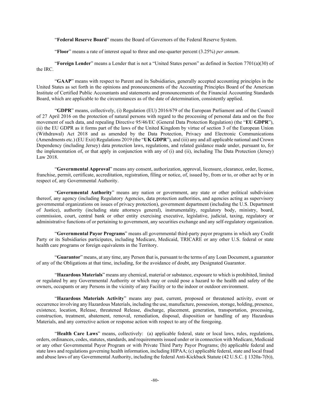 -80- “Federal Reserve Board” means the Board of Governors of the Federal Reserve System. “Floor” means a rate of interest equal to three and one-quarter percent (3.25%) per annum. “Foreign Lender” means a Lender that is not a “United States person” as defined in Section 7701(a)(30) of the IRC. “GAAP” means with respect to Parent and its Subsidiaries, generally accepted accounting principles in the United States as set forth in the opinions and pronouncements of the Accounting Principles Board of the American Institute of Certified Public Accountants and statements and pronouncements of the Financial Accounting Standards Board, which are applicable to the circumstances as of the date of determination, consistently applied. “GDPR” means, collectively, (i) Regulation (EU) 2016/679 of the European Parliament and of the Council of 27 April 2016 on the protection of natural persons with regard to the processing of personal data and on the free movement of such data, and repealing Directive 95/46/EC (General Data Protection Regulation) (the “EU GDPR”), (ii) the EU GDPR as it forms part of the laws of the United Kingdom by virtue of section 3 of the European Union (Withdrawal) Act 2018 and as amended by the Data Protection, Privacy and Electronic Communications (Amendments etc.) (EU Exit) Regulations 2019 (the “UK GDPR”), and (iii) any and all applicable national and Crown Dependency (including Jersey) data protection laws, regulations, and related guidance made under, pursuant to, for the implementation of, or that apply in conjunction with any of (i) and (ii), including The Data Protection (Jersey) Law 2018. “Governmental Approval” means any consent, authorization, approval, licensure, clearance, order, license, franchise, permit, certificate, accreditation, registration, filing or notice, of, issued by, from or to, or other act by or in respect of, any Governmental Authority. “Governmental Authority” means any nation or government, any state or other political subdivision thereof, any agency (including Regulatory Agencies, data protection authorities, and agencies acting as supervisory governmental organizations on issues of privacy protection), government department (including the U.S. Department of Justice), authority (including state attorneys general), instrumentality, regulatory body, ministry, board, commission, court, central bank or other entity exercising executive, legislative, judicial, taxing, regulatory or administrative functions of or pertaining to government, any securities exchange and any self-regulatory organization. “Governmental Payor Programs” means all governmental third-party payor programs in which any Credit Party or its Subsidiaries participates, including Medicare, Medicaid, TRICARE or any other U.S. federal or state health care programs or foreign equivalents in the Territory. “Guarantor” means, at any time, any Person that is, pursuant to the terms of any Loan Document, a guarantor of any of the Obligations at that time, including, for the avoidance of doubt, any Designated Guarantor. “Hazardous Materials” means any chemical, material or substance, exposure to which is prohibited, limited or regulated by any Governmental Authority or which may or could pose a hazard to the health and safety of the owners, occupants or any Persons in the vicinity of any Facility or to the indoor or outdoor environment. “Hazardous Materials Activity” means any past, current, proposed or threatened activity, event or occurrence involving any Hazardous Materials, including the use, manufacture, possession, storage, holding, presence, existence, location, Release, threatened Release, discharge, placement, generation, transportation, processing, construction, treatment, abatement, removal, remediation, disposal, disposition or handling of any Hazardous Materials, and any corrective action or response action with respect to any of the foregoing. “Health Care Laws” means, collectively: (a) applicable federal, state or local laws, rules, regulations, orders, ordinances, codes, statutes, standards, and requirements issued under or in connection with Medicare, Medicaid or any other Governmental Payor Program or with Private Third Party Payor Programs; (b) applicable federal and state laws and regulations governing health information, including HIPAA; (c) applicable federal, state and local fraud and abuse laws of any Governmental Authority, including the federal Anti-Kickback Statute (42 U.S.C. § 1320a-7(b)),