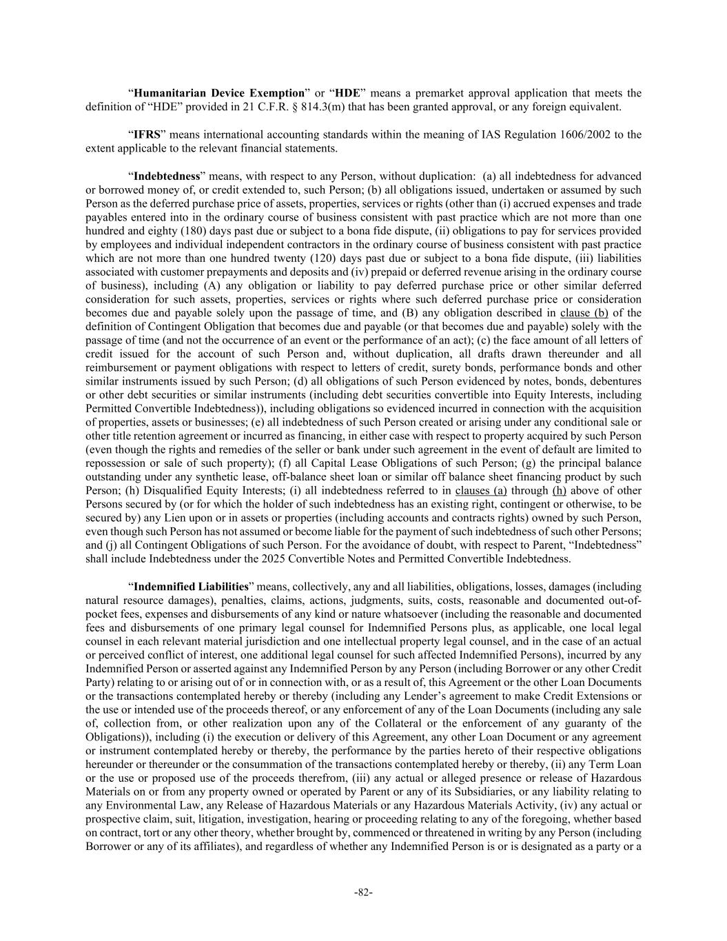 -82- “Humanitarian Device Exemption” or “HDE” means a premarket approval application that meets the definition of “HDE” provided in 21 C.F.R. § 814.3(m) that has been granted approval, or any foreign equivalent. “IFRS” means international accounting standards within the meaning of IAS Regulation 1606/2002 to the extent applicable to the relevant financial statements. “Indebtedness” means, with respect to any Person, without duplication: (a) all indebtedness for advanced or borrowed money of, or credit extended to, such Person; (b) all obligations issued, undertaken or assumed by such Person as the deferred purchase price of assets, properties, services or rights (other than (i) accrued expenses and trade payables entered into in the ordinary course of business consistent with past practice which are not more than one hundred and eighty (180) days past due or subject to a bona fide dispute, (ii) obligations to pay for services provided by employees and individual independent contractors in the ordinary course of business consistent with past practice which are not more than one hundred twenty (120) days past due or subject to a bona fide dispute, (iii) liabilities associated with customer prepayments and deposits and (iv) prepaid or deferred revenue arising in the ordinary course of business), including (A) any obligation or liability to pay deferred purchase price or other similar deferred consideration for such assets, properties, services or rights where such deferred purchase price or consideration becomes due and payable solely upon the passage of time, and (B) any obligation described in clause (b) of the definition of Contingent Obligation that becomes due and payable (or that becomes due and payable) solely with the passage of time (and not the occurrence of an event or the performance of an act); (c) the face amount of all letters of credit issued for the account of such Person and, without duplication, all drafts drawn thereunder and all reimbursement or payment obligations with respect to letters of credit, surety bonds, performance bonds and other similar instruments issued by such Person; (d) all obligations of such Person evidenced by notes, bonds, debentures or other debt securities or similar instruments (including debt securities convertible into Equity Interests, including Permitted Convertible Indebtedness)), including obligations so evidenced incurred in connection with the acquisition of properties, assets or businesses; (e) all indebtedness of such Person created or arising under any conditional sale or other title retention agreement or incurred as financing, in either case with respect to property acquired by such Person (even though the rights and remedies of the seller or bank under such agreement in the event of default are limited to repossession or sale of such property); (f) all Capital Lease Obligations of such Person; (g) the principal balance outstanding under any synthetic lease, off-balance sheet loan or similar off balance sheet financing product by such Person; (h) Disqualified Equity Interests; (i) all indebtedness referred to in clauses (a) through (h) above of other Persons secured by (or for which the holder of such indebtedness has an existing right, contingent or otherwise, to be secured by) any Lien upon or in assets or properties (including accounts and contracts rights) owned by such Person, even though such Person has not assumed or become liable for the payment of such indebtedness of such other Persons; and (j) all Contingent Obligations of such Person. For the avoidance of doubt, with respect to Parent, “Indebtedness” shall include Indebtedness under the 2025 Convertible Notes and Permitted Convertible Indebtedness. “Indemnified Liabilities” means, collectively, any and all liabilities, obligations, losses, damages (including natural resource damages), penalties, claims, actions, judgments, suits, costs, reasonable and documented out-of- pocket fees, expenses and disbursements of any kind or nature whatsoever (including the reasonable and documented fees and disbursements of one primary legal counsel for Indemnified Persons plus, as applicable, one local legal counsel in each relevant material jurisdiction and one intellectual property legal counsel, and in the case of an actual or perceived conflict of interest, one additional legal counsel for such affected Indemnified Persons), incurred by any Indemnified Person or asserted against any Indemnified Person by any Person (including Borrower or any other Credit Party) relating to or arising out of or in connection with, or as a result of, this Agreement or the other Loan Documents or the transactions contemplated hereby or thereby (including any Lender’s agreement to make Credit Extensions or the use or intended use of the proceeds thereof, or any enforcement of any of the Loan Documents (including any sale of, collection from, or other realization upon any of the Collateral or the enforcement of any guaranty of the Obligations)), including (i) the execution or delivery of this Agreement, any other Loan Document or any agreement or instrument contemplated hereby or thereby, the performance by the parties hereto of their respective obligations hereunder or thereunder or the consummation of the transactions contemplated hereby or thereby, (ii) any Term Loan or the use or proposed use of the proceeds therefrom, (iii) any actual or alleged presence or release of Hazardous Materials on or from any property owned or operated by Parent or any of its Subsidiaries, or any liability relating to any Environmental Law, any Release of Hazardous Materials or any Hazardous Materials Activity, (iv) any actual or prospective claim, suit, litigation, investigation, hearing or proceeding relating to any of the foregoing, whether based on contract, tort or any other theory, whether brought by, commenced or threatened in writing by any Person (including Borrower or any of its affi