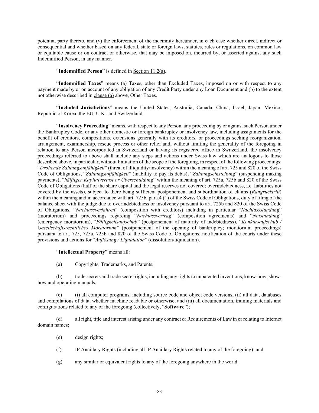 -83- potential party thereto, and (v) the enforcement of the indemnity hereunder, in each case whether direct, indirect or consequential and whether based on any federal, state or foreign laws, statutes, rules or regulations, on common law or equitable cause or on contract or otherwise, that may be imposed on, incurred by, or asserted against any such Indemnified Person, in any manner. “Indemnified Person” is defined in Section 11.2(a). “Indemnified Taxes” means (a) Taxes, other than Excluded Taxes, imposed on or with respect to any payment made by or on account of any obligation of any Credit Party under any Loan Document and (b) to the extent not otherwise described in clause (a) above, Other Taxes. “Included Jurisdictions” means the United States, Australia, Canada, China, Israel, Japan, Mexico, Republic of Korea, the EU, U.K., and Switzerland. “Insolvency Proceeding” means, with respect to any Person, any proceeding by or against such Person under the Bankruptcy Code, or any other domestic or foreign bankruptcy or insolvency law, including assignments for the benefit of creditors, compositions, extensions generally with its creditors, or proceedings seeking reorganization, arrangement, examinership, rescue process or other relief and, without limiting the generality of the foregoing in relation to any Person incorporated in Switzerland or having its registered office in Switzerland, the insolvency proceedings referred to above shall include any steps and actions under Swiss law which are analogous to those described above, in particular, without limitation of the scope of the foregoing, in respect of the following proceedings: “Drohende Zahlungsunfähigkeit” (threat of illiquidity/insolvency) within the meaning of art. 725 and 820 of the Swiss Code of Obligations, “Zahlungsunfähigkeit” (inability to pay its debts), “Zahlungseinstellung” (suspending making payments), “hälftiger Kapitalverlust or Überschuldung” within the meaning of art. 725a, 725b and 820 of the Swiss Code of Obligations (half of the share capital and the legal reserves not covered; overindebtedness, i.e. liabilities not covered by the assets), subject to there being sufficient postponement and subordination of claims (Rangrücktritt) within the meaning and in accordance with art. 725b, para.4 (1) of the Swiss Code of Obligations, duty of filing of the balance sheet with the judge due to overindebtedness or insolvency pursuant to art. 725b and 820 of the Swiss Code of Obligations, “Nachlassverfahren” (composition with creditors) including in particular “Nachlassstundung” (moratorium) and proceedings regarding “Nachlassvertrag” (composition agreements) and “Notstundung” (emergency moratorium), “Fälligkeitsaufschub” (postponement of maturity of indebtedness), “Konkursaufschub / Gesellschaftsrechtliches Moratorium” (postponement of the opening of bankruptcy; moratorium proceedings) pursuant to art. 725, 725a, 725b and 820 of the Swiss Code of Obligations, notification of the courts under these provisions and actions for “Auflösung / Liquidation” (dissolution/liquidation). “Intellectual Property” means all: (a) Copyrights, Trademarks, and Patents; (b) trade secrets and trade secret rights, including any rights to unpatented inventions, know-how, show- how and operating manuals; (c) (i) all computer programs, including source code and object code versions, (ii) all data, databases and compilations of data, whether machine readable or otherwise, and (iii) all documentation, training materials and configurations related to any of the foregoing (collectively, “Software”); (d) all right, title and interest arising under any contract or Requirements of Law in or relating to Internet domain names; (e) design rights; (f) IP Ancillary Rights (including all IP Ancillary Rights related to any of the foregoing); and (g) any similar or equivalent rights to any of the foregoing anywhere in the world.
