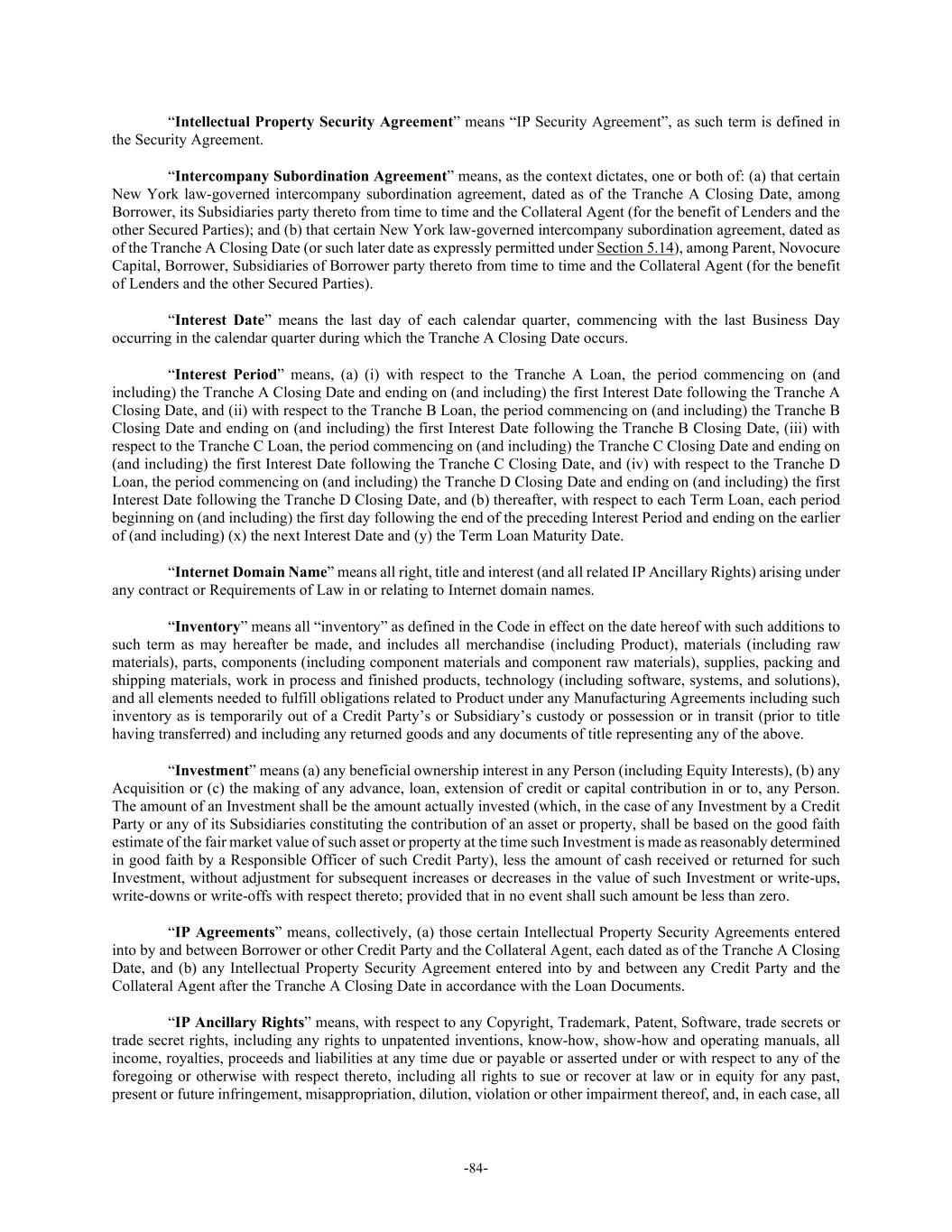 -84- “Intellectual Property Security Agreement” means “IP Security Agreement”, as such term is defined in the Security Agreement. “Intercompany Subordination Agreement” means, as the context dictates, one or both of: (a) that certain New York law-governed intercompany subordination agreement, dated as of the Tranche A Closing Date, among Borrower, its Subsidiaries party thereto from time to time and the Collateral Agent (for the benefit of Lenders and the other Secured Parties); and (b) that certain New York law-governed intercompany subordination agreement, dated as of the Tranche A Closing Date (or such later date as expressly permitted under Section 5.14), among Parent, Novocure Capital, Borrower, Subsidiaries of Borrower party thereto from time to time and the Collateral Agent (for the benefit of Lenders and the other Secured Parties). “Interest Date” means the last day of each calendar quarter, commencing with the last Business Day occurring in the calendar quarter during which the Tranche A Closing Date occurs. “Interest Period” means, (a) (i) with respect to the Tranche A Loan, the period commencing on (and including) the Tranche A Closing Date and ending on (and including) the first Interest Date following the Tranche A Closing Date, and (ii) with respect to the Tranche B Loan, the period commencing on (and including) the Tranche B Closing Date and ending on (and including) the first Interest Date following the Tranche B Closing Date, (iii) with respect to the Tranche C Loan, the period commencing on (and including) the Tranche C Closing Date and ending on (and including) the first Interest Date following the Tranche C Closing Date, and (iv) with respect to the Tranche D Loan, the period commencing on (and including) the Tranche D Closing Date and ending on (and including) the first Interest Date following the Tranche D Closing Date, and (b) thereafter, with respect to each Term Loan, each period beginning on (and including) the first day following the end of the preceding Interest Period and ending on the earlier of (and including) (x) the next Interest Date and (y) the Term Loan Maturity Date. “Internet Domain Name” means all right, title and interest (and all related IP Ancillary Rights) arising under any contract or Requirements of Law in or relating to Internet domain names. “Inventory” means all “inventory” as defined in the Code in effect on the date hereof with such additions to such term as may hereafter be made, and includes all merchandise (including Product), materials (including raw materials), parts, components (including component materials and component raw materials), supplies, packing and shipping materials, work in process and finished products, technology (including software, systems, and solutions), and all elements needed to fulfill obligations related to Product under any Manufacturing Agreements including such inventory as is temporarily out of a Credit Party’s or Subsidiary’s custody or possession or in transit (prior to title having transferred) and including any returned goods and any documents of title representing any of the above. “Investment” means (a) any beneficial ownership interest in any Person (including Equity Interests), (b) any Acquisition or (c) the making of any advance, loan, extension of credit or capital contribution in or to, any Person. The amount of an Investment shall be the amount actually invested (which, in the case of any Investment by a Credit Party or any of its Subsidiaries constituting the contribution of an asset or property, shall be based on the good faith estimate of the fair market value of such asset or property at the time such Investment is made as reasonably determined in good faith by a Responsible Officer of such Credit Party), less the amount of cash received or returned for such Investment, without adjustment for subsequent increases or decreases in the value of such Investment or write-ups, write-downs or write-offs with respect thereto; provided that in no event shall such amount be less than zero. “IP Agreements” means, collectively, (a) those certain Intellectual Property Security Agreements entered into by and between Borrower or other Credit Party and the Collateral Agent, each dated as of the Tranche A Closing Date, and (b) any Intellectual Property Security Agreement entered into by and between any Credit Party and the Collateral Agent after the Tranche A Closing Date in accordance with the Loan Documents. “IP Ancillary Rights” means, with respect to any Copyright, Trademark, Patent, Software, trade secrets or trade secret rights, including any rights to unpatented inventions, know-how, show-how and operating manuals, all income, royalties, proceeds and liabilities at any time due or payable or asserted under or with respect to any of the foregoing or otherwise with respect thereto, including all rights to sue or recover at law or in equity for any past, present or future infringement, misappropriation, dilution, violation or other impairment thereof, and, in each case, all