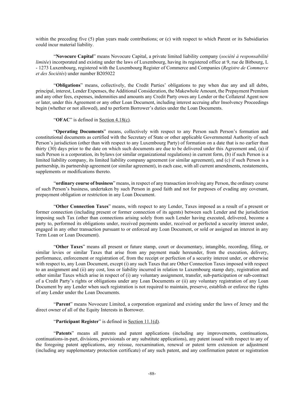 -88- within the preceding five (5) plan years made contributions; or (c) with respect to which Parent or its Subsidiaries could incur material liability. “Novocure Capital” means Novocure Capital, a private limited liability company (société à responsabilité limitée) incorporated and existing under the laws of Luxembourg, having its registered office at 9, rue de Bitbourg, L - 1273 Luxembourg, registered with the Luxembourg Register of Commerce and Companies (Registre de Commerce et des Sociétés) under number B205022 “Obligations” means, collectively, the Credit Parties’ obligations to pay when due any and all debts, principal, interest, Lender Expenses, the Additional Consideration, the Makewhole Amount, the Prepayment Premium and any other fees, expenses, indemnities and amounts any Credit Party owes any Lender or the Collateral Agent now or later, under this Agreement or any other Loan Document, including interest accruing after Insolvency Proceedings begin (whether or not allowed), and to perform Borrower’s duties under the Loan Documents. “OFAC” is defined in Section 4.18(c). “Operating Documents” means, collectively with respect to any Person such Person’s formation and constitutional documents as certified with the Secretary of State or other applicable Governmental Authority of such Person’s jurisdiction (other than with respect to any Luxembourg Party) of formation on a date that is no earlier than thirty (30) days prior to the date on which such documents are due to be delivered under this Agreement and, (a) if such Person is a corporation, its bylaws (or similar organizational regulations) in current form, (b) if such Person is a limited liability company, its limited liability company agreement (or similar agreement), and (c) if such Person is a partnership, its partnership agreement (or similar agreement), in each case, with all current amendments, restatements, supplements or modifications thereto. “ordinary course of business” means, in respect of any transaction involving any Person, the ordinary course of such Person’s business, undertaken by such Person in good faith and not for purposes of evading any covenant, prepayment obligation or restriction in any Loan Document. “Other Connection Taxes” means, with respect to any Lender, Taxes imposed as a result of a present or former connection (including present or former connection of its agents) between such Lender and the jurisdiction imposing such Tax (other than connections arising solely from such Lender having executed, delivered, become a party to, performed its obligations under, received payments under, received or perfected a security interest under, engaged in any other transaction pursuant to or enforced any Loan Document, or sold or assigned an interest in any Term Loan or Loan Document). “Other Taxes” means all present or future stamp, court or documentary, intangible, recording, filing, or similar levies or similar Taxes that arise from any payment made hereunder, from the execution, delivery, performance, enforcement or registration of, from the receipt or perfection of a security interest under, or otherwise with respect to, any Loan Document, except (i) any such Taxes that are Other Connection Taxes imposed with respect to an assignment and (ii) any cost, loss or liability incurred in relation to Luxembourg stamp duty, registration and other similar Taxes which arise in respect of (i) any voluntary assignment, transfer, sub-participation or sub-contract of a Credit Party’s rights or obligations under any Loan Documents or (ii) any voluntary registration of any Loan Document by any Lender when such registration is not required to maintain, preserve, establish or enforce the rights of any Lender under the Loan Documents. “Parent” means Novocure Limited, a corporation organized and existing under the laws of Jersey and the direct owner of all of the Equity Interests in Borrower. “Participant Register” is defined in Section 11.1(d). “Patents” means all patents and patent applications (including any improvements, continuations, continuations-in-part, divisions, provisionals or any substitute applications), any patent issued with respect to any of the foregoing patent applications, any reissue, reexamination, renewal or patent term extension or adjustment (including any supplementary protection certificate) of any such patent, and any confirmation patent or registration