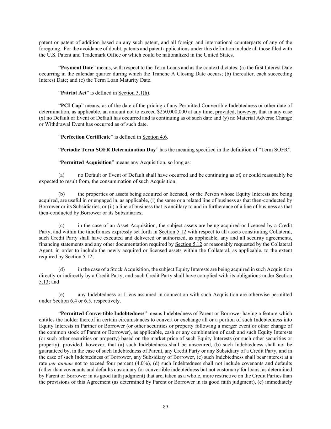 -89- patent or patent of addition based on any such patent, and all foreign and international counterparts of any of the foregoing. For the avoidance of doubt, patents and patent applications under this definition include all those filed with the U.S. Patent and Trademark Office or which could be nationalized in the United States. “Payment Date” means, with respect to the Term Loans and as the context dictates: (a) the first Interest Date occurring in the calendar quarter during which the Tranche A Closing Date occurs; (b) thereafter, each succeeding Interest Date; and (c) the Term Loan Maturity Date. “Patriot Act” is defined in Section 3.1(h). “PCI Cap” means, as of the date of the pricing of any Permitted Convertible Indebtedness or other date of determination, as applicable, an amount not to exceed $250,000,000 at any time; provided, however, that in any case (x) no Default or Event of Default has occurred and is continuing as of such date and (y) no Material Adverse Change or Withdrawal Event has occurred as of such date. “Perfection Certificate” is defined in Section 4.6. “Periodic Term SOFR Determination Day” has the meaning specified in the definition of “Term SOFR”. “Permitted Acquisition” means any Acquisition, so long as: (a) no Default or Event of Default shall have occurred and be continuing as of, or could reasonably be expected to result from, the consummation of such Acquisition; (b) the properties or assets being acquired or licensed, or the Person whose Equity Interests are being acquired, are useful in or engaged in, as applicable, (i) the same or a related line of business as that then-conducted by Borrower or its Subsidiaries, or (ii) a line of business that is ancillary to and in furtherance of a line of business as that then-conducted by Borrower or its Subsidiaries; (c) in the case of an Asset Acquisition, the subject assets are being acquired or licensed by a Credit Party, and within the timeframes expressly set forth in Section 5.12 with respect to all assets constituting Collateral, such Credit Party shall have executed and delivered or authorized, as applicable, any and all security agreements, financing statements and any other documentation required by Section 5.12 or reasonably requested by the Collateral Agent, in order to include the newly acquired or licensed assets within the Collateral, as applicable, to the extent required by Section 5.12; (d) in the case of a Stock Acquisition, the subject Equity Interests are being acquired in such Acquisition directly or indirectly by a Credit Party, and such Credit Party shall have complied with its obligations under Section 5.13; and (e) any Indebtedness or Liens assumed in connection with such Acquisition are otherwise permitted under Section 6.4 or 6.5, respectively. “Permitted Convertible Indebtedness” means Indebtedness of Parent or Borrower having a feature which entitles the holder thereof in certain circumstances to convert or exchange all or a portion of such Indebtedness into Equity Interests in Partner or Borrower (or other securities or property following a merger event or other change of the common stock of Parent or Borrower), as applicable, cash or any combination of cash and such Equity Interests (or such other securities or property) based on the market price of such Equity Interests (or such other securities or property); provided, however, that (a) such Indebtedness shall be unsecured, (b) such Indebtedness shall not be guaranteed by, in the case of such Indebtedness of Parent, any Credit Party or any Subsidiary of a Credit Party, and in the case of such Indebtedness of Borrower, any Subsidiary of Borrower, (c) such Indebtedness shall bear interest at a rate per annum not to exceed four percent (4.0%), (d) such Indebtedness shall not include covenants and defaults (other than covenants and defaults customary for convertible indebtedness but not customary for loans, as determined by Parent or Borrower in its good faith judgment) that are, taken as a whole, more restrictive on the Credit Parties than the provisions of this Agreement (as determined by Parent or Borrower in its good faith judgment), (e) immediately
