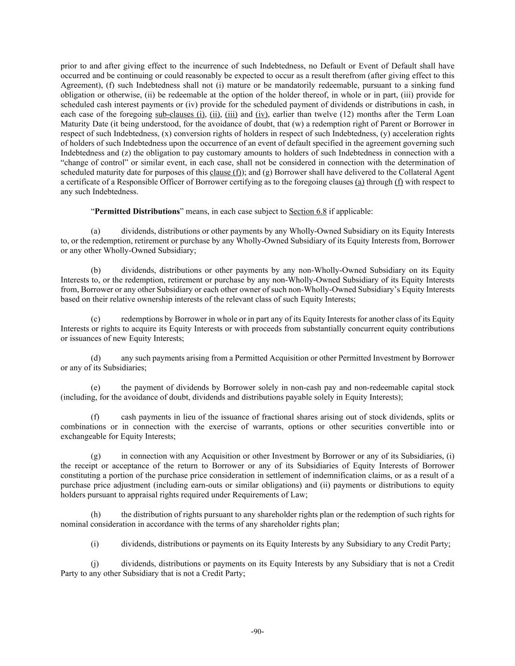 -90- prior to and after giving effect to the incurrence of such Indebtedness, no Default or Event of Default shall have occurred and be continuing or could reasonably be expected to occur as a result therefrom (after giving effect to this Agreement), (f) such Indebtedness shall not (i) mature or be mandatorily redeemable, pursuant to a sinking fund obligation or otherwise, (ii) be redeemable at the option of the holder thereof, in whole or in part, (iii) provide for scheduled cash interest payments or (iv) provide for the scheduled payment of dividends or distributions in cash, in each case of the foregoing sub-clauses (i), (ii), (iii) and (iv), earlier than twelve (12) months after the Term Loan Maturity Date (it being understood, for the avoidance of doubt, that (w) a redemption right of Parent or Borrower in respect of such Indebtedness, (x) conversion rights of holders in respect of such Indebtedness, (y) acceleration rights of holders of such Indebtedness upon the occurrence of an event of default specified in the agreement governing such Indebtedness and (z) the obligation to pay customary amounts to holders of such Indebtedness in connection with a “change of control” or similar event, in each case, shall not be considered in connection with the determination of scheduled maturity date for purposes of this clause (f)); and (g) Borrower shall have delivered to the Collateral Agent a certificate of a Responsible Officer of Borrower certifying as to the foregoing clauses (a) through (f) with respect to any such Indebtedness. “Permitted Distributions” means, in each case subject to Section 6.8 if applicable: (a) dividends, distributions or other payments by any Wholly-Owned Subsidiary on its Equity Interests to, or the redemption, retirement or purchase by any Wholly-Owned Subsidiary of its Equity Interests from, Borrower or any other Wholly-Owned Subsidiary; (b) dividends, distributions or other payments by any non-Wholly-Owned Subsidiary on its Equity Interests to, or the redemption, retirement or purchase by any non-Wholly-Owned Subsidiary of its Equity Interests from, Borrower or any other Subsidiary or each other owner of such non-Wholly-Owned Subsidiary’s Equity Interests based on their relative ownership interests of the relevant class of such Equity Interests; (c) redemptions by Borrower in whole or in part any of its Equity Interests for another class of its Equity Interests or rights to acquire its Equity Interests or with proceeds from substantially concurrent equity contributions or issuances of new Equity Interests; (d) any such payments arising from a Permitted Acquisition or other Permitted Investment by Borrower or any of its Subsidiaries; (e) the payment of dividends by Borrower solely in non-cash pay and non-redeemable capital stock (including, for the avoidance of doubt, dividends and distributions payable solely in Equity Interests); (f) cash payments in lieu of the issuance of fractional shares arising out of stock dividends, splits or combinations or in connection with the exercise of warrants, options or other securities convertible into or exchangeable for Equity Interests; (g) in connection with any Acquisition or other Investment by Borrower or any of its Subsidiaries, (i) the receipt or acceptance of the return to Borrower or any of its Subsidiaries of Equity Interests of Borrower constituting a portion of the purchase price consideration in settlement of indemnification claims, or as a result of a purchase price adjustment (including earn-outs or similar obligations) and (ii) payments or distributions to equity holders pursuant to appraisal rights required under Requirements of Law; (h) the distribution of rights pursuant to any shareholder rights plan or the redemption of such rights for nominal consideration in accordance with the terms of any shareholder rights plan; (i) dividends, distributions or payments on its Equity Interests by any Subsidiary to any Credit Party; (j) dividends, distributions or payments on its Equity Interests by any Subsidiary that is not a Credit Party to any other Subsidiary that is not a Credit Party;