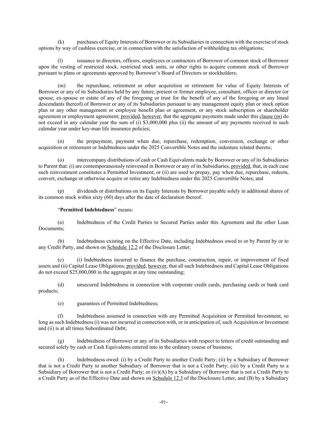 -91- (k) purchases of Equity Interests of Borrower or its Subsidiaries in connection with the exercise of stock options by way of cashless exercise, or in connection with the satisfaction of withholding tax obligations; (l) issuance to directors, officers, employees or contractors of Borrower of common stock of Borrower upon the vesting of restricted stock, restricted stock units, or other rights to acquire common stock of Borrower pursuant to plans or agreements approved by Borrower’s Board of Directors or stockholders; (m) the repurchase, retirement or other acquisition or retirement for value of Equity Interests of Borrower or any of its Subsidiaries held by any future, present or former employee, consultant, officer or director (or spouse, ex-spouse or estate of any of the foregoing or trust for the benefit of any of the foregoing or any lineal descendants thereof) of Borrower or any of its Subsidiaries pursuant to any management equity plan or stock option plan or any other management or employee benefit plan or agreement, or any stock subscription or shareholder agreement or employment agreement; provided, however, that the aggregate payments made under this clause (m) do not exceed in any calendar year the sum of (i) $3,000,000 plus (ii) the amount of any payments received in such calendar year under key-man life insurance policies; (n) the prepayment, payment when due, repurchase, redemption, conversion, exchange or other acquisition or retirement or Indebtedness under the 2025 Convertible Notes and the indenture related thereto; (o) intercompany distributions of cash or Cash Equivalents made by Borrower or any of its Subsidiaries to Parent that: (i) are contemporaneously reinvested in Borrower or any of its Subsidiaries, provided, that, in each case such reinvestment constitutes a Permitted Investment; or (ii) are used to prepay, pay when due, repurchase, redeem, convert, exchange or otherwise acquire or retire any Indebtedness under the 2025 Convertible Notes; and (p) dividends or distributions on its Equity Interests by Borrower payable solely in additional shares of its common stock within sixty (60) days after the date of declaration thereof. “Permitted Indebtedness” means: (a) Indebtedness of the Credit Parties to Secured Parties under this Agreement and the other Loan Documents; (b) Indebtedness existing on the Effective Date, including Indebtedness owed to or by Parent by or to any Credit Party, and shown on Schedule 12.2 of the Disclosure Letter; (c) (i) Indebtedness incurred to finance the purchase, construction, repair, or improvement of fixed assets and (ii) Capital Lease Obligations; provided, however, that all such Indebtedness and Capital Lease Obligations do not exceed $25,000,000 in the aggregate at any time outstanding; (d) unsecured Indebtedness in connection with corporate credit cards, purchasing cards or bank card products; (e) guarantees of Permitted Indebtedness; (f) Indebtedness assumed in connection with any Permitted Acquisition or Permitted Investment, so long as such Indebtedness (i) was not incurred in connection with, or in anticipation of, such Acquisition or Investment and (ii) is at all times Subordinated Debt; (g) Indebtedness of Borrower or any of its Subsidiaries with respect to letters of credit outstanding and secured solely by cash or Cash Equivalents entered into in the ordinary course of business; (h) Indebtedness owed: (i) by a Credit Party to another Credit Party; (ii) by a Subsidiary of Borrower that is not a Credit Party to another Subsidiary of Borrower that is not a Credit Party; (iii) by a Credit Party to a Subsidiary of Borrower that is not a Credit Party; or (iv)(A) by a Subsidiary of Borrower that is not a Credit Party to a Credit Party as of the Effective Date and shown on Schedule 12.3 of the Disclosure Letter, and (B) by a Subsidiary