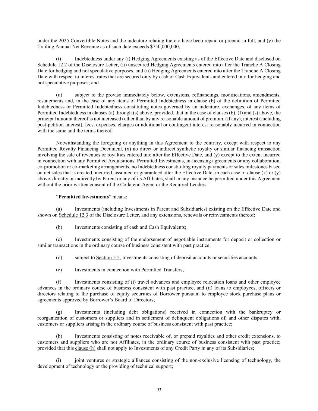 -93- under the 2025 Convertible Notes and the indenture relating thereto have been repaid or prepaid in full, and (y) the Trailing Annual Net Revenue as of such date exceeds $750,000,000; (t) Indebtedness under any (i) Hedging Agreements existing as of the Effective Date and disclosed on Schedule 12.2 of the Disclosure Letter, (ii) unsecured Hedging Agreements entered into after the Tranche A Closing Date for hedging and not speculative purposes, and (ii) Hedging Agreements entered into after the Tranche A Closing Date with respect to interest rates that are secured only by cash or Cash Equivalents and entered into for hedging and not speculative purposes; and (u) subject to the proviso immediately below, extensions, refinancings, modifications, amendments, restatements and, in the case of any items of Permitted Indebtedness in clause (b) of the definition of Permitted Indebtedness or Permitted Indebtedness constituting notes governed by an indenture, exchanges, of any items of Permitted Indebtedness in clauses (a) through (s) above, provided, that in the case of clauses (b), (f) and (s) above, the principal amount thereof is not increased (other than by any reasonable amount of premium (if any), interest (including post-petition interest), fees, expenses, charges or additional or contingent interest reasonably incurred in connection with the same and the terms thereof. Notwithstanding the foregoing or anything in this Agreement to the contrary, except with respect to any Permitted Royalty Financing Document, (x) no direct or indirect synthetic royalty or similar financing transaction involving the sale of revenues or royalties entered into after the Effective Date, and (y) except to the extent incurred in connection with any Permitted Acquisitions, Permitted Investments, in-licensing agreements or any collaboration, co-promotion or co-marketing arrangements, no Indebtedness constituting royalty payments or sales milestones based on net sales that is created, incurred, assumed or guaranteed after the Effective Date, in each case of clause (x) or (y) above, directly or indirectly by Parent or any of its Affiliates, shall in any instance be permitted under this Agreement without the prior written consent of the Collateral Agent or the Required Lenders. “Permitted Investments” means: (a) Investments (including Investments in Parent and Subsidiaries) existing on the Effective Date and shown on Schedule 12.3 of the Disclosure Letter, and any extensions, renewals or reinvestments thereof; (b) Investments consisting of cash and Cash Equivalents; (c) Investments consisting of the endorsement of negotiable instruments for deposit or collection or similar transactions in the ordinary course of business consistent with past practice; (d) subject to Section 5.5, Investments consisting of deposit accounts or securities accounts; (e) Investments in connection with Permitted Transfers; (f) Investments consisting of (i) travel advances and employee relocation loans and other employee advances in the ordinary course of business consistent with past practice, and (ii) loans to employees, officers or directors relating to the purchase of equity securities of Borrower pursuant to employee stock purchase plans or agreements approved by Borrower’s Board of Directors; (g) Investments (including debt obligations) received in connection with the bankruptcy or reorganization of customers or suppliers and in settlement of delinquent obligations of, and other disputes with, customers or suppliers arising in the ordinary course of business consistent with past practice; (h) Investments consisting of notes receivable of, or prepaid royalties and other credit extensions, to customers and suppliers who are not Affiliates, in the ordinary course of business consistent with past practice; provided that this clause (h) shall not apply to Investments of any Credit Party in any of its Subsidiaries; (i) joint ventures or strategic alliances consisting of the non-exclusive licensing of technology, the development of technology or the providing of technical support;