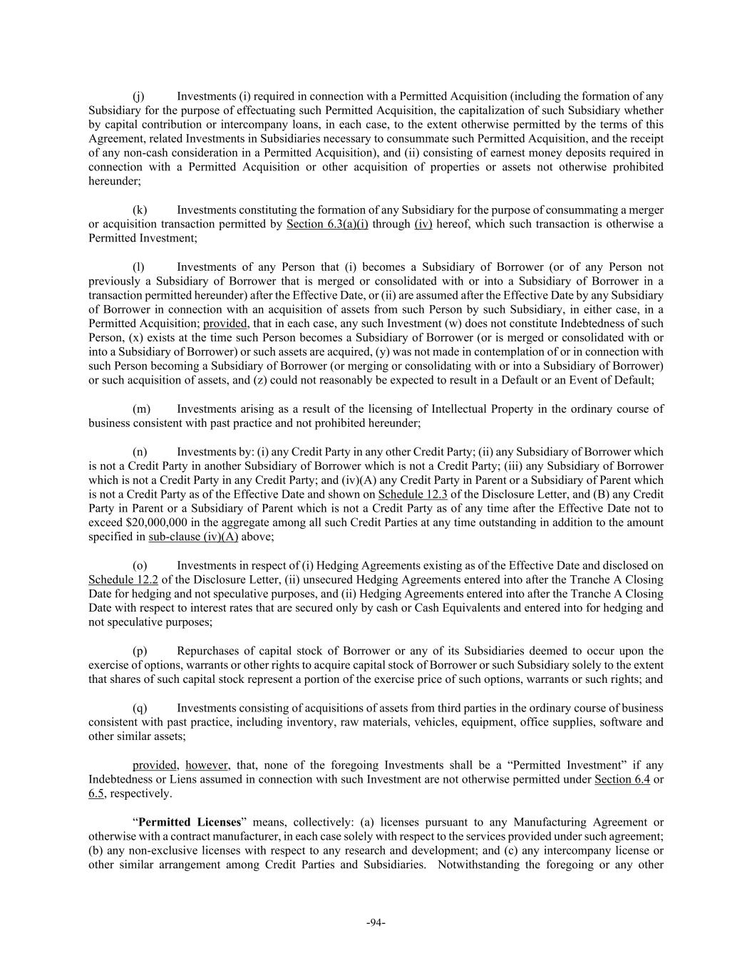 -94- (j) Investments (i) required in connection with a Permitted Acquisition (including the formation of any Subsidiary for the purpose of effectuating such Permitted Acquisition, the capitalization of such Subsidiary whether by capital contribution or intercompany loans, in each case, to the extent otherwise permitted by the terms of this Agreement, related Investments in Subsidiaries necessary to consummate such Permitted Acquisition, and the receipt of any non-cash consideration in a Permitted Acquisition), and (ii) consisting of earnest money deposits required in connection with a Permitted Acquisition or other acquisition of properties or assets not otherwise prohibited hereunder; (k) Investments constituting the formation of any Subsidiary for the purpose of consummating a merger or acquisition transaction permitted by Section 6.3(a)(i) through (iv) hereof, which such transaction is otherwise a Permitted Investment; (l) Investments of any Person that (i) becomes a Subsidiary of Borrower (or of any Person not previously a Subsidiary of Borrower that is merged or consolidated with or into a Subsidiary of Borrower in a transaction permitted hereunder) after the Effective Date, or (ii) are assumed after the Effective Date by any Subsidiary of Borrower in connection with an acquisition of assets from such Person by such Subsidiary, in either case, in a Permitted Acquisition; provided, that in each case, any such Investment (w) does not constitute Indebtedness of such Person, (x) exists at the time such Person becomes a Subsidiary of Borrower (or is merged or consolidated with or into a Subsidiary of Borrower) or such assets are acquired, (y) was not made in contemplation of or in connection with such Person becoming a Subsidiary of Borrower (or merging or consolidating with or into a Subsidiary of Borrower) or such acquisition of assets, and (z) could not reasonably be expected to result in a Default or an Event of Default; (m) Investments arising as a result of the licensing of Intellectual Property in the ordinary course of business consistent with past practice and not prohibited hereunder; (n) Investments by: (i) any Credit Party in any other Credit Party; (ii) any Subsidiary of Borrower which is not a Credit Party in another Subsidiary of Borrower which is not a Credit Party; (iii) any Subsidiary of Borrower which is not a Credit Party in any Credit Party; and (iv)(A) any Credit Party in Parent or a Subsidiary of Parent which is not a Credit Party as of the Effective Date and shown on Schedule 12.3 of the Disclosure Letter, and (B) any Credit Party in Parent or a Subsidiary of Parent which is not a Credit Party as of any time after the Effective Date not to exceed $20,000,000 in the aggregate among all such Credit Parties at any time outstanding in addition to the amount specified in sub-clause (iv)(A) above; (o) Investments in respect of (i) Hedging Agreements existing as of the Effective Date and disclosed on Schedule 12.2 of the Disclosure Letter, (ii) unsecured Hedging Agreements entered into after the Tranche A Closing Date for hedging and not speculative purposes, and (ii) Hedging Agreements entered into after the Tranche A Closing Date with respect to interest rates that are secured only by cash or Cash Equivalents and entered into for hedging and not speculative purposes; (p) Repurchases of capital stock of Borrower or any of its Subsidiaries deemed to occur upon the exercise of options, warrants or other rights to acquire capital stock of Borrower or such Subsidiary solely to the extent that shares of such capital stock represent a portion of the exercise price of such options, warrants or such rights; and (q) Investments consisting of acquisitions of assets from third parties in the ordinary course of business consistent with past practice, including inventory, raw materials, vehicles, equipment, office supplies, software and other similar assets; provided, however, that, none of the foregoing Investments shall be a “Permitted Investment” if any Indebtedness or Liens assumed in connection with such Investment are not otherwise permitted under Section 6.4 or 6.5, respectively. “Permitted Licenses” means, collectively: (a) licenses pursuant to any Manufacturing Agreement or otherwise with a contract manufacturer, in each case solely with respect to the services provided under such agreement; (b) any non-exclusive licenses with respect to any research and development; and (c) any intercompany license or other similar arrangement among Credit Parties and Subsidiaries. Notwithstanding the foregoing or any other