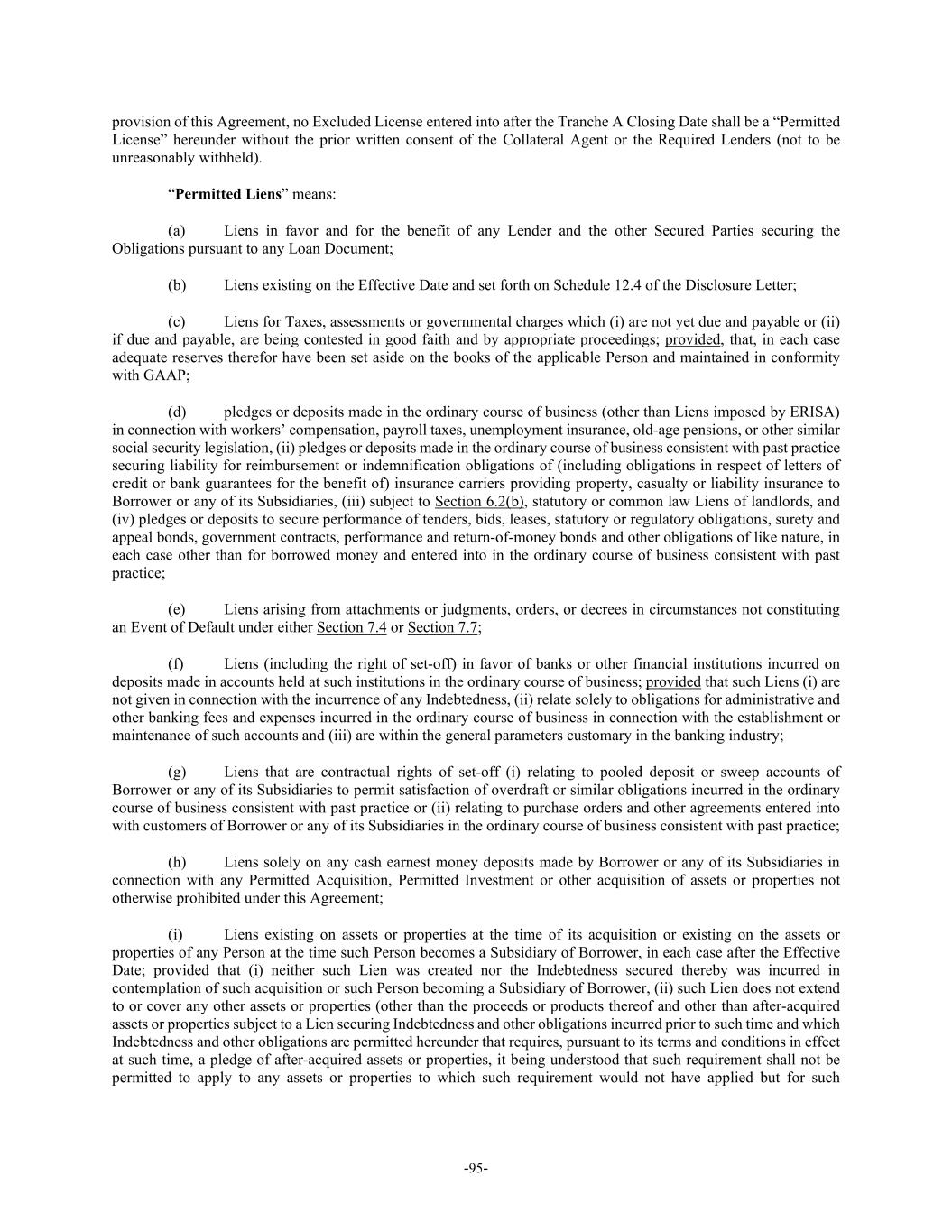 -95- provision of this Agreement, no Excluded License entered into after the Tranche A Closing Date shall be a “Permitted License” hereunder without the prior written consent of the Collateral Agent or the Required Lenders (not to be unreasonably withheld). “Permitted Liens” means: (a) Liens in favor and for the benefit of any Lender and the other Secured Parties securing the Obligations pursuant to any Loan Document; (b) Liens existing on the Effective Date and set forth on Schedule 12.4 of the Disclosure Letter; (c) Liens for Taxes, assessments or governmental charges which (i) are not yet due and payable or (ii) if due and payable, are being contested in good faith and by appropriate proceedings; provided, that, in each case adequate reserves therefor have been set aside on the books of the applicable Person and maintained in conformity with GAAP; (d) pledges or deposits made in the ordinary course of business (other than Liens imposed by ERISA) in connection with workers’ compensation, payroll taxes, unemployment insurance, old-age pensions, or other similar social security legislation, (ii) pledges or deposits made in the ordinary course of business consistent with past practice securing liability for reimbursement or indemnification obligations of (including obligations in respect of letters of credit or bank guarantees for the benefit of) insurance carriers providing property, casualty or liability insurance to Borrower or any of its Subsidiaries, (iii) subject to Section 6.2(b), statutory or common law Liens of landlords, and (iv) pledges or deposits to secure performance of tenders, bids, leases, statutory or regulatory obligations, surety and appeal bonds, government contracts, performance and return-of-money bonds and other obligations of like nature, in each case other than for borrowed money and entered into in the ordinary course of business consistent with past practice; (e) Liens arising from attachments or judgments, orders, or decrees in circumstances not constituting an Event of Default under either Section 7.4 or Section 7.7; (f) Liens (including the right of set-off) in favor of banks or other financial institutions incurred on deposits made in accounts held at such institutions in the ordinary course of business; provided that such Liens (i) are not given in connection with the incurrence of any Indebtedness, (ii) relate solely to obligations for administrative and other banking fees and expenses incurred in the ordinary course of business in connection with the establishment or maintenance of such accounts and (iii) are within the general parameters customary in the banking industry; (g) Liens that are contractual rights of set-off (i) relating to pooled deposit or sweep accounts of Borrower or any of its Subsidiaries to permit satisfaction of overdraft or similar obligations incurred in the ordinary course of business consistent with past practice or (ii) relating to purchase orders and other agreements entered into with customers of Borrower or any of its Subsidiaries in the ordinary course of business consistent with past practice; (h) Liens solely on any cash earnest money deposits made by Borrower or any of its Subsidiaries in connection with any Permitted Acquisition, Permitted Investment or other acquisition of assets or properties not otherwise prohibited under this Agreement; (i) Liens existing on assets or properties at the time of its acquisition or existing on the assets or properties of any Person at the time such Person becomes a Subsidiary of Borrower, in each case after the Effective Date; provided that (i) neither such Lien was created nor the Indebtedness secured thereby was incurred in contemplation of such acquisition or such Person becoming a Subsidiary of Borrower, (ii) such Lien does not extend to or cover any other assets or properties (other than the proceeds or products thereof and other than after-acquired assets or properties subject to a Lien securing Indebtedness and other obligations incurred prior to such time and which Indebtedness and other obligations are permitted hereunder that requires, pursuant to its terms and conditions in effect at such time, a pledge of after-acquired assets or properties, it being understood that such requirement shall not be permitted to apply to any assets or properties to which such requirement would not have applied but for such