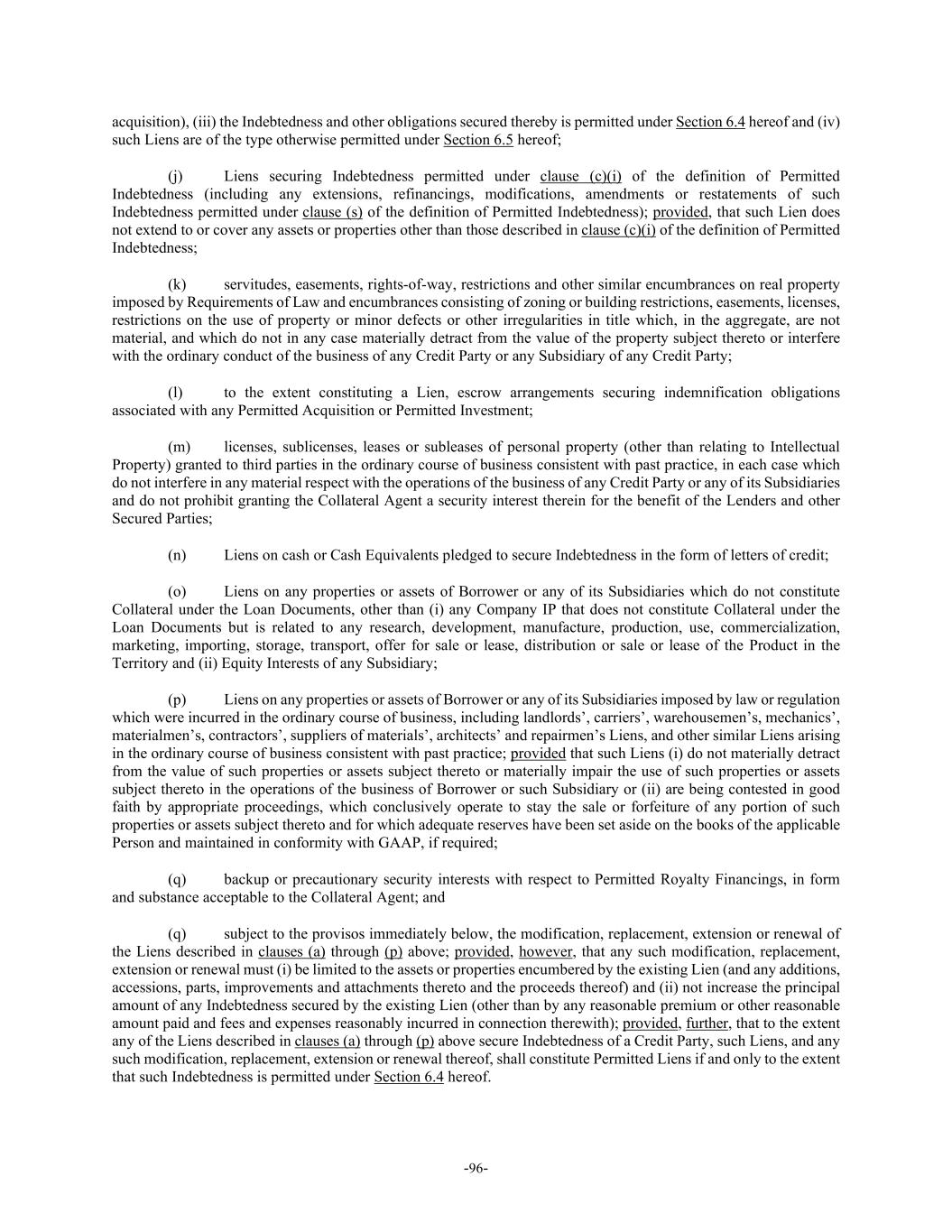 -96- acquisition), (iii) the Indebtedness and other obligations secured thereby is permitted under Section 6.4 hereof and (iv) such Liens are of the type otherwise permitted under Section 6.5 hereof; (j) Liens securing Indebtedness permitted under clause (c)(i) of the definition of Permitted Indebtedness (including any extensions, refinancings, modifications, amendments or restatements of such Indebtedness permitted under clause (s) of the definition of Permitted Indebtedness); provided, that such Lien does not extend to or cover any assets or properties other than those described in clause (c)(i) of the definition of Permitted Indebtedness; (k) servitudes, easements, rights-of-way, restrictions and other similar encumbrances on real property imposed by Requirements of Law and encumbrances consisting of zoning or building restrictions, easements, licenses, restrictions on the use of property or minor defects or other irregularities in title which, in the aggregate, are not material, and which do not in any case materially detract from the value of the property subject thereto or interfere with the ordinary conduct of the business of any Credit Party or any Subsidiary of any Credit Party; (l) to the extent constituting a Lien, escrow arrangements securing indemnification obligations associated with any Permitted Acquisition or Permitted Investment; (m) licenses, sublicenses, leases or subleases of personal property (other than relating to Intellectual Property) granted to third parties in the ordinary course of business consistent with past practice, in each case which do not interfere in any material respect with the operations of the business of any Credit Party or any of its Subsidiaries and do not prohibit granting the Collateral Agent a security interest therein for the benefit of the Lenders and other Secured Parties; (n) Liens on cash or Cash Equivalents pledged to secure Indebtedness in the form of letters of credit; (o) Liens on any properties or assets of Borrower or any of its Subsidiaries which do not constitute Collateral under the Loan Documents, other than (i) any Company IP that does not constitute Collateral under the Loan Documents but is related to any research, development, manufacture, production, use, commercialization, marketing, importing, storage, transport, offer for sale or lease, distribution or sale or lease of the Product in the Territory and (ii) Equity Interests of any Subsidiary; (p) Liens on any properties or assets of Borrower or any of its Subsidiaries imposed by law or regulation which were incurred in the ordinary course of business, including landlords’, carriers’, warehousemen’s, mechanics’, materialmen’s, contractors’, suppliers of materials’, architects’ and repairmen’s Liens, and other similar Liens arising in the ordinary course of business consistent with past practice; provided that such Liens (i) do not materially detract from the value of such properties or assets subject thereto or materially impair the use of such properties or assets subject thereto in the operations of the business of Borrower or such Subsidiary or (ii) are being contested in good faith by appropriate proceedings, which conclusively operate to stay the sale or forfeiture of any portion of such properties or assets subject thereto and for which adequate reserves have been set aside on the books of the applicable Person and maintained in conformity with GAAP, if required; (q) backup or precautionary security interests with respect to Permitted Royalty Financings, in form and substance acceptable to the Collateral Agent; and (q) subject to the provisos immediately below, the modification, replacement, extension or renewal of the Liens described in clauses (a) through (p) above; provided, however, that any such modification, replacement, extension or renewal must (i) be limited to the assets or properties encumbered by the existing Lien (and any additions, accessions, parts, improvements and attachments thereto and the proceeds thereof) and (ii) not increase the principal amount of any Indebtedness secured by the existing Lien (other than by any reasonable premium or other reasonable amount paid and fees and expenses reasonably incurred in connection therewith); provided, further, that to the extent any of the Liens described in clauses (a) through (p) above secure Indebtedness of a Credit Party, such Liens, and any such modification, replacement, extension or renewal thereof, shall constitute Permitted Liens if and only to the extent that such Indebtedness is permitted under Section 6.4 hereof.