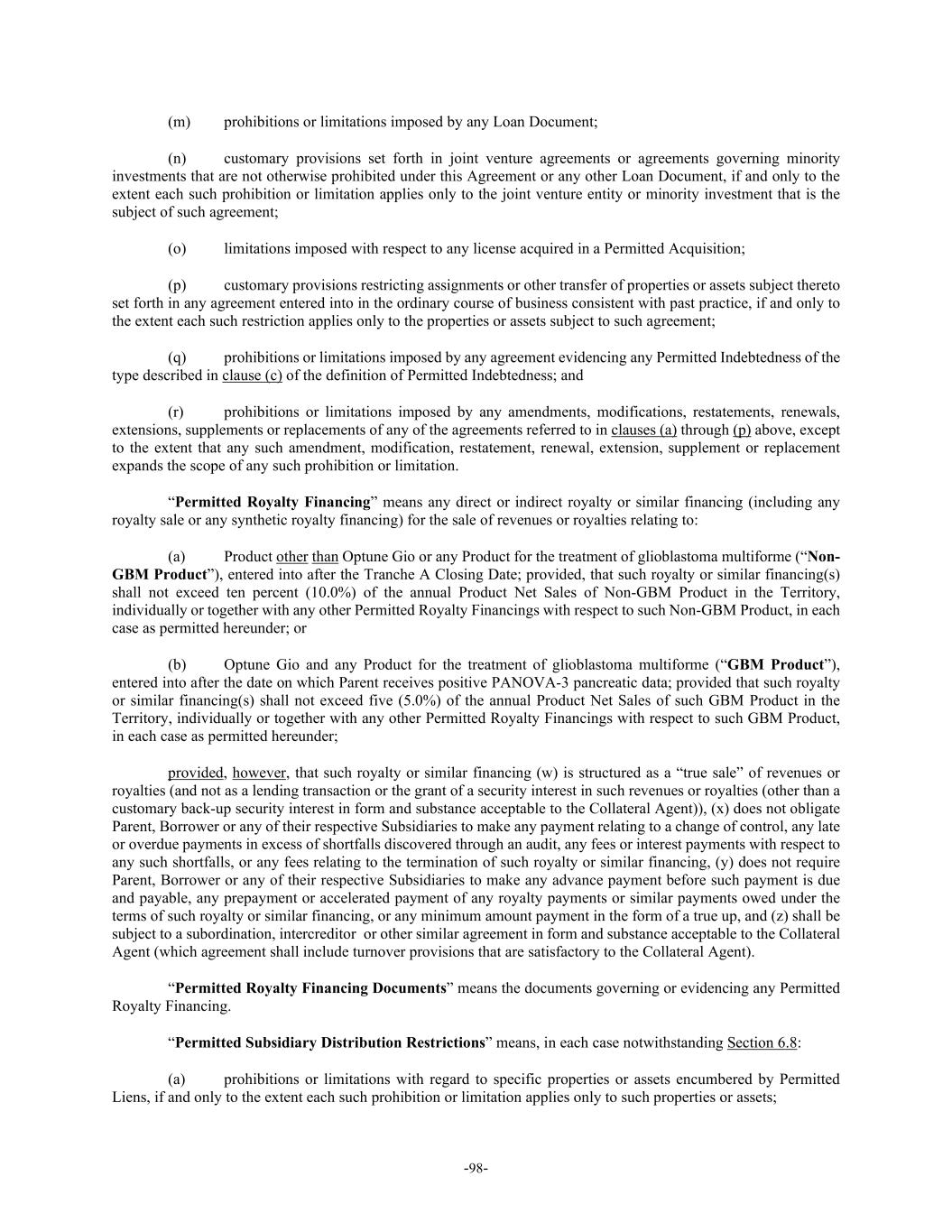 -98- (m) prohibitions or limitations imposed by any Loan Document; (n) customary provisions set forth in joint venture agreements or agreements governing minority investments that are not otherwise prohibited under this Agreement or any other Loan Document, if and only to the extent each such prohibition or limitation applies only to the joint venture entity or minority investment that is the subject of such agreement; (o) limitations imposed with respect to any license acquired in a Permitted Acquisition; (p) customary provisions restricting assignments or other transfer of properties or assets subject thereto set forth in any agreement entered into in the ordinary course of business consistent with past practice, if and only to the extent each such restriction applies only to the properties or assets subject to such agreement; (q) prohibitions or limitations imposed by any agreement evidencing any Permitted Indebtedness of the type described in clause (c) of the definition of Permitted Indebtedness; and (r) prohibitions or limitations imposed by any amendments, modifications, restatements, renewals, extensions, supplements or replacements of any of the agreements referred to in clauses (a) through (p) above, except to the extent that any such amendment, modification, restatement, renewal, extension, supplement or replacement expands the scope of any such prohibition or limitation. “Permitted Royalty Financing” means any direct or indirect royalty or similar financing (including any royalty sale or any synthetic royalty financing) for the sale of revenues or royalties relating to: (a) Product other than Optune Gio or any Product for the treatment of glioblastoma multiforme (“Non- GBM Product”), entered into after the Tranche A Closing Date; provided, that such royalty or similar financing(s) shall not exceed ten percent (10.0%) of the annual Product Net Sales of Non-GBM Product in the Territory, individually or together with any other Permitted Royalty Financings with respect to such Non-GBM Product, in each case as permitted hereunder; or (b) Optune Gio and any Product for the treatment of glioblastoma multiforme (“GBM Product”), entered into after the date on which Parent receives positive PANOVA-3 pancreatic data; provided that such royalty or similar financing(s) shall not exceed five (5.0%) of the annual Product Net Sales of such GBM Product in the Territory, individually or together with any other Permitted Royalty Financings with respect to such GBM Product, in each case as permitted hereunder; provided, however, that such royalty or similar financing (w) is structured as a “true sale” of revenues or royalties (and not as a lending transaction or the grant of a security interest in such revenues or royalties (other than a customary back-up security interest in form and substance acceptable to the Collateral Agent)), (x) does not obligate Parent, Borrower or any of their respective Subsidiaries to make any payment relating to a change of control, any late or overdue payments in excess of shortfalls discovered through an audit, any fees or interest payments with respect to any such shortfalls, or any fees relating to the termination of such royalty or similar financing, (y) does not require Parent, Borrower or any of their respective Subsidiaries to make any advance payment before such payment is due and payable, any prepayment or accelerated payment of any royalty payments or similar payments owed under the terms of such royalty or similar financing, or any minimum amount payment in the form of a true up, and (z) shall be subject to a subordination, intercreditor or other similar agreement in form and substance acceptable to the Collateral Agent (which agreement shall include turnover provisions that are satisfactory to the Collateral Agent). “Permitted Royalty Financing Documents” means the documents governing or evidencing any Permitted Royalty Financing. “Permitted Subsidiary Distribution Restrictions” means, in each case notwithstanding Section 6.8: (a) prohibitions or limitations with regard to specific properties or assets encumbered by Permitted Liens, if and only to the extent each such prohibition or limitation applies only to such properties or assets;
