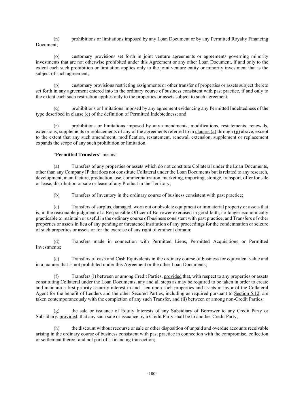 -100- (n) prohibitions or limitations imposed by any Loan Document or by any Permitted Royalty Financing Document; (o) customary provisions set forth in joint venture agreements or agreements governing minority investments that are not otherwise prohibited under this Agreement or any other Loan Document, if and only to the extent each such prohibition or limitation applies only to the joint venture entity or minority investment that is the subject of such agreement; (p) customary provisions restricting assignments or other transfer of properties or assets subject thereto set forth in any agreement entered into in the ordinary course of business consistent with past practice, if and only to the extent each such restriction applies only to the properties or assets subject to such agreement; (q) prohibitions or limitations imposed by any agreement evidencing any Permitted Indebtedness of the type described in clause (c) of the definition of Permitted Indebtedness; and (r) prohibitions or limitations imposed by any amendments, modifications, restatements, renewals, extensions, supplements or replacements of any of the agreements referred to in clauses (a) through (p) above, except to the extent that any such amendment, modification, restatement, renewal, extension, supplement or replacement expands the scope of any such prohibition or limitation. “Permitted Transfers” means: (a) Transfers of any properties or assets which do not constitute Collateral under the Loan Documents, other than any Company IP that does not constitute Collateral under the Loan Documents but is related to any research, development, manufacture, production, use, commercialization, marketing, importing, storage, transport, offer for sale or lease, distribution or sale or lease of any Product in the Territory; (b) Transfers of Inventory in the ordinary course of business consistent with past practice; (c) Transfers of surplus, damaged, worn out or obsolete equipment or immaterial property or assets that is, in the reasonable judgment of a Responsible Officer of Borrower exercised in good faith, no longer economically practicable to maintain or useful in the ordinary course of business consistent with past practice, and Transfers of other properties or assets in lieu of any pending or threatened institution of any proceedings for the condemnation or seizure of such properties or assets or for the exercise of any right of eminent domain; (d) Transfers made in connection with Permitted Liens, Permitted Acquisitions or Permitted Investments; (e) Transfers of cash and Cash Equivalents in the ordinary course of business for equivalent value and in a manner that is not prohibited under this Agreement or the other Loan Documents; (f) Transfers (i) between or among Credit Parties, provided that, with respect to any properties or assets constituting Collateral under the Loan Documents, any and all steps as may be required to be taken in order to create and maintain a first priority security interest in and Lien upon such properties and assets in favor of the Collateral Agent for the benefit of Lenders and the other Secured Parties, including as required pursuant to Section 5.12, are taken contemporaneously with the completion of any such Transfer, and (ii) between or among non-Credit Parties; (g) the sale or issuance of Equity Interests of any Subsidiary of Borrower to any Credit Party or Subsidiary, provided, that any such sale or issuance by a Credit Party shall be to another Credit Party; (h) the discount without recourse or sale or other disposition of unpaid and overdue accounts receivable arising in the ordinary course of business consistent with past practice in connection with the compromise, collection or settlement thereof and not part of a financing transaction;