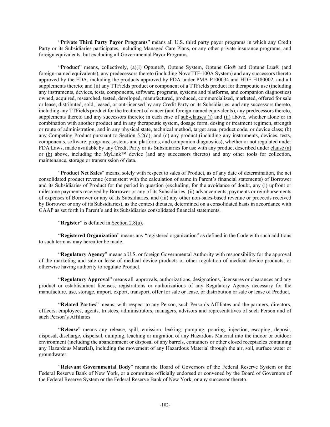 -102- “Private Third Party Payor Programs” means all U.S. third party payor programs in which any Credit Party or its Subsidiaries participates, including Managed Care Plans, or any other private insurance programs, and foreign equivalents, but excluding all Governmental Payor Programs. “Product” means, collectively, (a)(i) Optune®, Optune System, Optune Gio® and Optune Lua® (and foreign-named equivalents), any predecessors thereto (including NovoTTF-100A System) and any successors thereto approved by the FDA, including the products approved by FDA under PMA P100034 and HDE H180002, and all supplements thereto; and (ii) any TTFields product or component of a TTFields product for therapeutic use (including any instruments, devices, tests, components, software, programs, systems and platforms, and companion diagnostics) owned, acquired, researched, tested, developed, manufactured, produced, commercialized, marketed, offered for sale or lease, distributed, sold, leased, or out-licensed by any Credit Party or its Subsidiaries, and any successors thereto, including any TTFields product for the treatment of cancer (and foreign-named equivalents), any predecessors thereto, supplements thereto and any successors thereto; in each case of sub-clauses (i) and (ii) above, whether alone or in combination with another product and in any therapeutic system, dosage form, dosing or treatment regimen, strength or route of administration, and in any physical state, technical method, target area, product code, or device class; (b) any Competing Product pursuant to Section 5.2(d); and (c) any product (including any instruments, devices, tests, components, software, programs, systems and platforms, and companion diagnostics), whether or not regulated under FDA Laws, made available by any Credit Party or its Subsidiaries for use with any product described under clause (a) or (b) above, including the MyLink™ device (and any successors thereto) and any other tools for collection, maintenance, storage or transmission of data. “Product Net Sales” means, solely with respect to sales of Product, as of any date of determination, the net consolidated product revenue (consistent with the calculation of same in Parent’s financial statements) of Borrower and its Subsidiaries of Product for the period in question (excluding, for the avoidance of doubt, any (i) upfront or milestone payments received by Borrower or any of its Subsidiaries, (ii) advancements, payments or reimbursements of expenses of Borrower or any of its Subsidiaries, and (iii) any other non-sales-based revenue or proceeds received by Borrower or any of its Subsidiaries), as the context dictates, determined on a consolidated basis in accordance with GAAP as set forth in Parent’s and its Subsidiaries consolidated financial statements. “Register” is defined in Section 2.8(a). “Registered Organization” means any “registered organization” as defined in the Code with such additions to such term as may hereafter be made. “Regulatory Agency” means a U.S. or foreign Governmental Authority with responsibility for the approval of the marketing and sale or lease of medical device products or other regulation of medical device products, or otherwise having authority to regulate Product. “Regulatory Approval” means all approvals, authorizations, designations, licensures or clearances and any product or establishment licenses, registrations or authorizations of any Regulatory Agency necessary for the manufacture, use, storage, import, export, transport, offer for sale or lease, or distribution or sale or lease of Product. “Related Parties” means, with respect to any Person, such Person’s Affiliates and the partners, directors, officers, employees, agents, trustees, administrators, managers, advisors and representatives of such Person and of such Person’s Affiliates. “Release” means any release, spill, emission, leaking, pumping, pouring, injection, escaping, deposit, disposal, discharge, dispersal, dumping, leaching or migration of any Hazardous Material into the indoor or outdoor environment (including the abandonment or disposal of any barrels, containers or other closed receptacles containing any Hazardous Material), including the movement of any Hazardous Material through the air, soil, surface water or groundwater. “Relevant Governmental Body” means the Board of Governors of the Federal Reserve System or the Federal Reserve Bank of New York, or a committee officially endorsed or convened by the Board of Governors of the Federal Reserve System or the Federal Reserve Bank of New York, or any successor thereto.