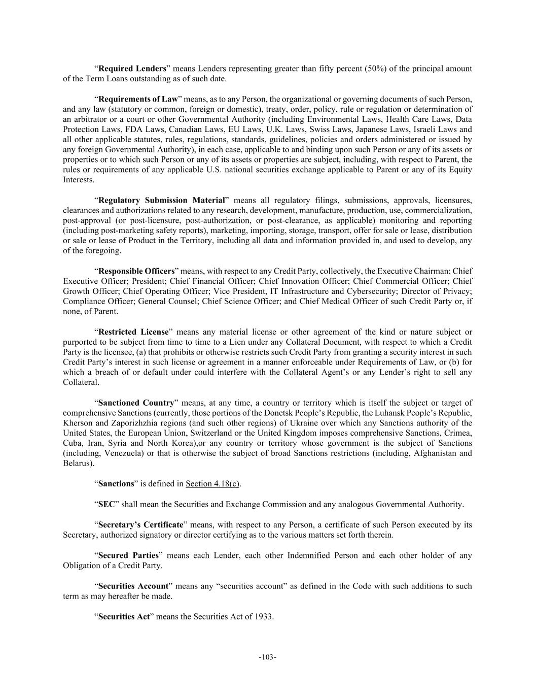 -103- “Required Lenders” means Lenders representing greater than fifty percent (50%) of the principal amount of the Term Loans outstanding as of such date. “Requirements of Law” means, as to any Person, the organizational or governing documents of such Person, and any law (statutory or common, foreign or domestic), treaty, order, policy, rule or regulation or determination of an arbitrator or a court or other Governmental Authority (including Environmental Laws, Health Care Laws, Data Protection Laws, FDA Laws, Canadian Laws, EU Laws, U.K. Laws, Swiss Laws, Japanese Laws, Israeli Laws and all other applicable statutes, rules, regulations, standards, guidelines, policies and orders administered or issued by any foreign Governmental Authority), in each case, applicable to and binding upon such Person or any of its assets or properties or to which such Person or any of its assets or properties are subject, including, with respect to Parent, the rules or requirements of any applicable U.S. national securities exchange applicable to Parent or any of its Equity Interests. “Regulatory Submission Material” means all regulatory filings, submissions, approvals, licensures, clearances and authorizations related to any research, development, manufacture, production, use, commercialization, post-approval (or post-licensure, post-authorization, or post-clearance, as applicable) monitoring and reporting (including post-marketing safety reports), marketing, importing, storage, transport, offer for sale or lease, distribution or sale or lease of Product in the Territory, including all data and information provided in, and used to develop, any of the foregoing. “Responsible Officers” means, with respect to any Credit Party, collectively, the Executive Chairman; Chief Executive Officer; President; Chief Financial Officer; Chief Innovation Officer; Chief Commercial Officer; Chief Growth Officer; Chief Operating Officer; Vice President, IT Infrastructure and Cybersecurity; Director of Privacy; Compliance Officer; General Counsel; Chief Science Officer; and Chief Medical Officer of such Credit Party or, if none, of Parent. “Restricted License” means any material license or other agreement of the kind or nature subject or purported to be subject from time to time to a Lien under any Collateral Document, with respect to which a Credit Party is the licensee, (a) that prohibits or otherwise restricts such Credit Party from granting a security interest in such Credit Party’s interest in such license or agreement in a manner enforceable under Requirements of Law, or (b) for which a breach of or default under could interfere with the Collateral Agent’s or any Lender’s right to sell any Collateral. “Sanctioned Country” means, at any time, a country or territory which is itself the subject or target of comprehensive Sanctions (currently, those portions of the Donetsk People’s Republic, the Luhansk People’s Republic, Kherson and Zaporizhzhia regions (and such other regions) of Ukraine over which any Sanctions authority of the United States, the European Union, Switzerland or the United Kingdom imposes comprehensive Sanctions, Crimea, Cuba, Iran, Syria and North Korea),or any country or territory whose government is the subject of Sanctions (including, Venezuela) or that is otherwise the subject of broad Sanctions restrictions (including, Afghanistan and Belarus). “Sanctions” is defined in Section 4.18(c). “SEC” shall mean the Securities and Exchange Commission and any analogous Governmental Authority. “Secretary’s Certificate” means, with respect to any Person, a certificate of such Person executed by its Secretary, authorized signatory or director certifying as to the various matters set forth therein. “Secured Parties” means each Lender, each other Indemnified Person and each other holder of any Obligation of a Credit Party. “Securities Account” means any “securities account” as defined in the Code with such additions to such term as may hereafter be made. “Securities Act” means the Securities Act of 1933.