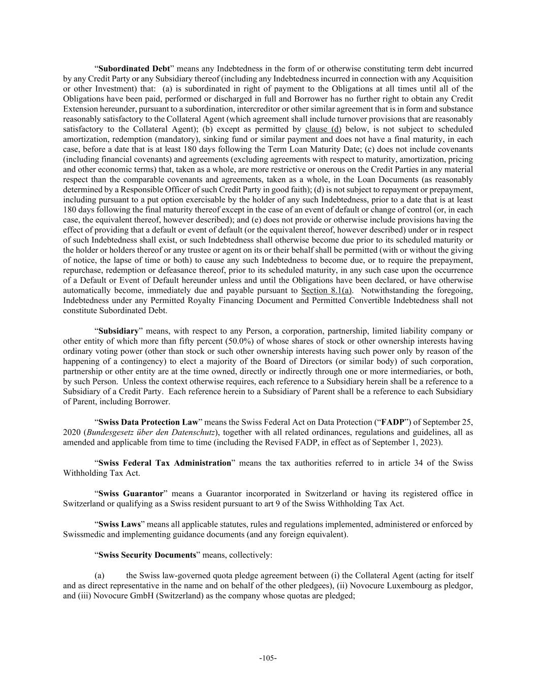 -105- “Subordinated Debt” means any Indebtedness in the form of or otherwise constituting term debt incurred by any Credit Party or any Subsidiary thereof (including any Indebtedness incurred in connection with any Acquisition or other Investment) that: (a) is subordinated in right of payment to the Obligations at all times until all of the Obligations have been paid, performed or discharged in full and Borrower has no further right to obtain any Credit Extension hereunder, pursuant to a subordination, intercreditor or other similar agreement that is in form and substance reasonably satisfactory to the Collateral Agent (which agreement shall include turnover provisions that are reasonably satisfactory to the Collateral Agent); (b) except as permitted by clause (d) below, is not subject to scheduled amortization, redemption (mandatory), sinking fund or similar payment and does not have a final maturity, in each case, before a date that is at least 180 days following the Term Loan Maturity Date; (c) does not include covenants (including financial covenants) and agreements (excluding agreements with respect to maturity, amortization, pricing and other economic terms) that, taken as a whole, are more restrictive or onerous on the Credit Parties in any material respect than the comparable covenants and agreements, taken as a whole, in the Loan Documents (as reasonably determined by a Responsible Officer of such Credit Party in good faith); (d) is not subject to repayment or prepayment, including pursuant to a put option exercisable by the holder of any such Indebtedness, prior to a date that is at least 180 days following the final maturity thereof except in the case of an event of default or change of control (or, in each case, the equivalent thereof, however described); and (e) does not provide or otherwise include provisions having the effect of providing that a default or event of default (or the equivalent thereof, however described) under or in respect of such Indebtedness shall exist, or such Indebtedness shall otherwise become due prior to its scheduled maturity or the holder or holders thereof or any trustee or agent on its or their behalf shall be permitted (with or without the giving of notice, the lapse of time or both) to cause any such Indebtedness to become due, or to require the prepayment, repurchase, redemption or defeasance thereof, prior to its scheduled maturity, in any such case upon the occurrence of a Default or Event of Default hereunder unless and until the Obligations have been declared, or have otherwise automatically become, immediately due and payable pursuant to Section 8.1(a). Notwithstanding the foregoing, Indebtedness under any Permitted Royalty Financing Document and Permitted Convertible Indebtedness shall not constitute Subordinated Debt. “Subsidiary” means, with respect to any Person, a corporation, partnership, limited liability company or other entity of which more than fifty percent (50.0%) of whose shares of stock or other ownership interests having ordinary voting power (other than stock or such other ownership interests having such power only by reason of the happening of a contingency) to elect a majority of the Board of Directors (or similar body) of such corporation, partnership or other entity are at the time owned, directly or indirectly through one or more intermediaries, or both, by such Person. Unless the context otherwise requires, each reference to a Subsidiary herein shall be a reference to a Subsidiary of a Credit Party. Each reference herein to a Subsidiary of Parent shall be a reference to each Subsidiary of Parent, including Borrower. “Swiss Data Protection Law” means the Swiss Federal Act on Data Protection (“FADP”) of September 25, 2020 (Bundesgesetz über den Datenschutz), together with all related ordinances, regulations and guidelines, all as amended and applicable from time to time (including the Revised FADP, in effect as of September 1, 2023). “Swiss Federal Tax Administration” means the tax authorities referred to in article 34 of the Swiss Withholding Tax Act. “Swiss Guarantor” means a Guarantor incorporated in Switzerland or having its registered office in Switzerland or qualifying as a Swiss resident pursuant to art 9 of the Swiss Withholding Tax Act. “Swiss Laws” means all applicable statutes, rules and regulations implemented, administered or enforced by Swissmedic and implementing guidance documents (and any foreign equivalent). “Swiss Security Documents” means, collectively: (a) the Swiss law-governed quota pledge agreement between (i) the Collateral Agent (acting for itself and as direct representative in the name and on behalf of the other pledgees), (ii) Novocure Luxembourg as pledgor, and (iii) Novocure GmbH (Switzerland) as the company whose quotas are pledged;