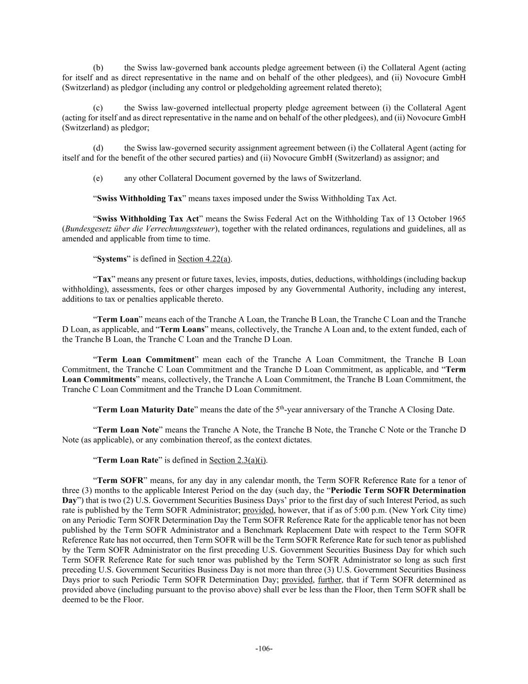 -106- (b) the Swiss law-governed bank accounts pledge agreement between (i) the Collateral Agent (acting for itself and as direct representative in the name and on behalf of the other pledgees), and (ii) Novocure GmbH (Switzerland) as pledgor (including any control or pledgeholding agreement related thereto); (c) the Swiss law-governed intellectual property pledge agreement between (i) the Collateral Agent (acting for itself and as direct representative in the name and on behalf of the other pledgees), and (ii) Novocure GmbH (Switzerland) as pledgor; (d) the Swiss law-governed security assignment agreement between (i) the Collateral Agent (acting for itself and for the benefit of the other secured parties) and (ii) Novocure GmbH (Switzerland) as assignor; and (e) any other Collateral Document governed by the laws of Switzerland. “Swiss Withholding Tax” means taxes imposed under the Swiss Withholding Tax Act. “Swiss Withholding Tax Act” means the Swiss Federal Act on the Withholding Tax of 13 October 1965 (Bundesgesetz über die Verrechnungssteuer), together with the related ordinances, regulations and guidelines, all as amended and applicable from time to time. “Systems” is defined in Section 4.22(a). “Tax” means any present or future taxes, levies, imposts, duties, deductions, withholdings (including backup withholding), assessments, fees or other charges imposed by any Governmental Authority, including any interest, additions to tax or penalties applicable thereto. “Term Loan” means each of the Tranche A Loan, the Tranche B Loan, the Tranche C Loan and the Tranche D Loan, as applicable, and “Term Loans” means, collectively, the Tranche A Loan and, to the extent funded, each of the Tranche B Loan, the Tranche C Loan and the Tranche D Loan. “Term Loan Commitment” mean each of the Tranche A Loan Commitment, the Tranche B Loan Commitment, the Tranche C Loan Commitment and the Tranche D Loan Commitment, as applicable, and “Term Loan Commitments” means, collectively, the Tranche A Loan Commitment, the Tranche B Loan Commitment, the Tranche C Loan Commitment and the Tranche D Loan Commitment. “Term Loan Maturity Date” means the date of the 5th-year anniversary of the Tranche A Closing Date. “Term Loan Note” means the Tranche A Note, the Tranche B Note, the Tranche C Note or the Tranche D Note (as applicable), or any combination thereof, as the context dictates. “Term Loan Rate” is defined in Section 2.3(a)(i). “Term SOFR” means, for any day in any calendar month, the Term SOFR Reference Rate for a tenor of three (3) months to the applicable Interest Period on the day (such day, the “Periodic Term SOFR Determination Day”) that is two (2) U.S. Government Securities Business Days’ prior to the first day of such Interest Period, as such rate is published by the Term SOFR Administrator; provided, however, that if as of 5:00 p.m. (New York City time) on any Periodic Term SOFR Determination Day the Term SOFR Reference Rate for the applicable tenor has not been published by the Term SOFR Administrator and a Benchmark Replacement Date with respect to the Term SOFR Reference Rate has not occurred, then Term SOFR will be the Term SOFR Reference Rate for such tenor as published by the Term SOFR Administrator on the first preceding U.S. Government Securities Business Day for which such Term SOFR Reference Rate for such tenor was published by the Term SOFR Administrator so long as such first preceding U.S. Government Securities Business Day is not more than three (3) U.S. Government Securities Business Days prior to such Periodic Term SOFR Determination Day; provided, further, that if Term SOFR determined as provided above (including pursuant to the proviso above) shall ever be less than the Floor, then Term SOFR shall be deemed to be the Floor.