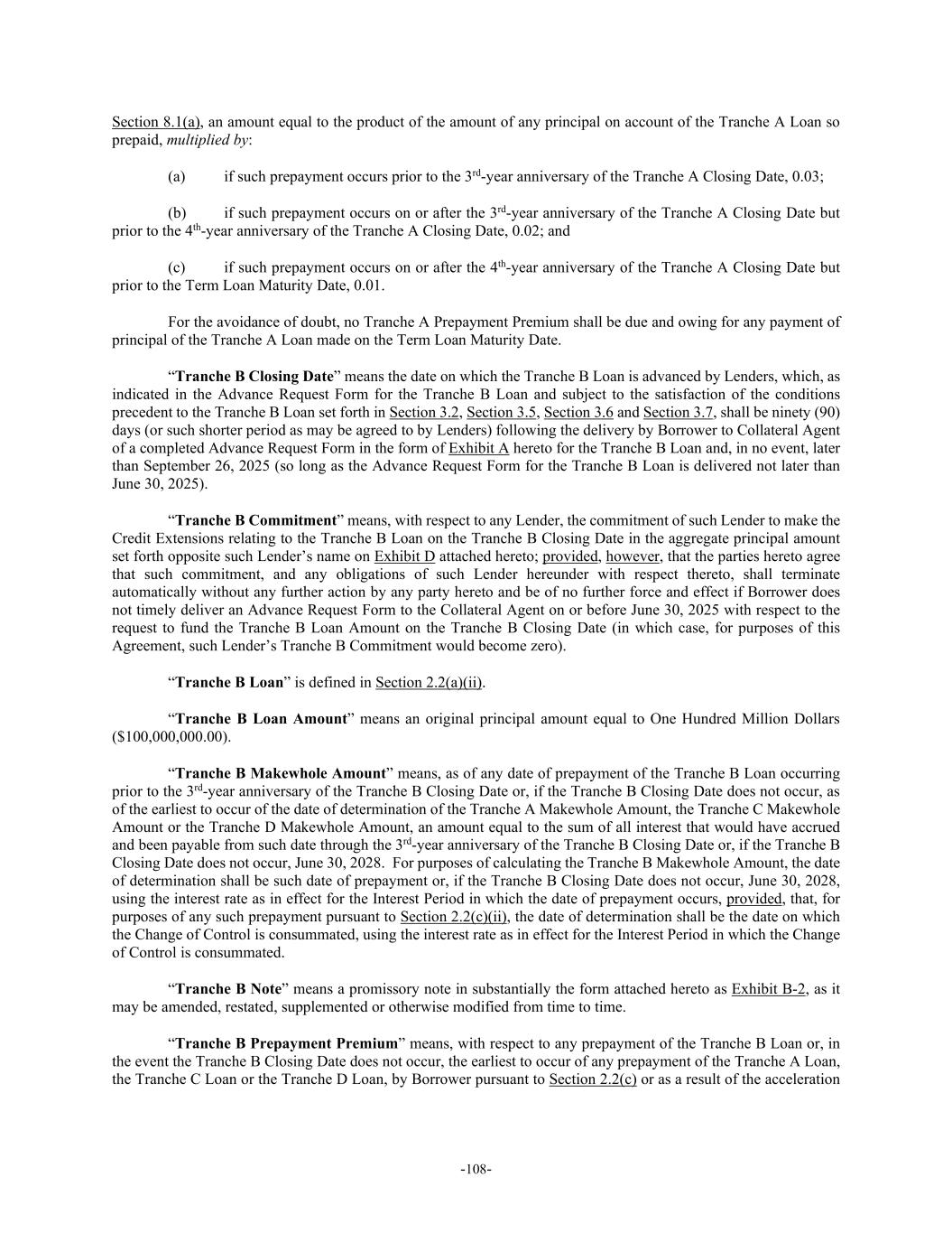 -108- Section 8.1(a), an amount equal to the product of the amount of any principal on account of the Tranche A Loan so prepaid, multiplied by: (a) if such prepayment occurs prior to the 3rd-year anniversary of the Tranche A Closing Date, 0.03; (b) if such prepayment occurs on or after the 3rd-year anniversary of the Tranche A Closing Date but prior to the 4th-year anniversary of the Tranche A Closing Date, 0.02; and (c) if such prepayment occurs on or after the 4th-year anniversary of the Tranche A Closing Date but prior to the Term Loan Maturity Date, 0.01. For the avoidance of doubt, no Tranche A Prepayment Premium shall be due and owing for any payment of principal of the Tranche A Loan made on the Term Loan Maturity Date. “Tranche B Closing Date” means the date on which the Tranche B Loan is advanced by Lenders, which, as indicated in the Advance Request Form for the Tranche B Loan and subject to the satisfaction of the conditions precedent to the Tranche B Loan set forth in Section 3.2, Section 3.5, Section 3.6 and Section 3.7, shall be ninety (90) days (or such shorter period as may be agreed to by Lenders) following the delivery by Borrower to Collateral Agent of a completed Advance Request Form in the form of Exhibit A hereto for the Tranche B Loan and, in no event, later than September 26, 2025 (so long as the Advance Request Form for the Tranche B Loan is delivered not later than June 30, 2025). “Tranche B Commitment” means, with respect to any Lender, the commitment of such Lender to make the Credit Extensions relating to the Tranche B Loan on the Tranche B Closing Date in the aggregate principal amount set forth opposite such Lender’s name on Exhibit D attached hereto; provided, however, that the parties hereto agree that such commitment, and any obligations of such Lender hereunder with respect thereto, shall terminate automatically without any further action by any party hereto and be of no further force and effect if Borrower does not timely deliver an Advance Request Form to the Collateral Agent on or before June 30, 2025 with respect to the request to fund the Tranche B Loan Amount on the Tranche B Closing Date (in which case, for purposes of this Agreement, such Lender’s Tranche B Commitment would become zero). “Tranche B Loan” is defined in Section 2.2(a)(ii). “Tranche B Loan Amount” means an original principal amount equal to One Hundred Million Dollars ($100,000,000.00). “Tranche B Makewhole Amount” means, as of any date of prepayment of the Tranche B Loan occurring prior to the 3rd-year anniversary of the Tranche B Closing Date or, if the Tranche B Closing Date does not occur, as of the earliest to occur of the date of determination of the Tranche A Makewhole Amount, the Tranche C Makewhole Amount or the Tranche D Makewhole Amount, an amount equal to the sum of all interest that would have accrued and been payable from such date through the 3rd-year anniversary of the Tranche B Closing Date or, if the Tranche B Closing Date does not occur, June 30, 2028. For purposes of calculating the Tranche B Makewhole Amount, the date of determination shall be such date of prepayment or, if the Tranche B Closing Date does not occur, June 30, 2028, using the interest rate as in effect for the Interest Period in which the date of prepayment occurs, provided, that, for purposes of any such prepayment pursuant to Section 2.2(c)(ii), the date of determination shall be the date on which the Change of Control is consummated, using the interest rate as in effect for the Interest Period in which the Change of Control is consummated. “Tranche B Note” means a promissory note in substantially the form attached hereto as Exhibit B-2, as it may be amended, restated, supplemented or otherwise modified from time to time. “Tranche B Prepayment Premium” means, with respect to any prepayment of the Tranche B Loan or, in the event the Tranche B Closing Date does not occur, the earliest to occur of any prepayment of the Tranche A Loan, the Tranche C Loan or the Tranche D Loan, by Borrower pursuant to Section 2.2(c) or as a result of the acceleration