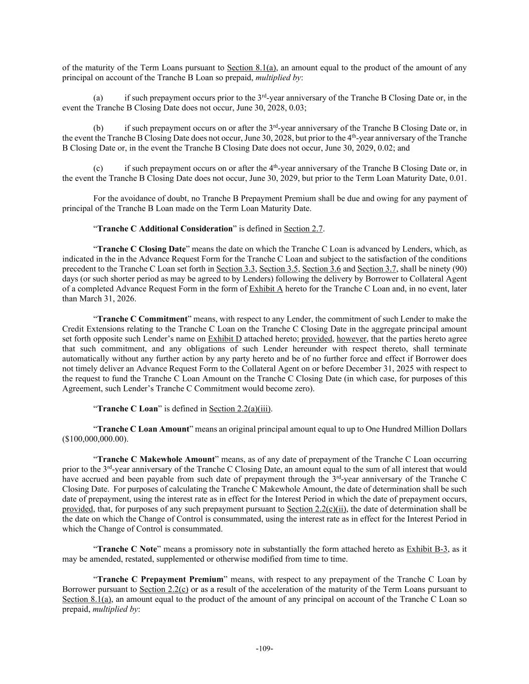 -109- of the maturity of the Term Loans pursuant to Section 8.1(a), an amount equal to the product of the amount of any principal on account of the Tranche B Loan so prepaid, multiplied by: (a) if such prepayment occurs prior to the 3rd-year anniversary of the Tranche B Closing Date or, in the event the Tranche B Closing Date does not occur, June 30, 2028, 0.03; (b) if such prepayment occurs on or after the 3rd-year anniversary of the Tranche B Closing Date or, in the event the Tranche B Closing Date does not occur, June 30, 2028, but prior to the 4th-year anniversary of the Tranche B Closing Date or, in the event the Tranche B Closing Date does not occur, June 30, 2029, 0.02; and (c) if such prepayment occurs on or after the 4th-year anniversary of the Tranche B Closing Date or, in the event the Tranche B Closing Date does not occur, June 30, 2029, but prior to the Term Loan Maturity Date, 0.01. For the avoidance of doubt, no Tranche B Prepayment Premium shall be due and owing for any payment of principal of the Tranche B Loan made on the Term Loan Maturity Date. “Tranche C Additional Consideration” is defined in Section 2.7. “Tranche C Closing Date” means the date on which the Tranche C Loan is advanced by Lenders, which, as indicated in the in the Advance Request Form for the Tranche C Loan and subject to the satisfaction of the conditions precedent to the Tranche C Loan set forth in Section 3.3, Section 3.5, Section 3.6 and Section 3.7, shall be ninety (90) days (or such shorter period as may be agreed to by Lenders) following the delivery by Borrower to Collateral Agent of a completed Advance Request Form in the form of Exhibit A hereto for the Tranche C Loan and, in no event, later than March 31, 2026. “Tranche C Commitment” means, with respect to any Lender, the commitment of such Lender to make the Credit Extensions relating to the Tranche C Loan on the Tranche C Closing Date in the aggregate principal amount set forth opposite such Lender’s name on Exhibit D attached hereto; provided, however, that the parties hereto agree that such commitment, and any obligations of such Lender hereunder with respect thereto, shall terminate automatically without any further action by any party hereto and be of no further force and effect if Borrower does not timely deliver an Advance Request Form to the Collateral Agent on or before December 31, 2025 with respect to the request to fund the Tranche C Loan Amount on the Tranche C Closing Date (in which case, for purposes of this Agreement, such Lender’s Tranche C Commitment would become zero). “Tranche C Loan” is defined in Section 2.2(a)(iii). “Tranche C Loan Amount” means an original principal amount equal to up to One Hundred Million Dollars ($100,000,000.00). “Tranche C Makewhole Amount” means, as of any date of prepayment of the Tranche C Loan occurring prior to the 3rd-year anniversary of the Tranche C Closing Date, an amount equal to the sum of all interest that would have accrued and been payable from such date of prepayment through the 3rd-year anniversary of the Tranche C Closing Date. For purposes of calculating the Tranche C Makewhole Amount, the date of determination shall be such date of prepayment, using the interest rate as in effect for the Interest Period in which the date of prepayment occurs, provided, that, for purposes of any such prepayment pursuant to Section 2.2(c)(ii), the date of determination shall be the date on which the Change of Control is consummated, using the interest rate as in effect for the Interest Period in which the Change of Control is consummated. “Tranche C Note” means a promissory note in substantially the form attached hereto as Exhibit B-3, as it may be amended, restated, supplemented or otherwise modified from time to time. “Tranche C Prepayment Premium” means, with respect to any prepayment of the Tranche C Loan by Borrower pursuant to Section 2.2(c) or as a result of the acceleration of the maturity of the Term Loans pursuant to Section 8.1(a), an amount equal to the product of the amount of any principal on account of the Tranche C Loan so prepaid, multiplied by:
