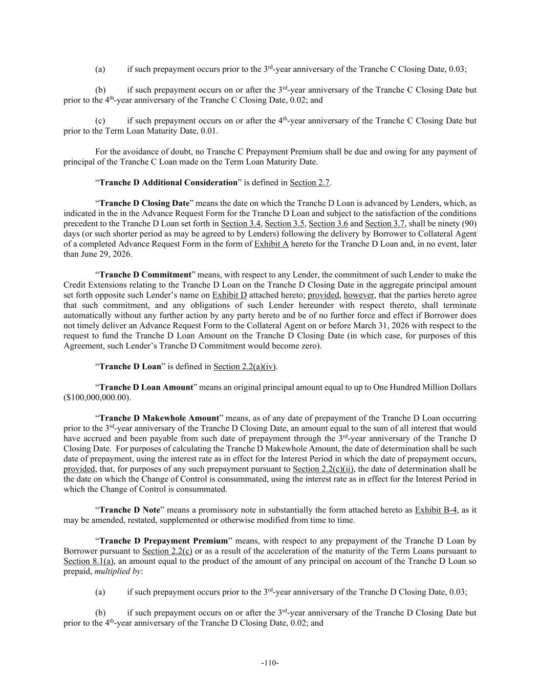 -110- (a) if such prepayment occurs prior to the 3rd-year anniversary of the Tranche C Closing Date, 0.03; (b) if such prepayment occurs on or after the 3rd-year anniversary of the Tranche C Closing Date but prior to the 4th-year anniversary of the Tranche C Closing Date, 0.02; and (c) if such prepayment occurs on or after the 4th-year anniversary of the Tranche C Closing Date but prior to the Term Loan Maturity Date, 0.01. For the avoidance of doubt, no Tranche C Prepayment Premium shall be due and owing for any payment of principal of the Tranche C Loan made on the Term Loan Maturity Date. “Tranche D Additional Consideration” is defined in Section 2.7. “Tranche D Closing Date” means the date on which the Tranche D Loan is advanced by Lenders, which, as indicated in the in the Advance Request Form for the Tranche D Loan and subject to the satisfaction of the conditions precedent to the Tranche D Loan set forth in Section 3.4, Section 3.5, Section 3.6 and Section 3.7, shall be ninety (90) days (or such shorter period as may be agreed to by Lenders) following the delivery by Borrower to Collateral Agent of a completed Advance Request Form in the form of Exhibit A hereto for the Tranche D Loan and, in no event, later than June 29, 2026. “Tranche D Commitment” means, with respect to any Lender, the commitment of such Lender to make the Credit Extensions relating to the Tranche D Loan on the Tranche D Closing Date in the aggregate principal amount set forth opposite such Lender’s name on Exhibit D attached hereto; provided, however, that the parties hereto agree that such commitment, and any obligations of such Lender hereunder with respect thereto, shall terminate automatically without any further action by any party hereto and be of no further force and effect if Borrower does not timely deliver an Advance Request Form to the Collateral Agent on or before March 31, 2026 with respect to the request to fund the Tranche D Loan Amount on the Tranche D Closing Date (in which case, for purposes of this Agreement, such Lender’s Tranche D Commitment would become zero). “Tranche D Loan” is defined in Section 2.2(a)(iv). “Tranche D Loan Amount” means an original principal amount equal to up to One Hundred Million Dollars ($100,000,000.00). “Tranche D Makewhole Amount” means, as of any date of prepayment of the Tranche D Loan occurring prior to the 3rd-year anniversary of the Tranche D Closing Date, an amount equal to the sum of all interest that would have accrued and been payable from such date of prepayment through the 3rd-year anniversary of the Tranche D Closing Date. For purposes of calculating the Tranche D Makewhole Amount, the date of determination shall be such date of prepayment, using the interest rate as in effect for the Interest Period in which the date of prepayment occurs, provided, that, for purposes of any such prepayment pursuant to Section 2.2(c)(ii), the date of determination shall be the date on which the Change of Control is consummated, using the interest rate as in effect for the Interest Period in which the Change of Control is consummated. “Tranche D Note” means a promissory note in substantially the form attached hereto as Exhibit B-4, as it may be amended, restated, supplemented or otherwise modified from time to time. “Tranche D Prepayment Premium” means, with respect to any prepayment of the Tranche D Loan by Borrower pursuant to Section 2.2(c) or as a result of the acceleration of the maturity of the Term Loans pursuant to Section 8.1(a), an amount equal to the product of the amount of any principal on account of the Tranche D Loan so prepaid, multiplied by: (a) if such prepayment occurs prior to the 3rd-year anniversary of the Tranche D Closing Date, 0.03; (b) if such prepayment occurs on or after the 3rd-year anniversary of the Tranche D Closing Date but prior to the 4th-year anniversary of the Tranche D Closing Date, 0.02; and
