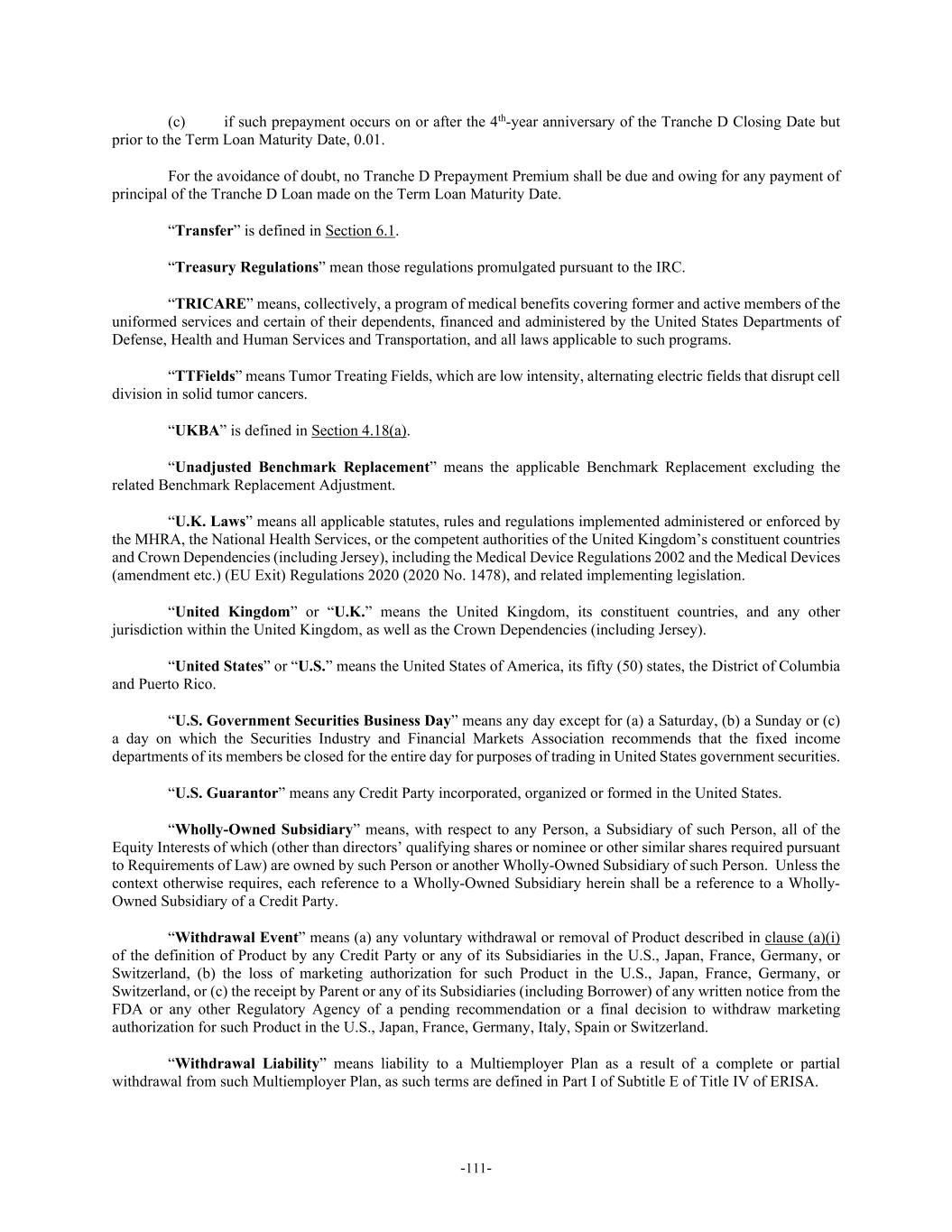 -111- (c) if such prepayment occurs on or after the 4th-year anniversary of the Tranche D Closing Date but prior to the Term Loan Maturity Date, 0.01. For the avoidance of doubt, no Tranche D Prepayment Premium shall be due and owing for any payment of principal of the Tranche D Loan made on the Term Loan Maturity Date. “Transfer” is defined in Section 6.1. “Treasury Regulations” mean those regulations promulgated pursuant to the IRC. “TRICARE” means, collectively, a program of medical benefits covering former and active members of the uniformed services and certain of their dependents, financed and administered by the United States Departments of Defense, Health and Human Services and Transportation, and all laws applicable to such programs. “TTFields” means Tumor Treating Fields, which are low intensity, alternating electric fields that disrupt cell division in solid tumor cancers. “UKBA” is defined in Section 4.18(a). “Unadjusted Benchmark Replacement” means the applicable Benchmark Replacement excluding the related Benchmark Replacement Adjustment. “U.K. Laws” means all applicable statutes, rules and regulations implemented administered or enforced by the MHRA, the National Health Services, or the competent authorities of the United Kingdom’s constituent countries and Crown Dependencies (including Jersey), including the Medical Device Regulations 2002 and the Medical Devices (amendment etc.) (EU Exit) Regulations 2020 (2020 No. 1478), and related implementing legislation. “United Kingdom” or “U.K.” means the United Kingdom, its constituent countries, and any other jurisdiction within the United Kingdom, as well as the Crown Dependencies (including Jersey). “United States” or “U.S.” means the United States of America, its fifty (50) states, the District of Columbia and Puerto Rico. “U.S. Government Securities Business Day” means any day except for (a) a Saturday, (b) a Sunday or (c) a day on which the Securities Industry and Financial Markets Association recommends that the fixed income departments of its members be closed for the entire day for purposes of trading in United States government securities. “U.S. Guarantor” means any Credit Party incorporated, organized or formed in the United States. “Wholly-Owned Subsidiary” means, with respect to any Person, a Subsidiary of such Person, all of the Equity Interests of which (other than directors’ qualifying shares or nominee or other similar shares required pursuant to Requirements of Law) are owned by such Person or another Wholly-Owned Subsidiary of such Person. Unless the context otherwise requires, each reference to a Wholly-Owned Subsidiary herein shall be a reference to a Wholly- Owned Subsidiary of a Credit Party. “Withdrawal Event” means (a) any voluntary withdrawal or removal of Product described in clause (a)(i) of the definition of Product by any Credit Party or any of its Subsidiaries in the U.S., Japan, France, Germany, or Switzerland, (b) the loss of marketing authorization for such Product in the U.S., Japan, France, Germany, or Switzerland, or (c) the receipt by Parent or any of its Subsidiaries (including Borrower) of any written notice from the FDA or any other Regulatory Agency of a pending recommendation or a final decision to withdraw marketing authorization for such Product in the U.S., Japan, France, Germany, Italy, Spain or Switzerland. “Withdrawal Liability” means liability to a Multiemployer Plan as a result of a complete or partial withdrawal from such Multiemployer Plan, as such terms are defined in Part I of Subtitle E of Title IV of ERISA.
